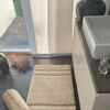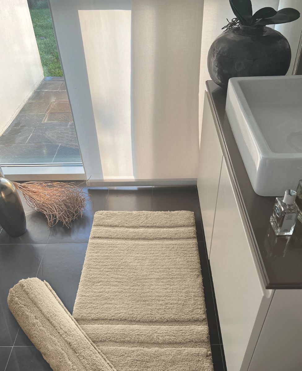 Bathmat super fluffy with jacquard pattern and rubberized backing for non-slip effect.