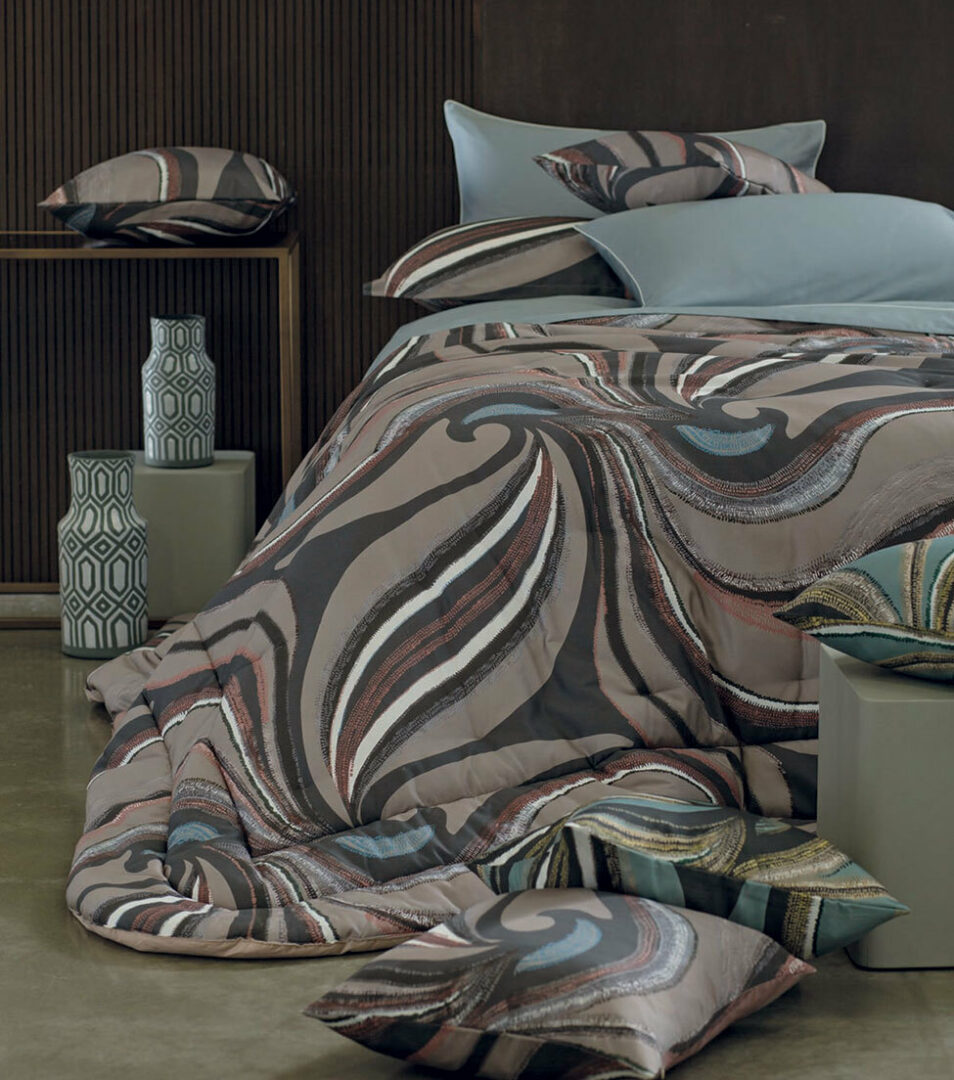 Comforter for double bed in cotton sateen with a printed pattern.