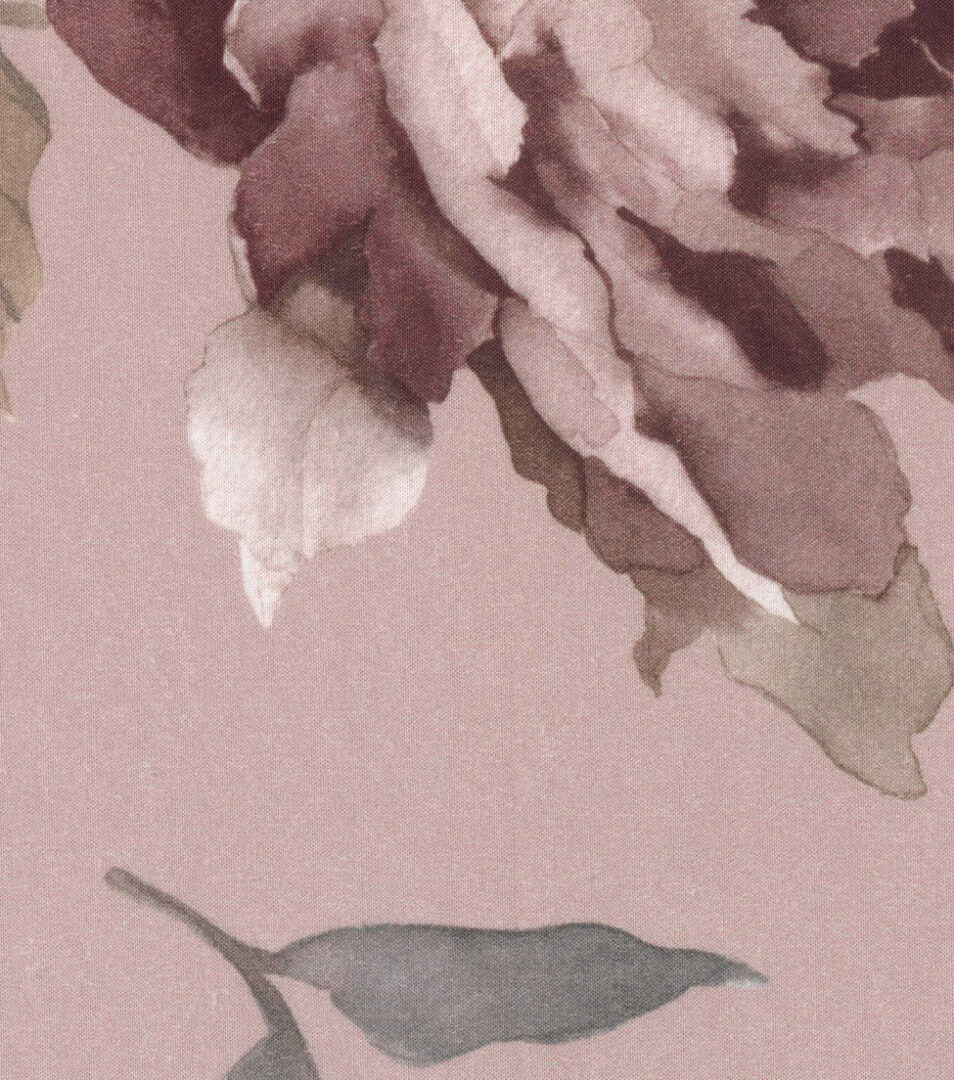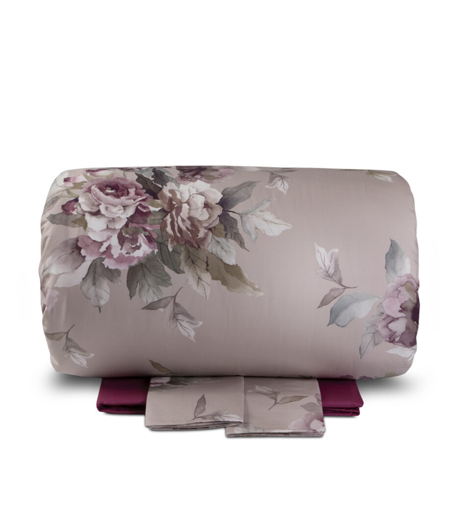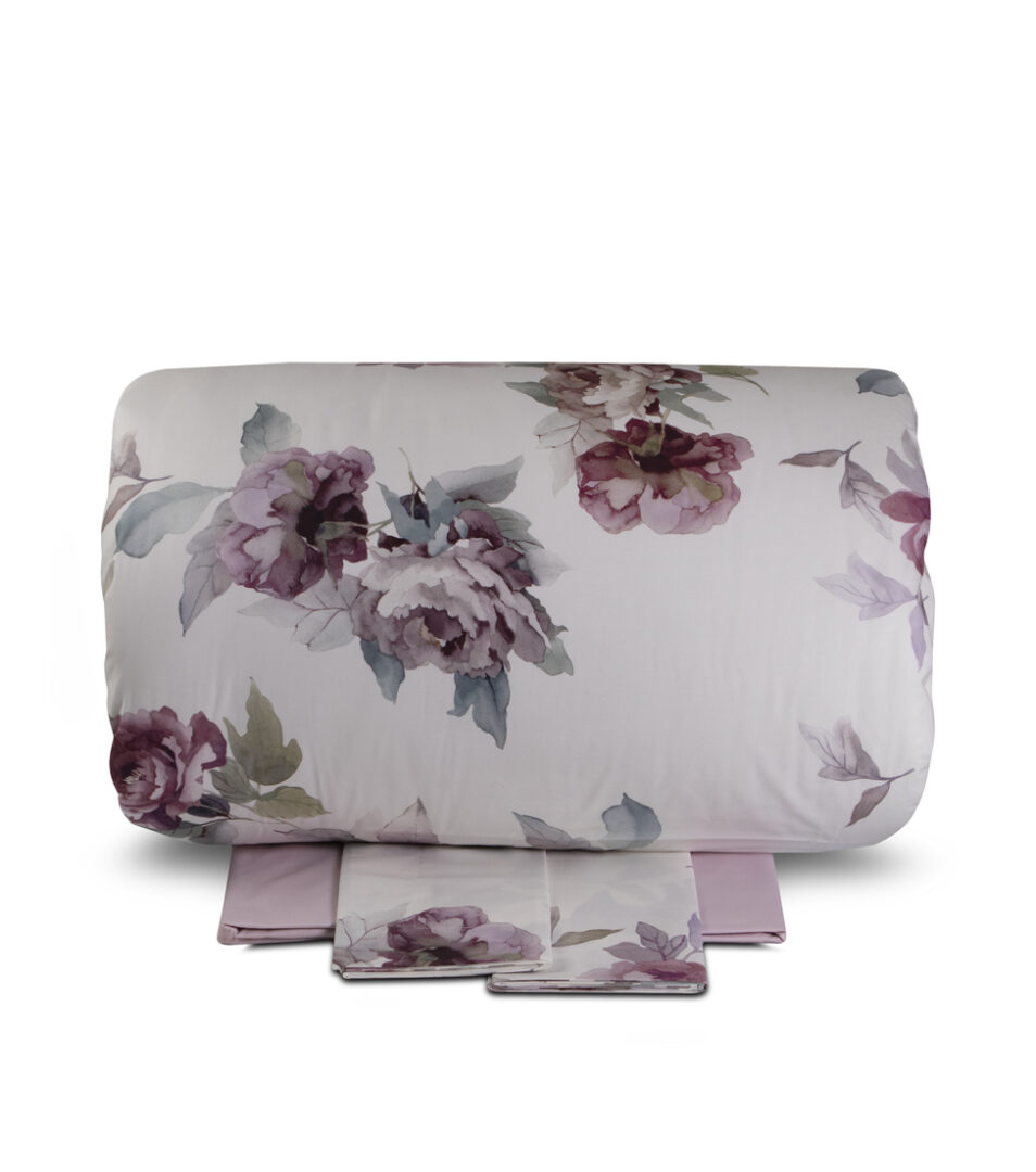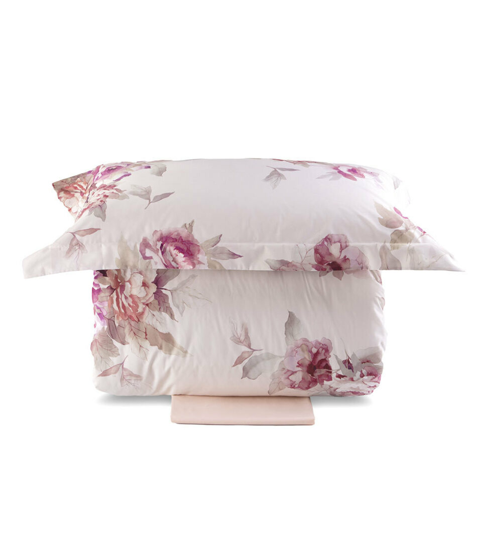 Duvet cover set for double bed with a classic floral printing on a light background, top side and pillow cases in printed fabric, bottom side and fitted sheet in solid cotton percale.