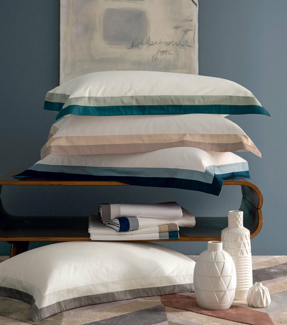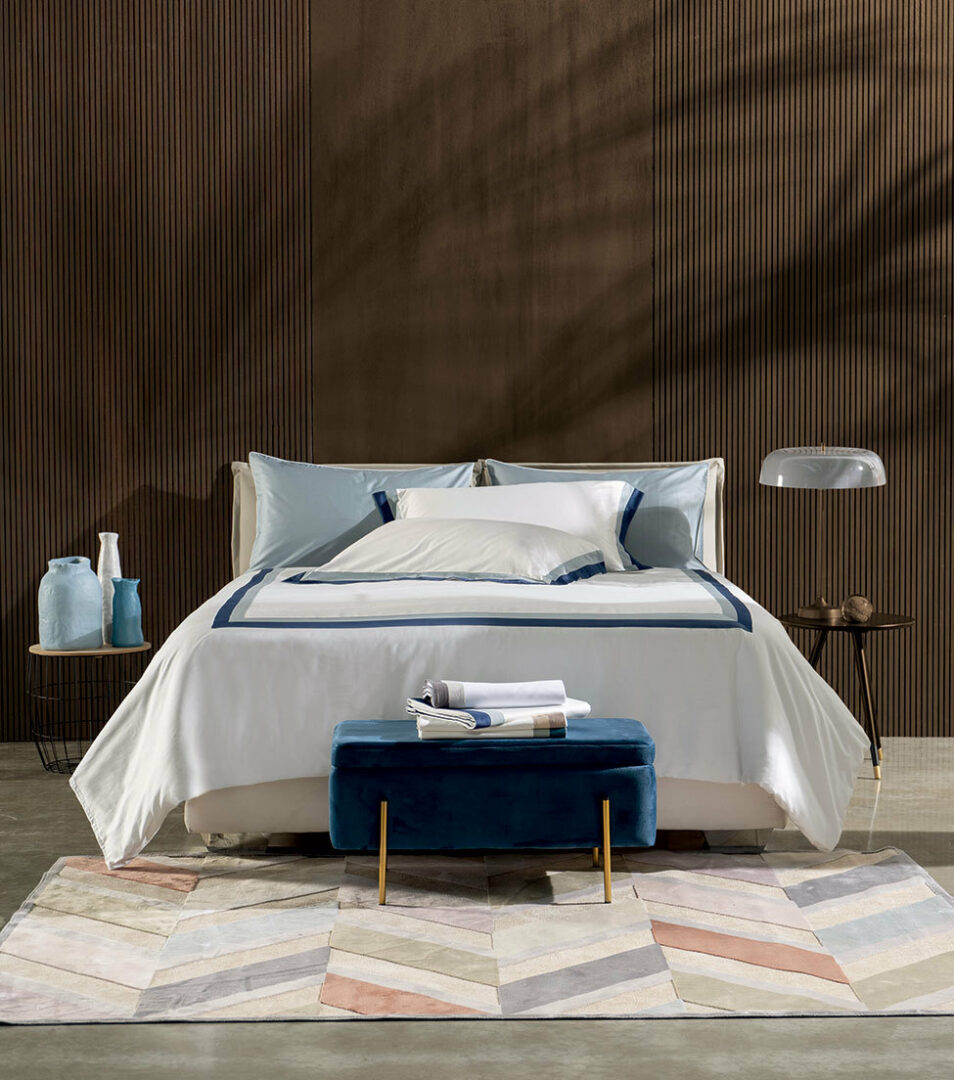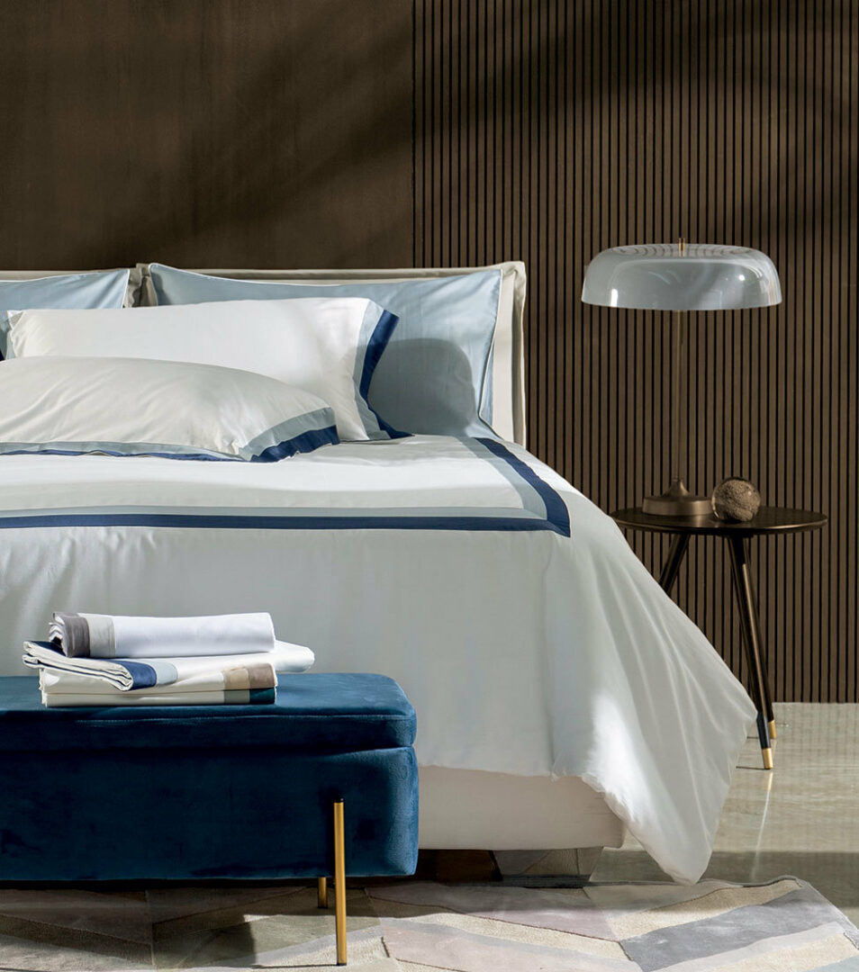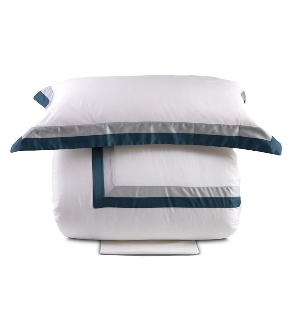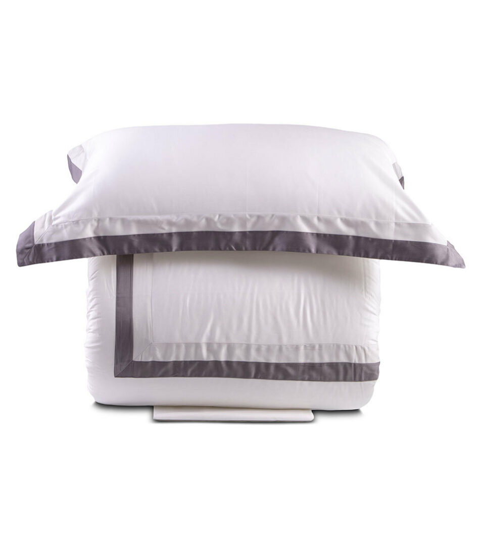 Duvet cover set for double bed in solid cotton sateen with double border on duvet cover and pillow cases, bottom side of duvet cover and bottom sheet in solid cotton sateen.