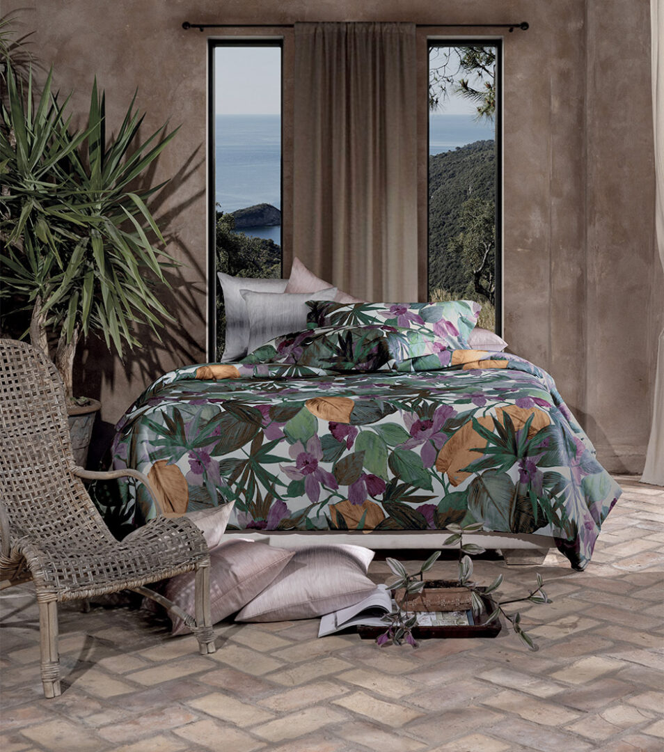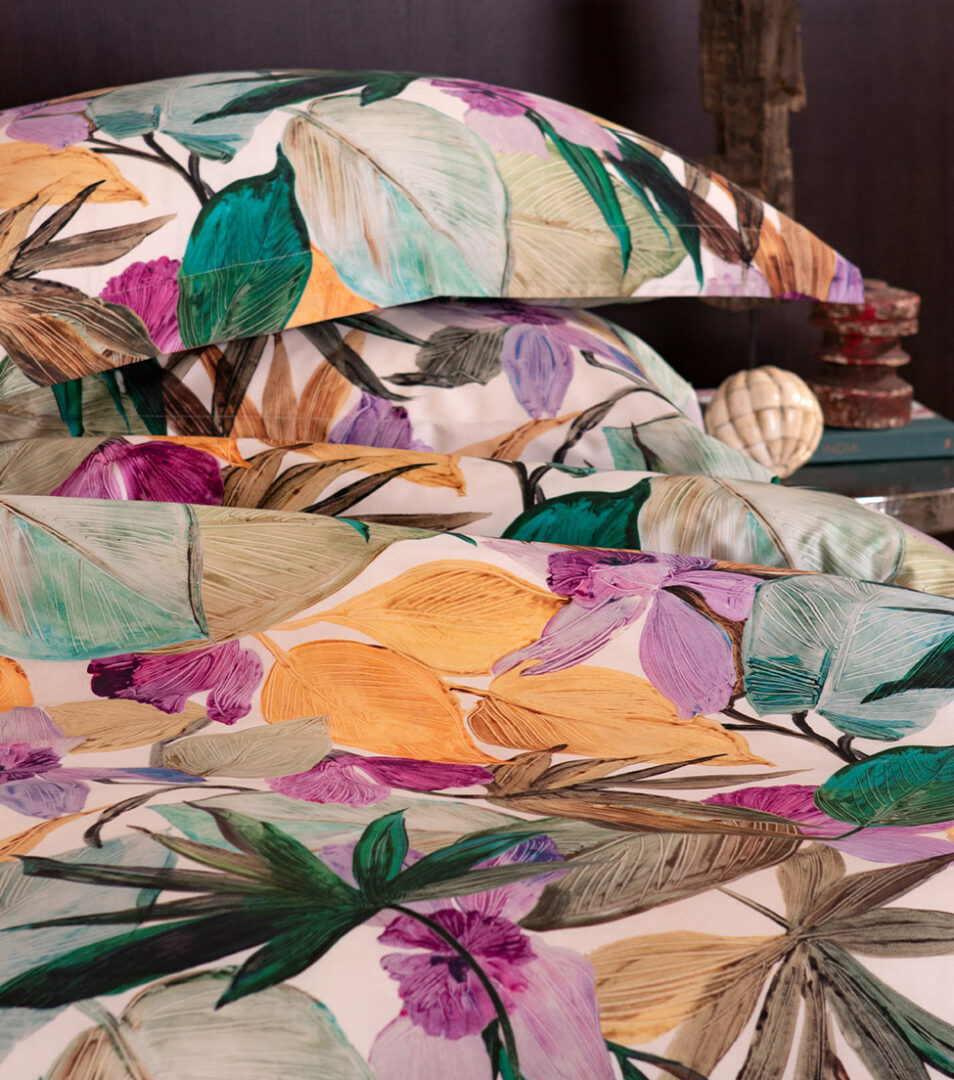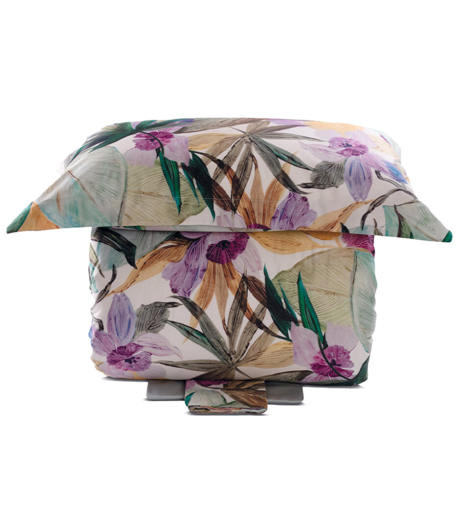 Duvet cover set for double bed in printed cotton sateen, bottom side and fitted sheet in solid cotton sateen.