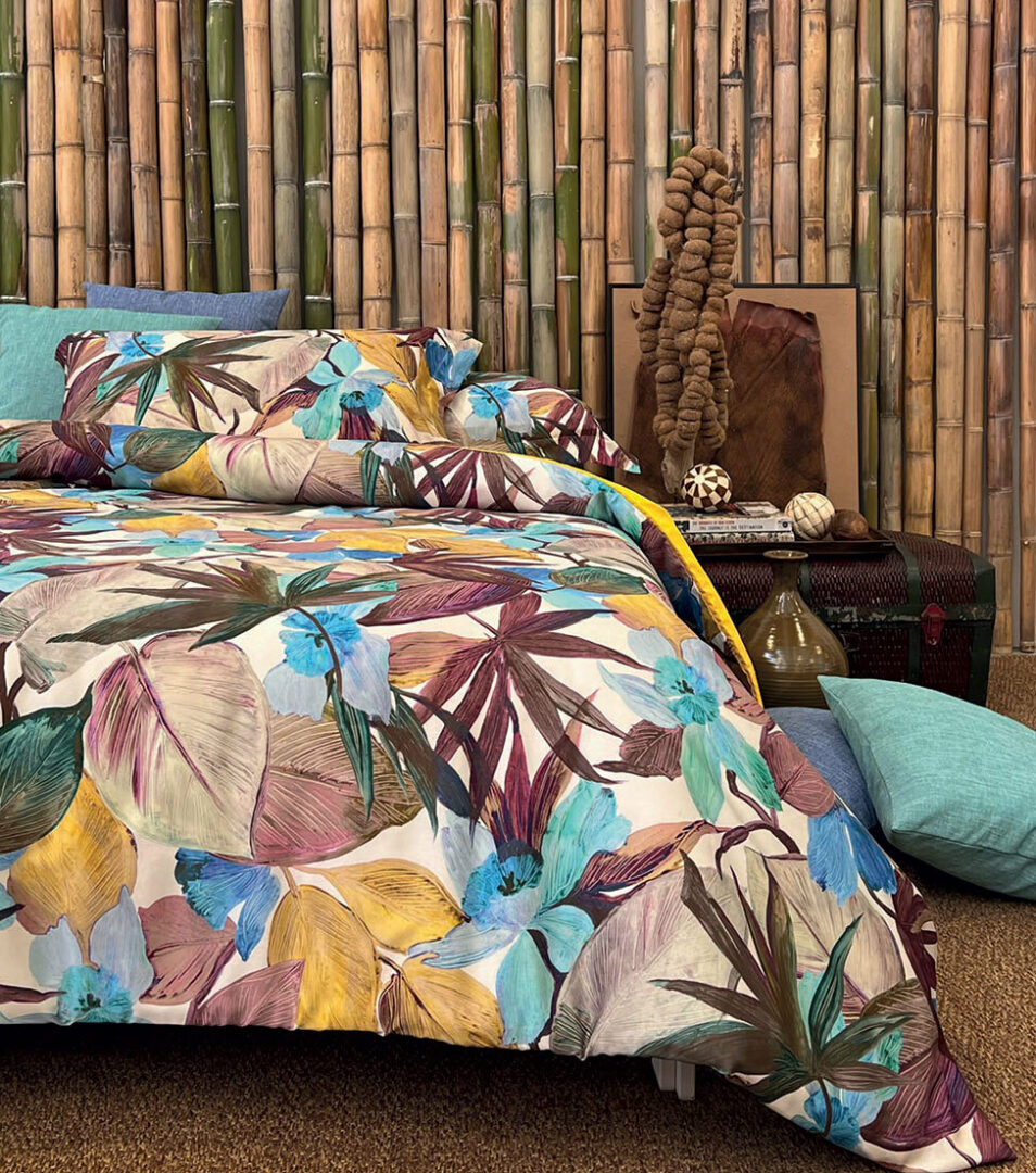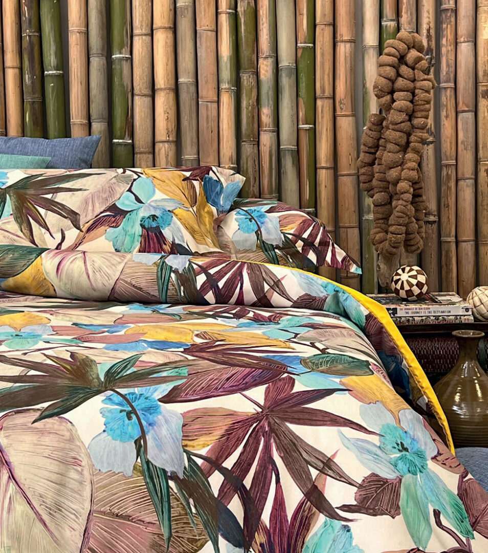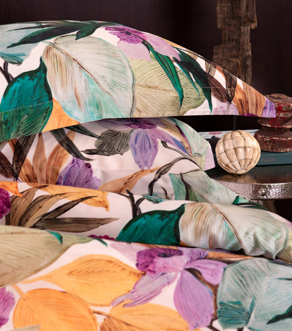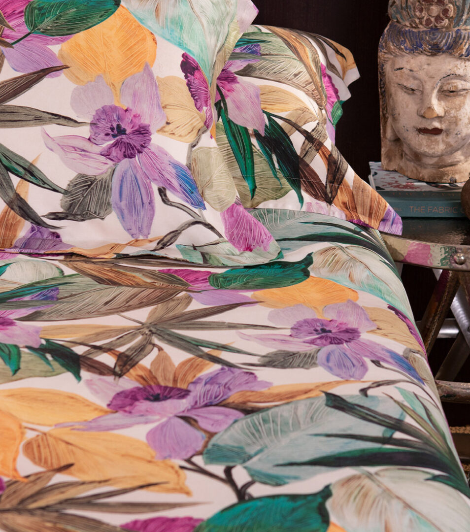 Duvet cover set for double bed in printed cotton sateen, bottom side and fitted sheet in solid cotton sateen.