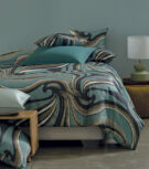 Duvet cover set for double bed in printed cotton sateen, bottom side and fitted sheet in solid cotton sateen.