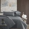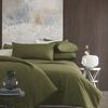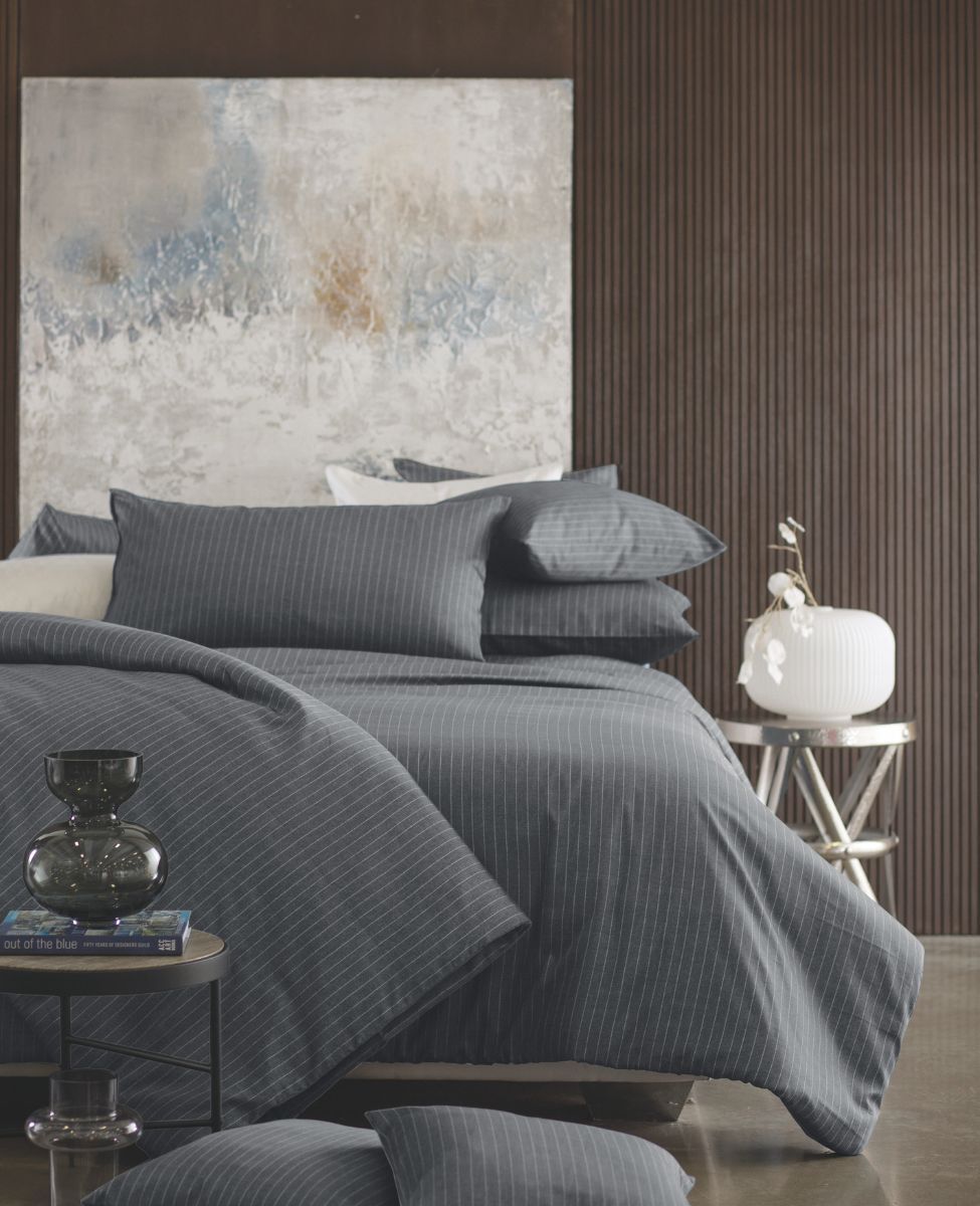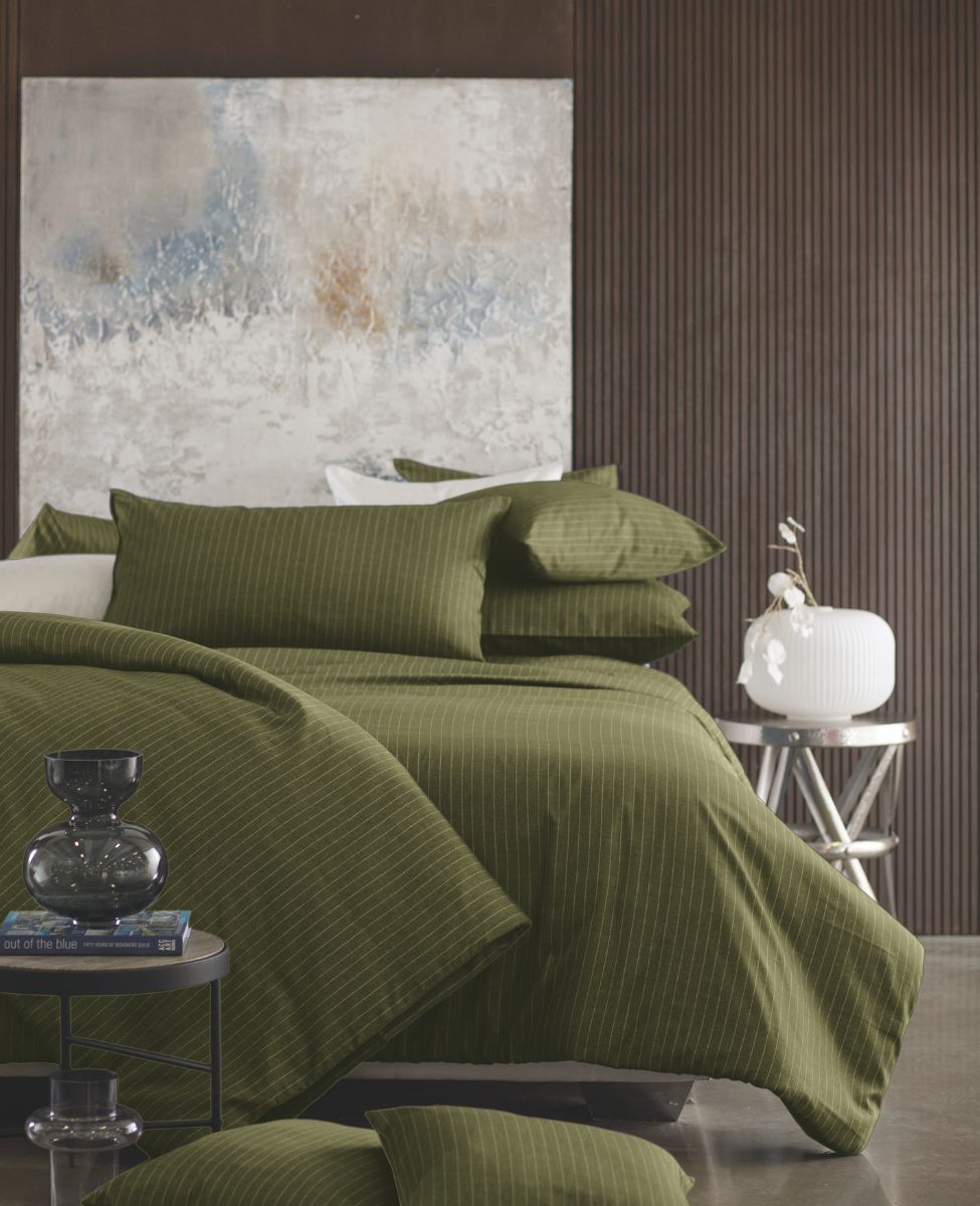 Duvet cover set for double bed in printed cotton sateen, bottom side printed and fitted sheet in solid cotton sateen.