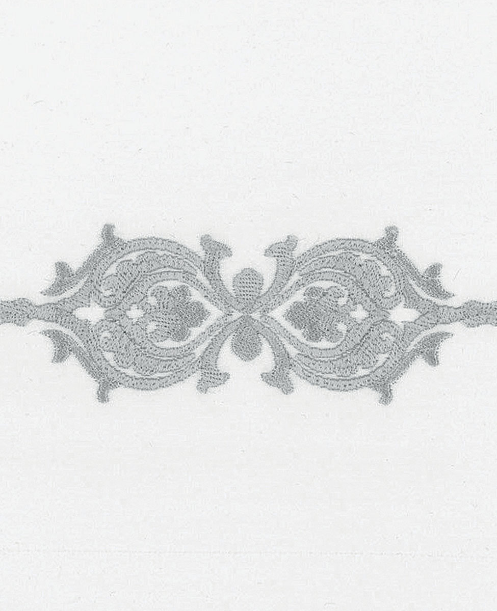 Duvet cover set for double bed in solid cotton sateen with centered embroidery on top sheet and pillowcases.