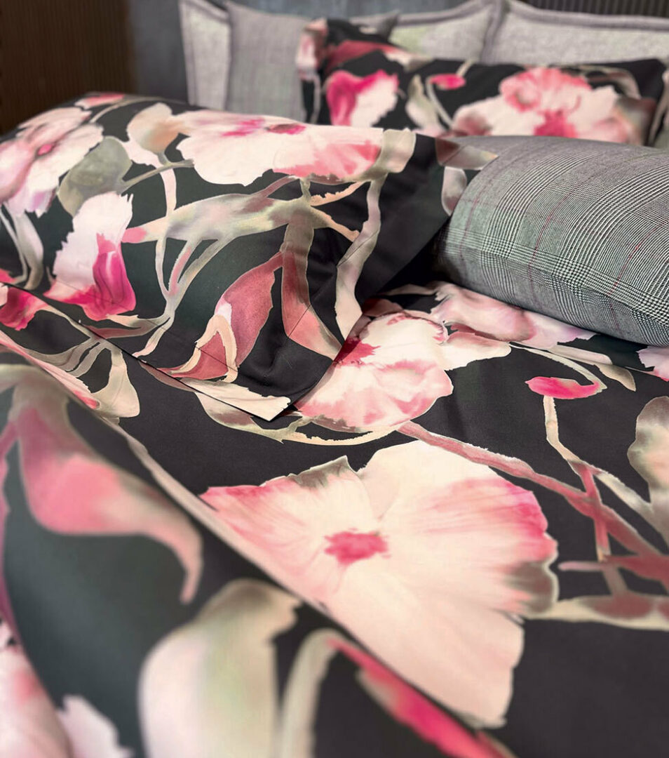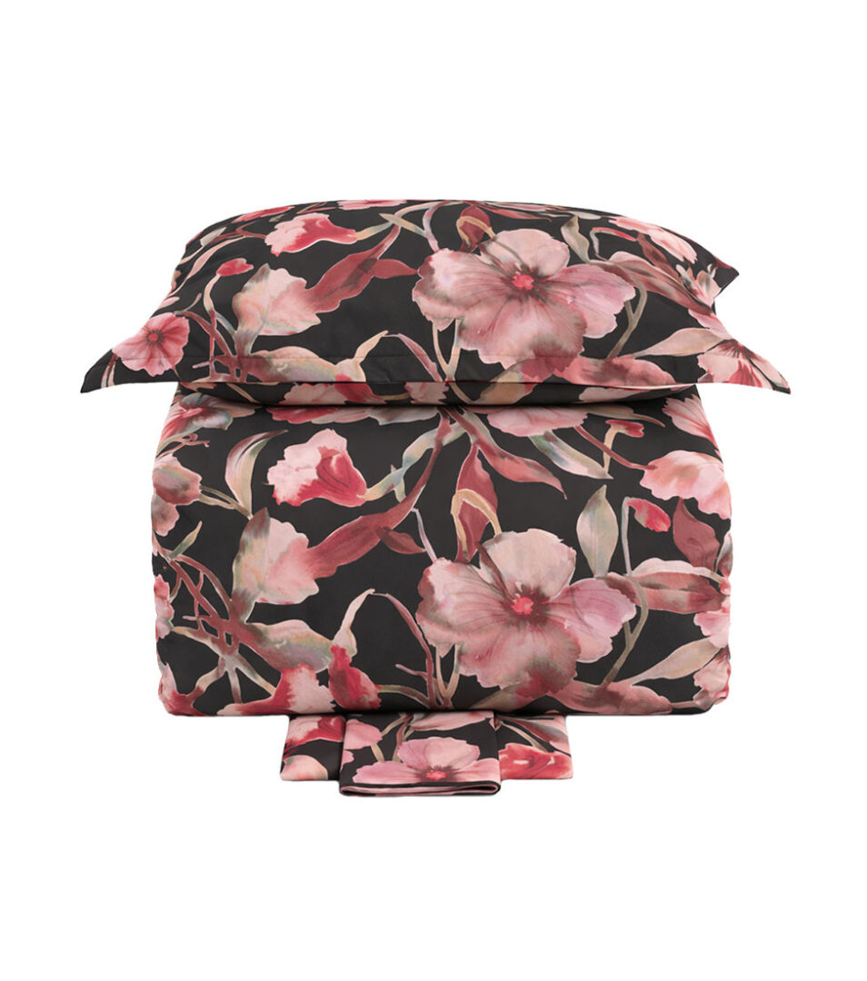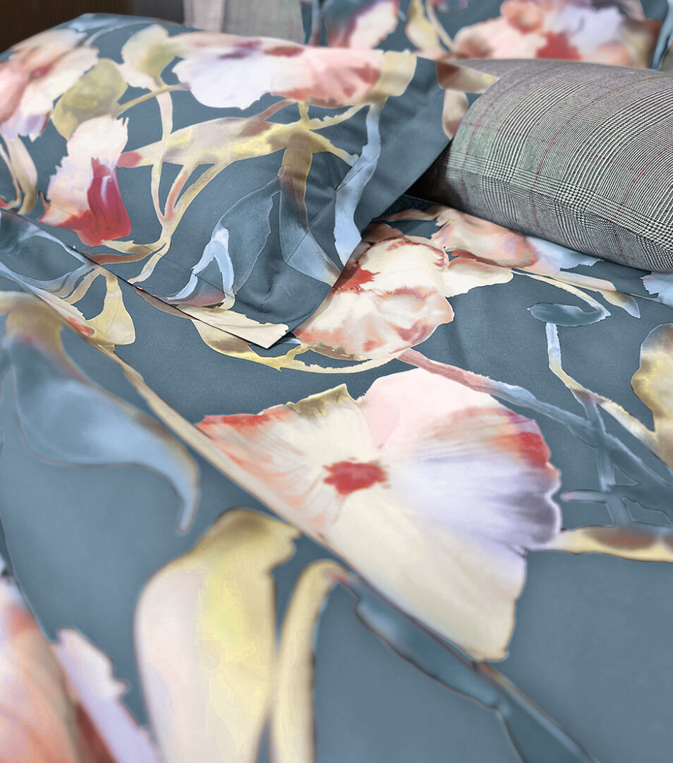 Duvet cover set for double bed in printed cotton sateen, bottom side and fitted sheet in solid cotton sateen.