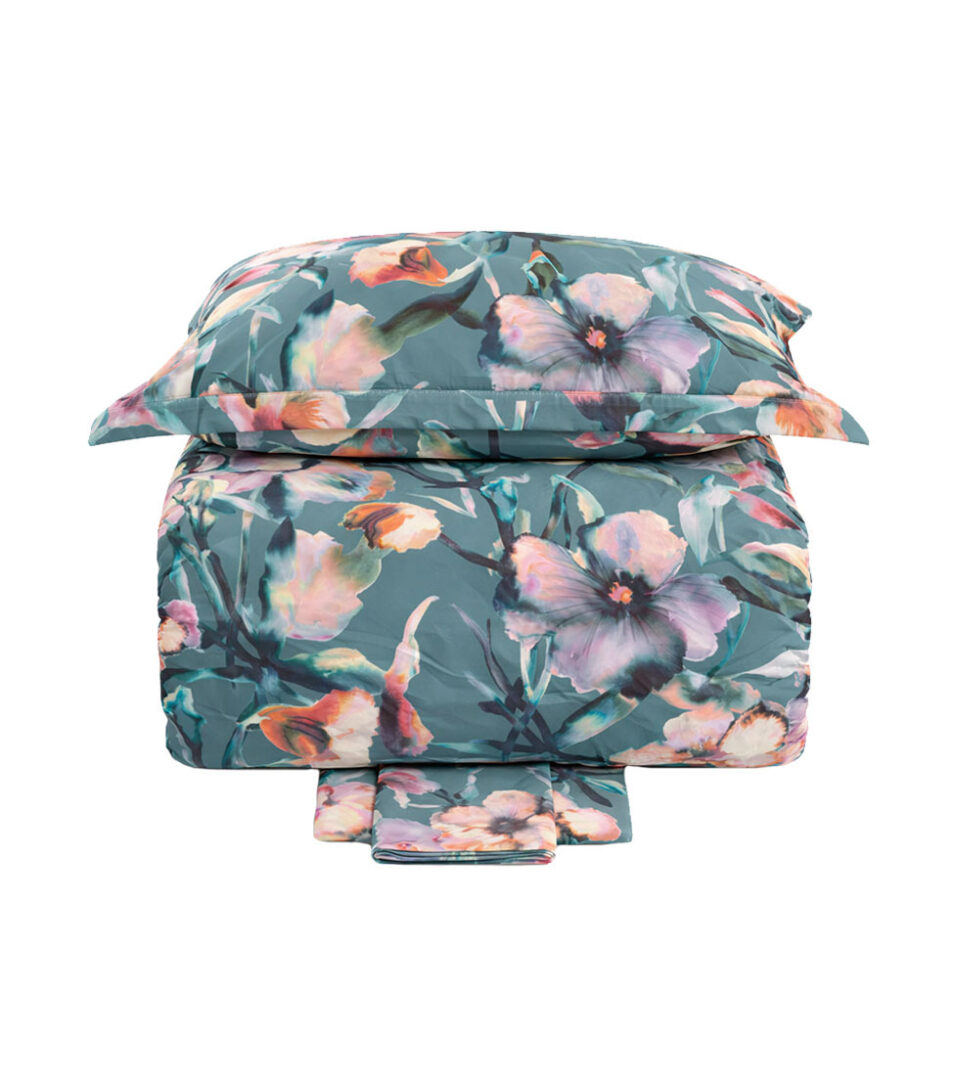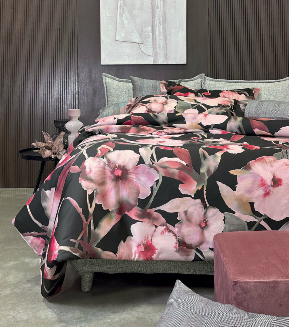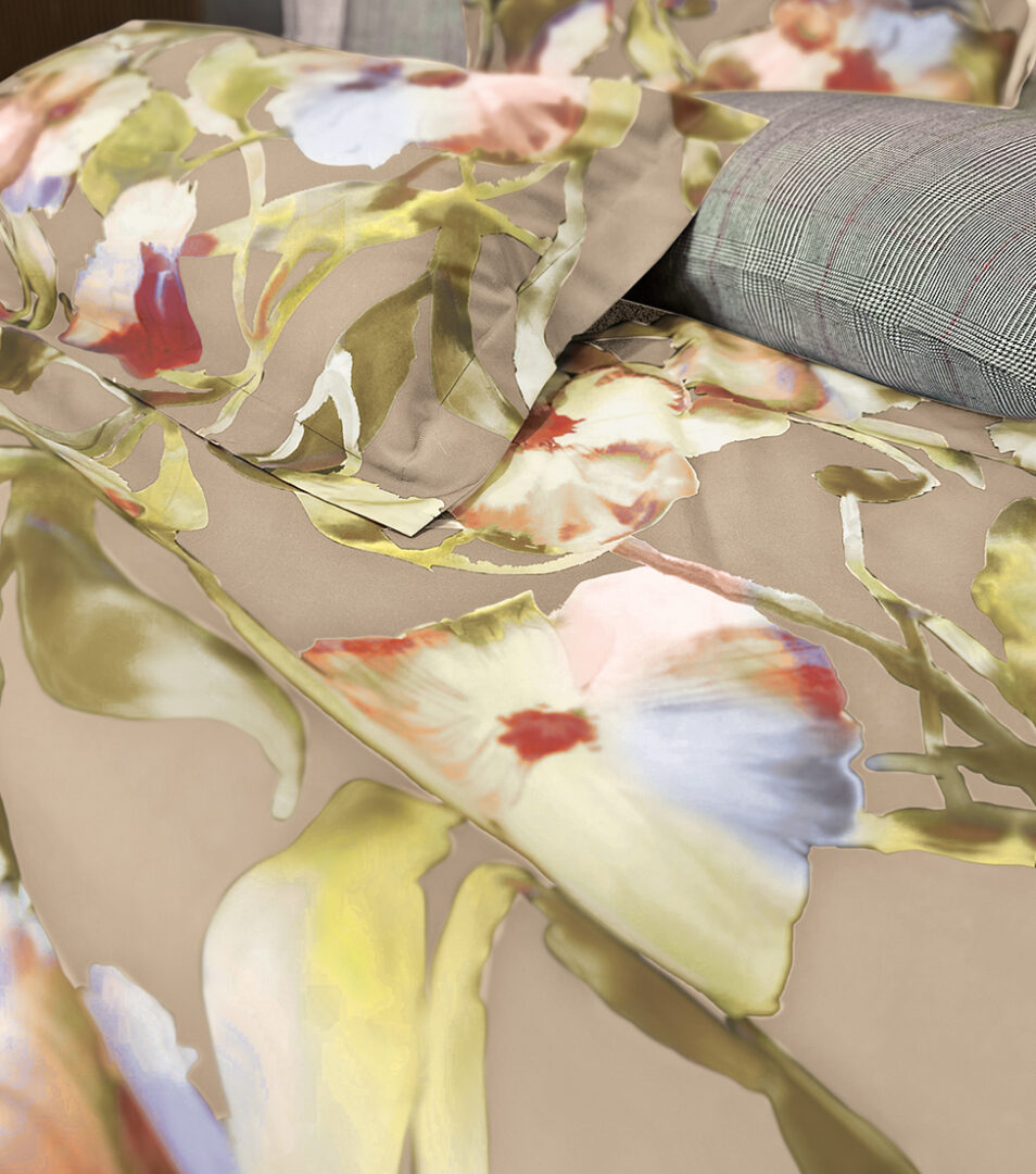 Duvet cover set for double bed in printed cotton sateen, bottom side and fitted sheet in solid cotton sateen.