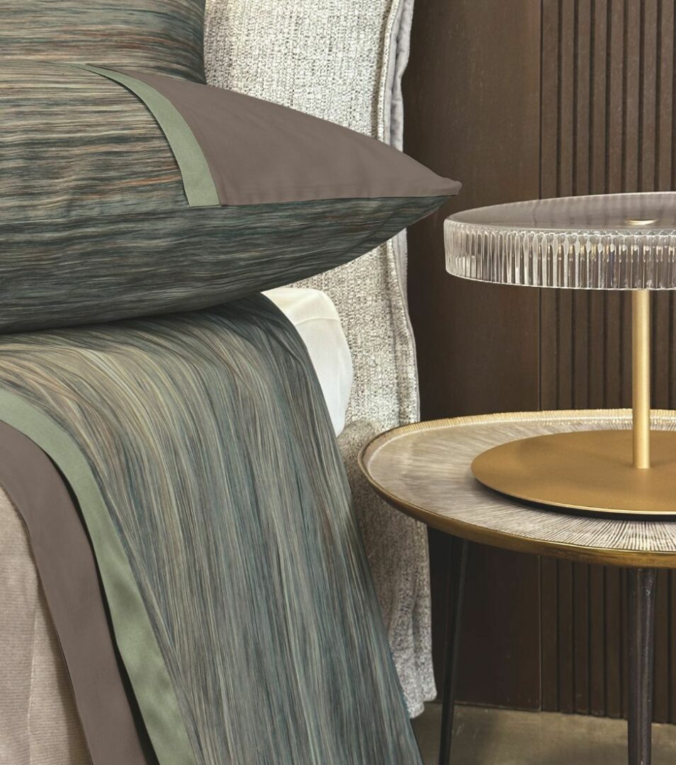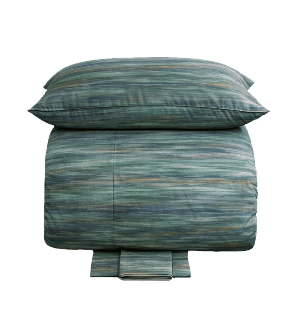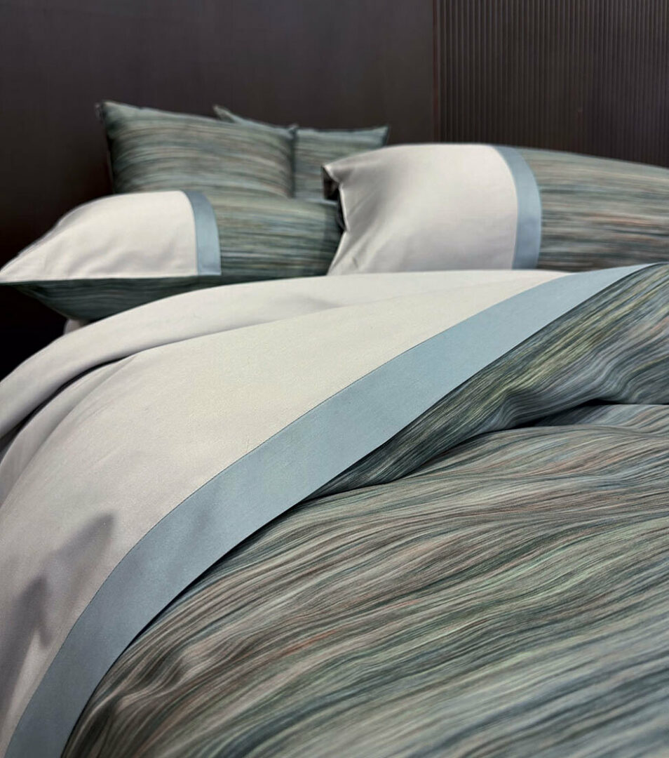 Duvet cover set for double bed in printed cotton sateen, top side with solid fold-over finished contrast color border, bottom side and fitted sheet in solid cotton sateen.