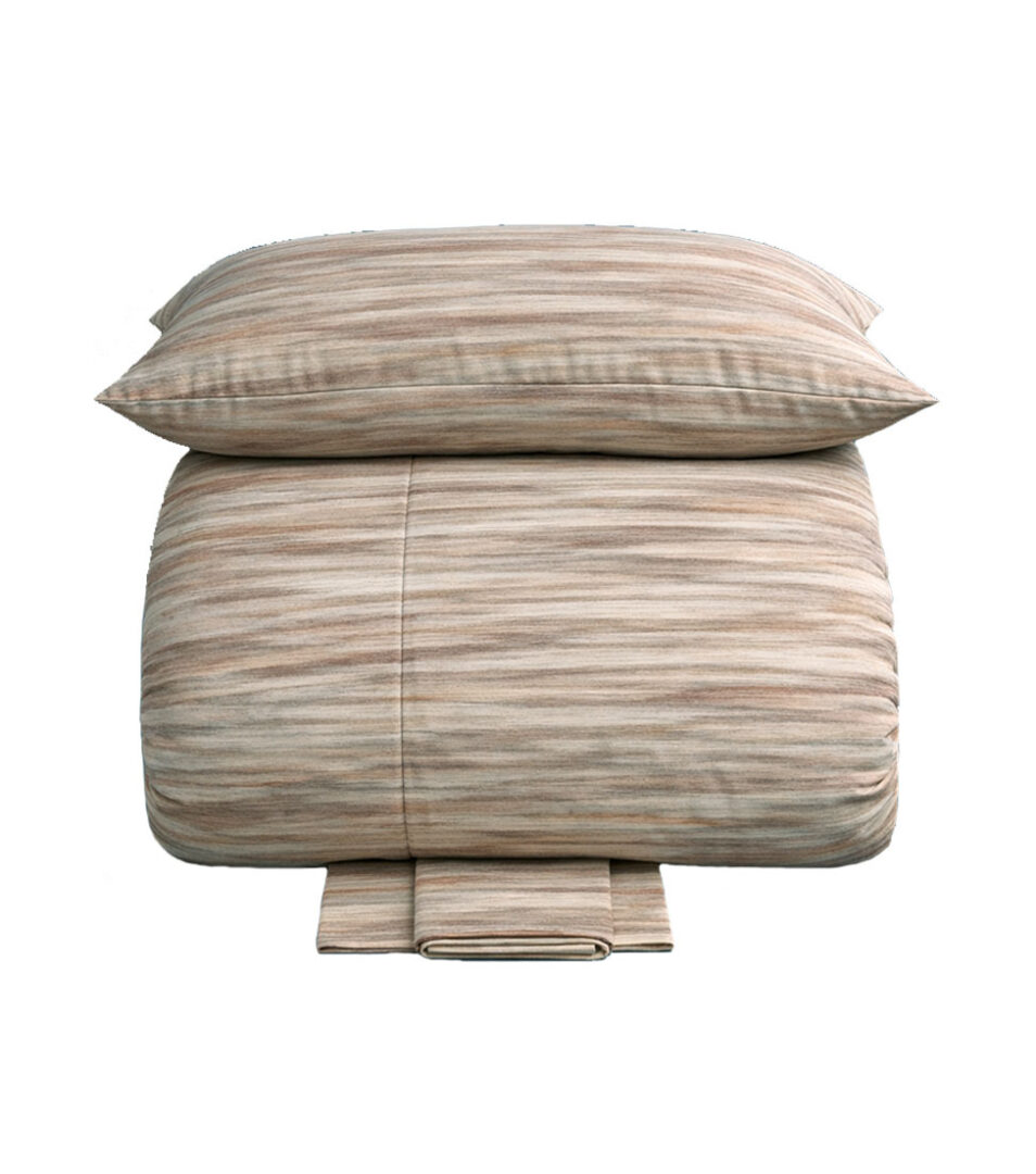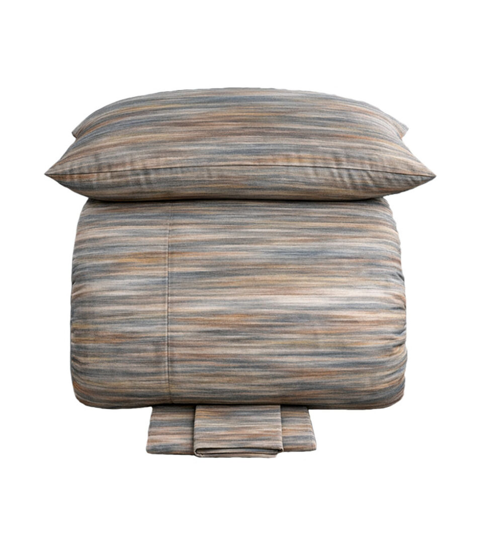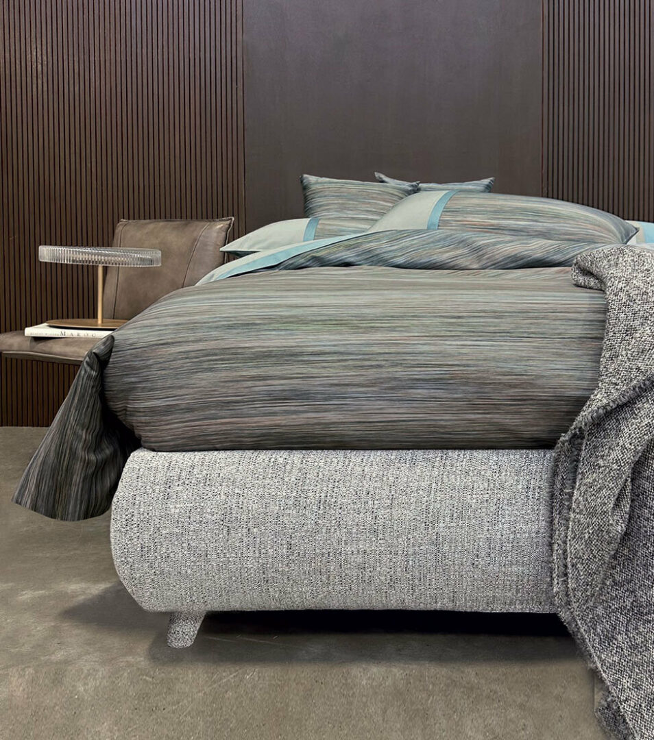 Duvet cover set for double bed in printed cotton sateen, top side with solid fold-over finished contrast color border, bottom side and fitted sheet in solid cotton sateen.