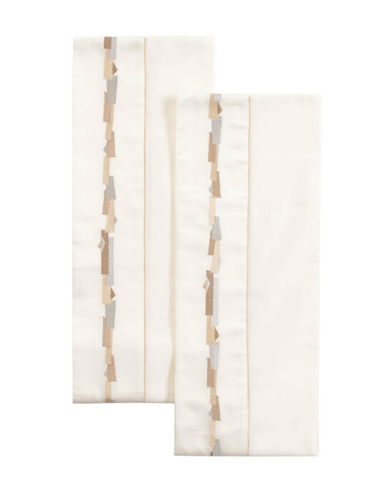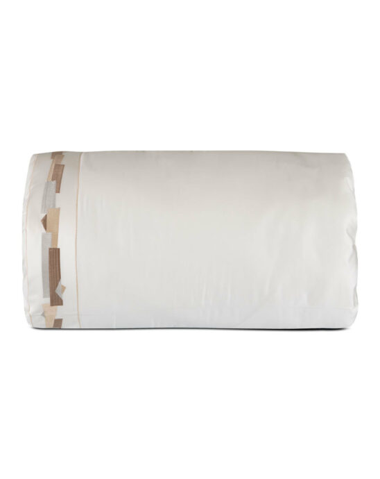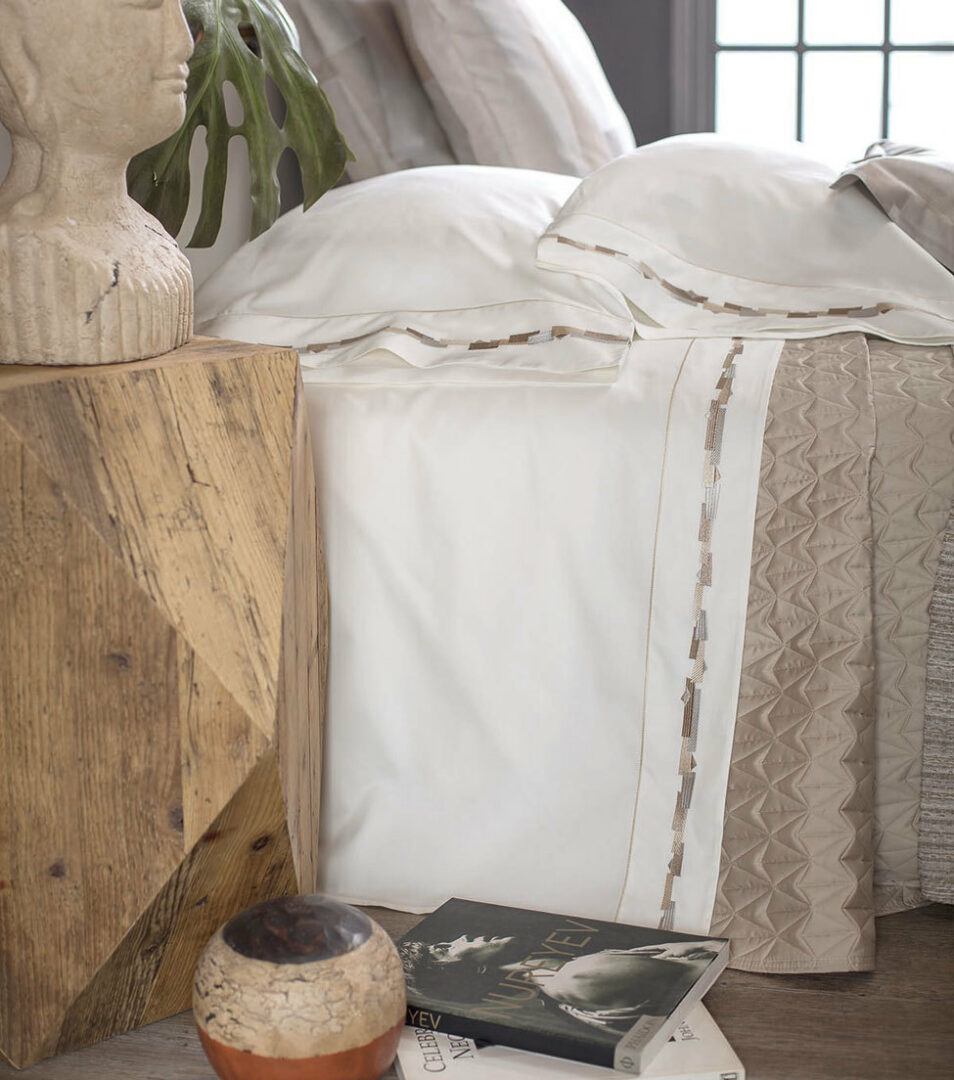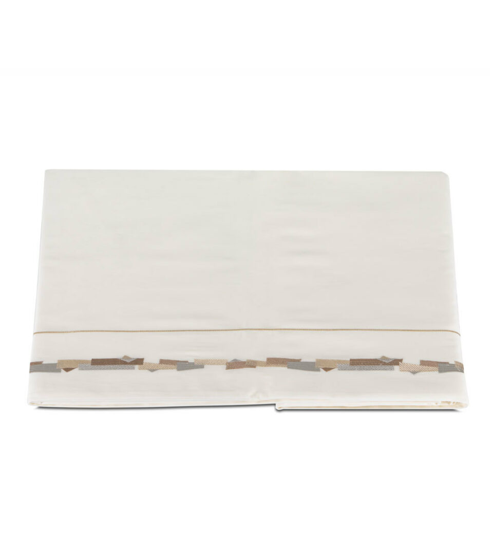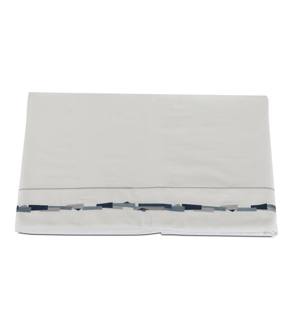 Top sheet in in pure cotton sateen with geometrical embroidery and piping. The elegance and the high quality that has always distinguished Dondi products.