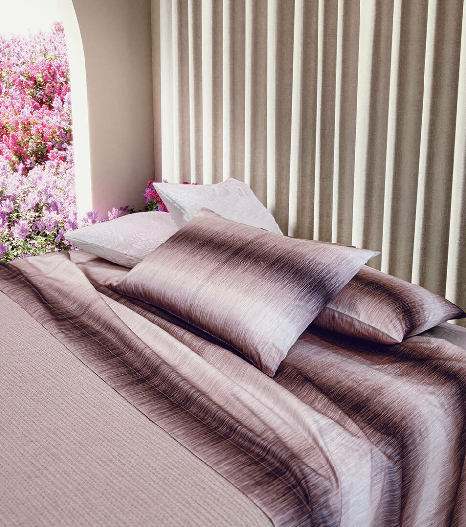 Sheet set for double bed in printed cotton sateen with bottom sheet in solid color.