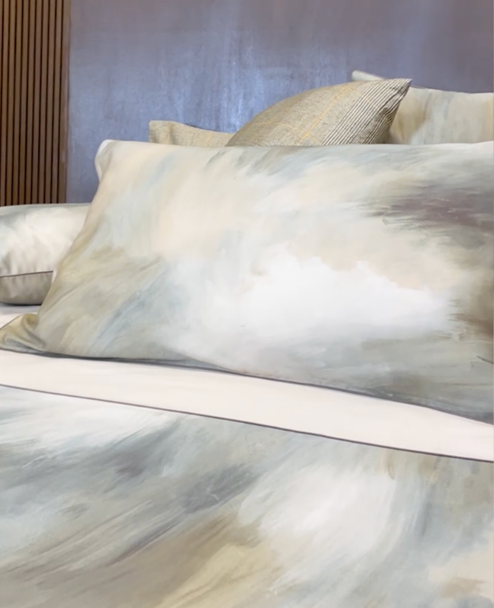 Sheet set for double bed in printed cotton sateen, top sheet with 8 cm border in solid color finished with piping, bottom sheet in solid color.