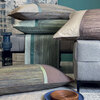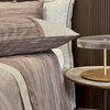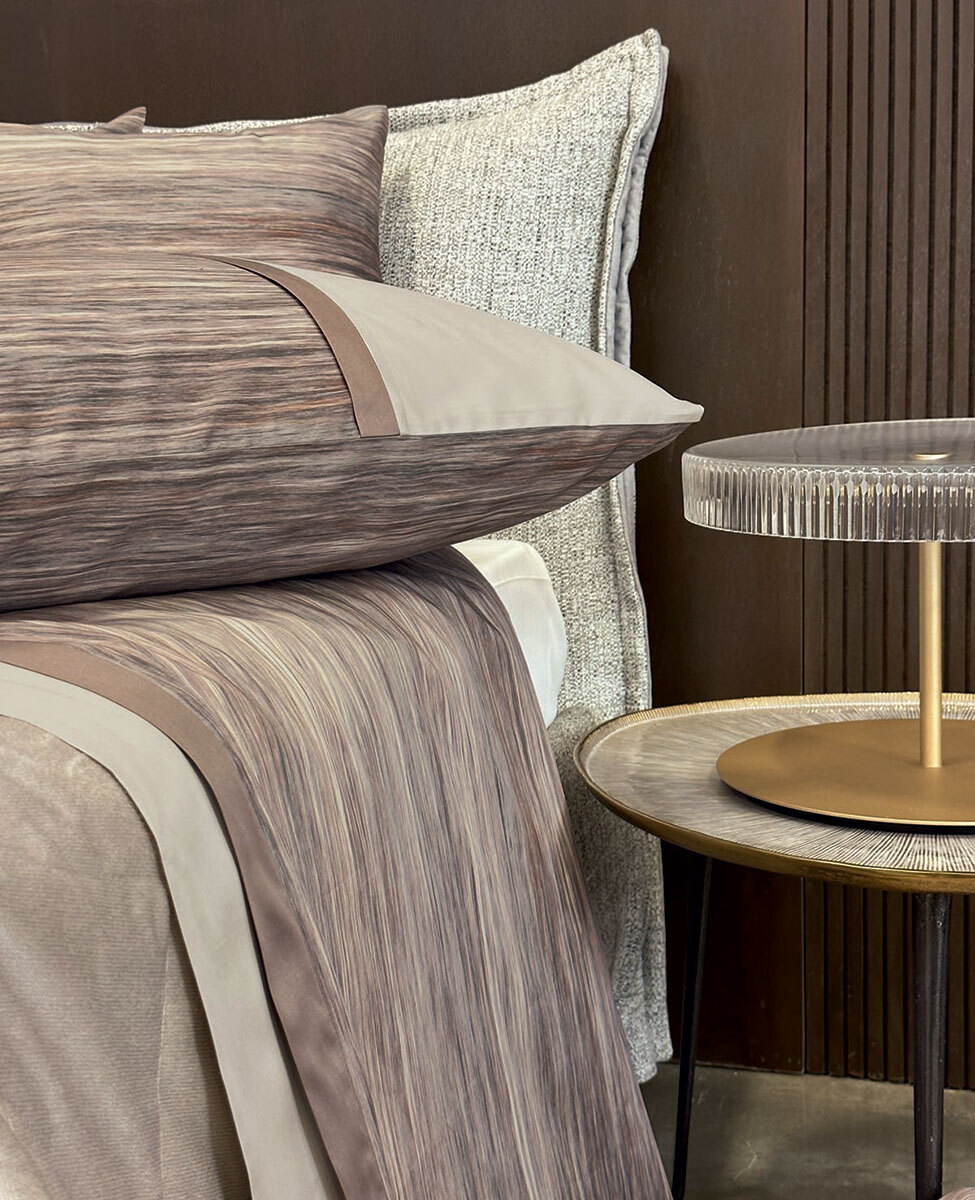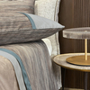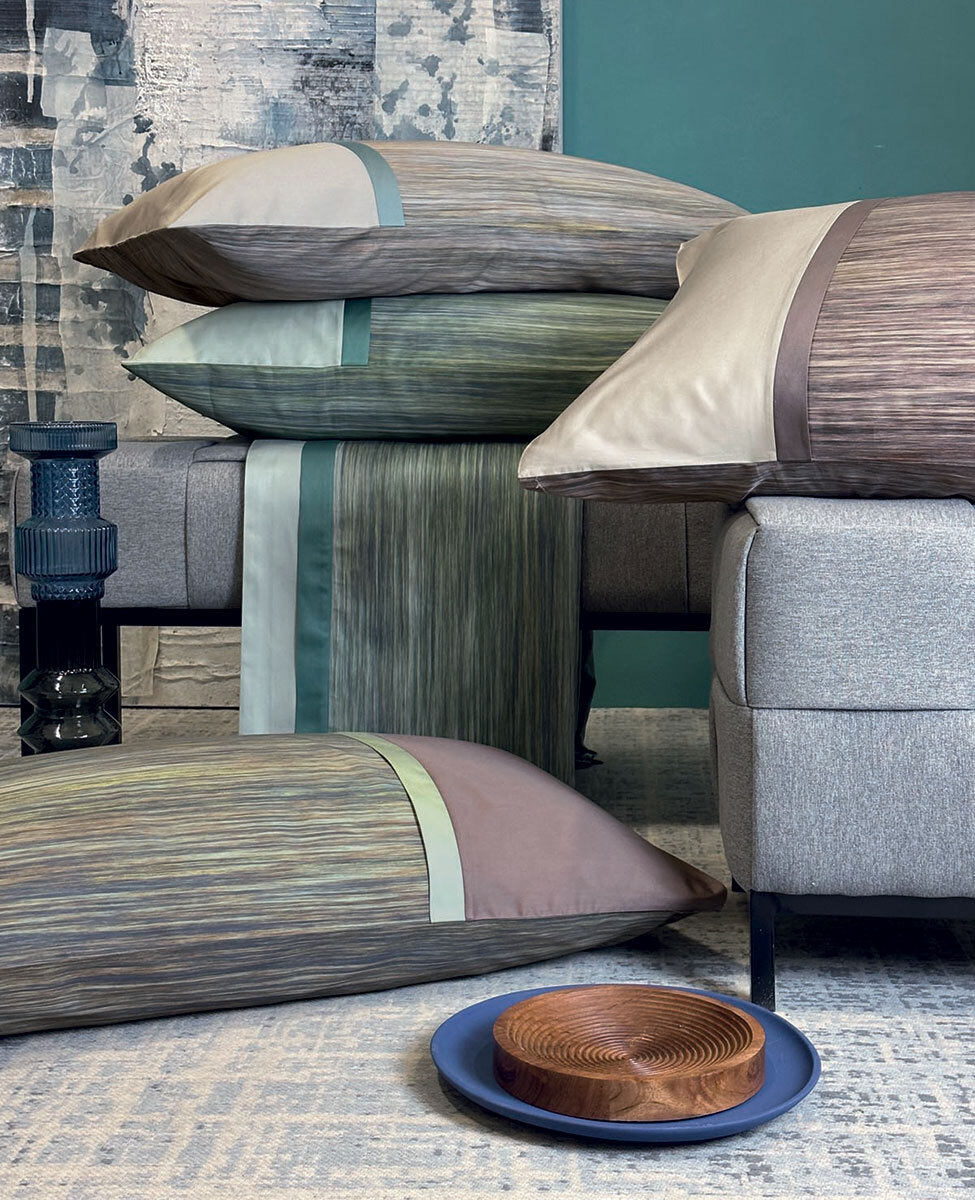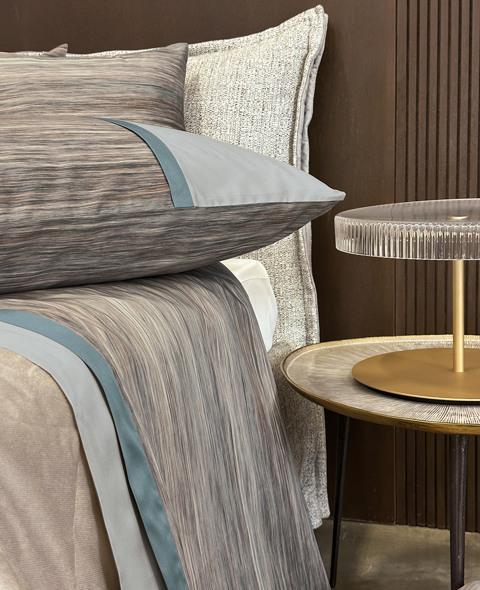Sheet set for double bed in printed cotton sateen, top sheet and pillowcases finished with border in two colors, bottom sheet in solid color.