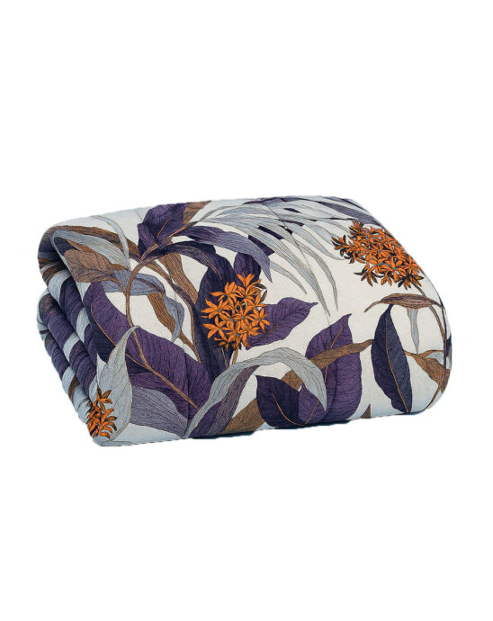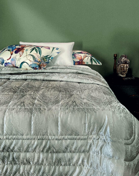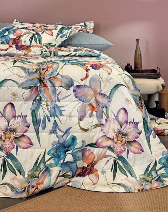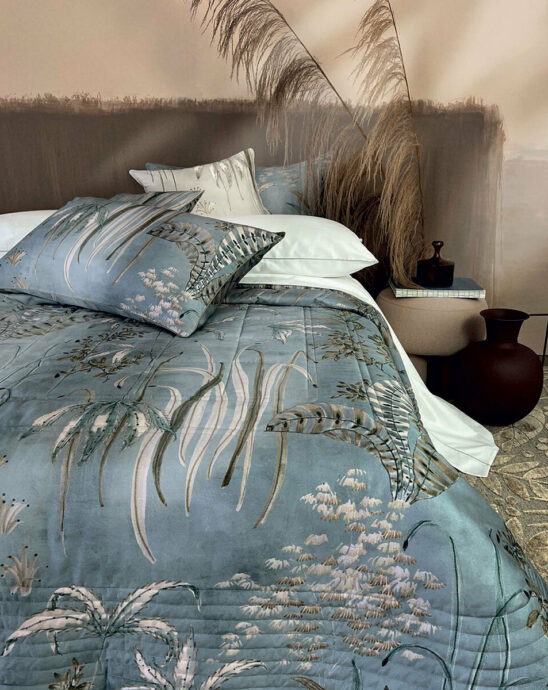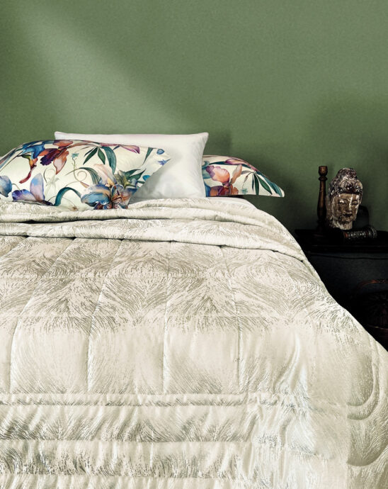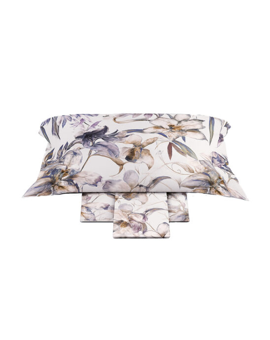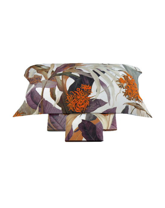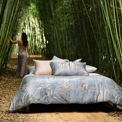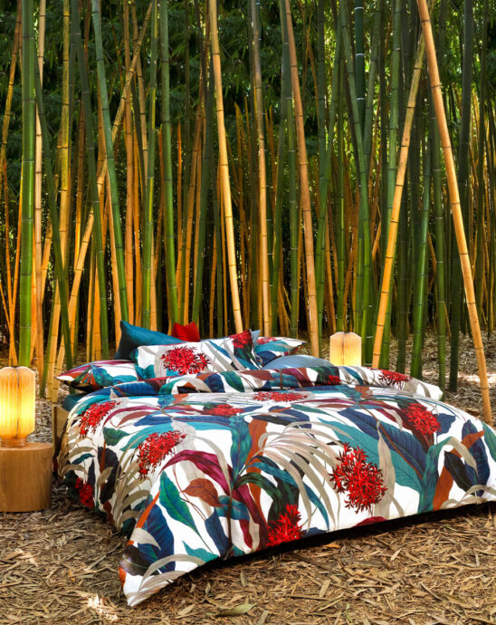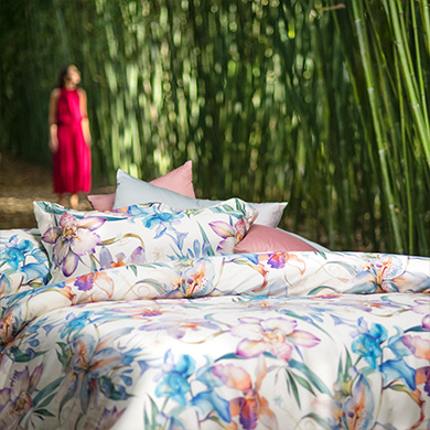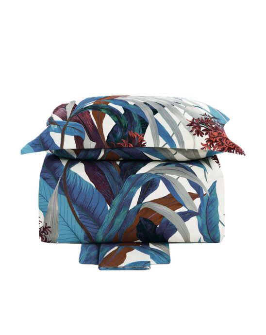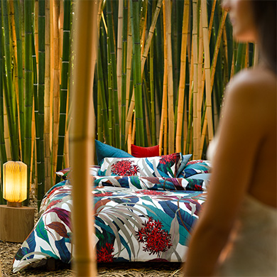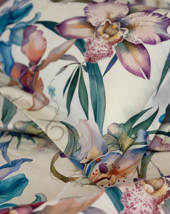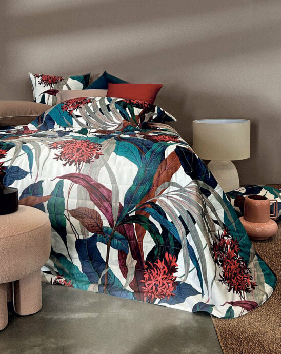 A lush jungle of leaves, speckled with vibrant petals. Among greens enriched with subtle blue tones, soft cream nuances emerge, enhanced by the pleasure of three‑flounce pillowcases. The Paprika and Carminio variants welcome a weave of bold, painterly lines with a captivating appeal.
