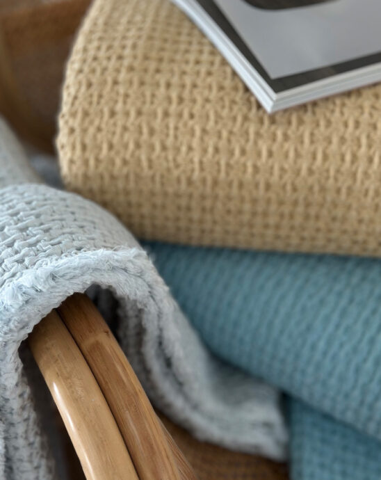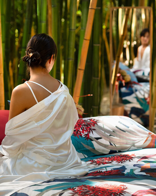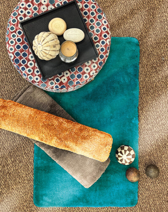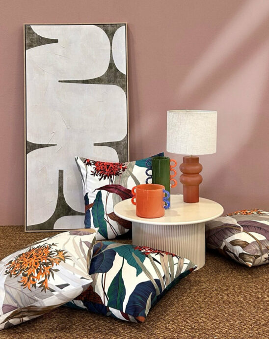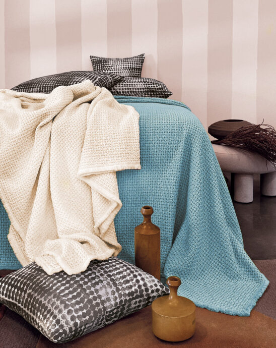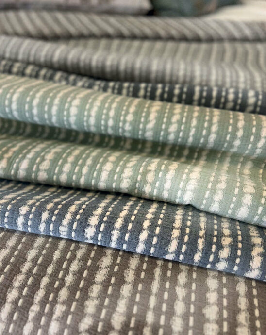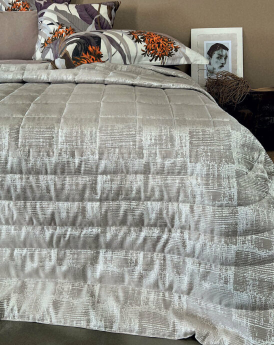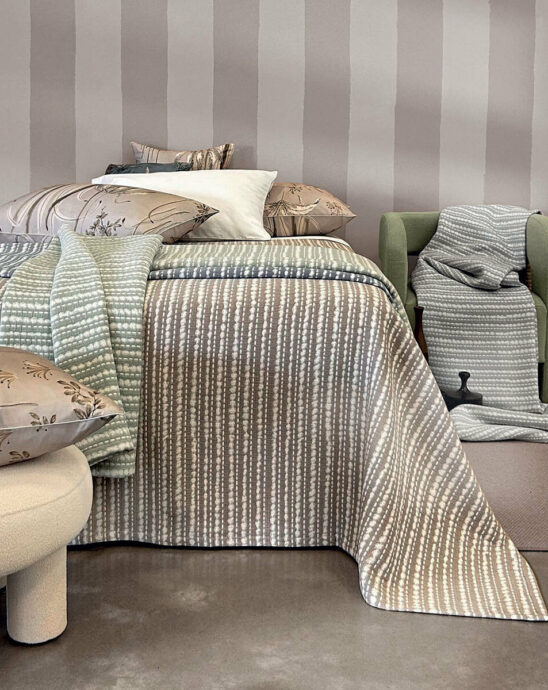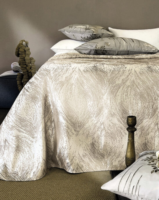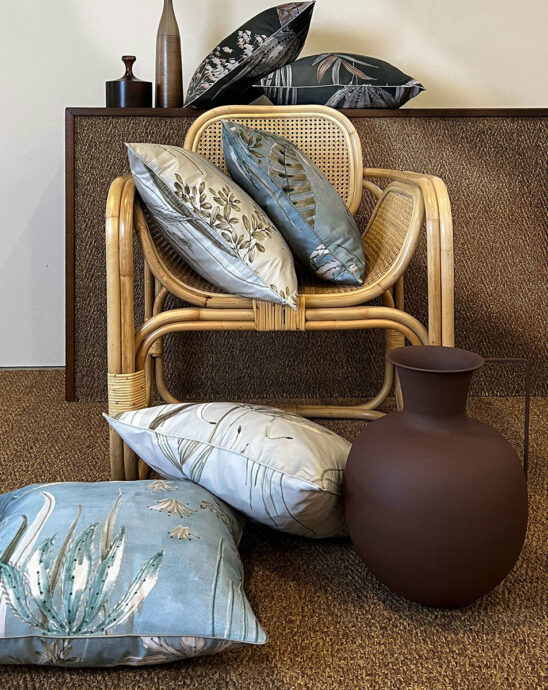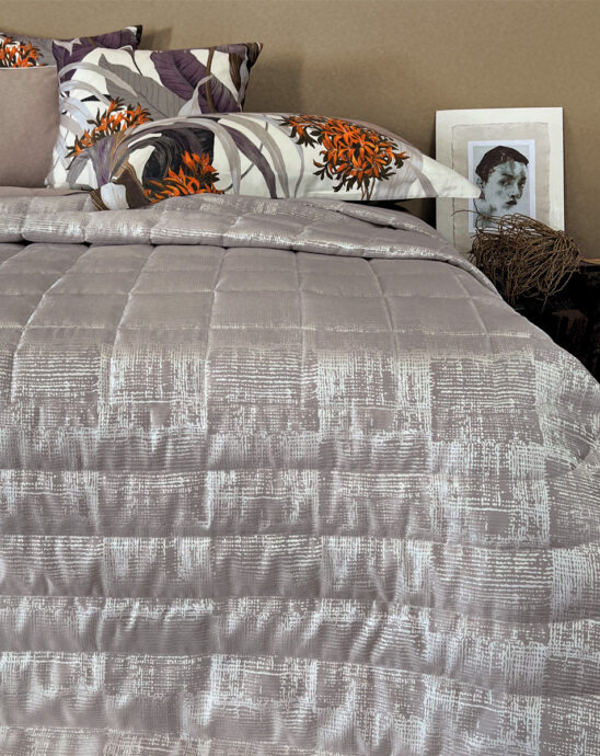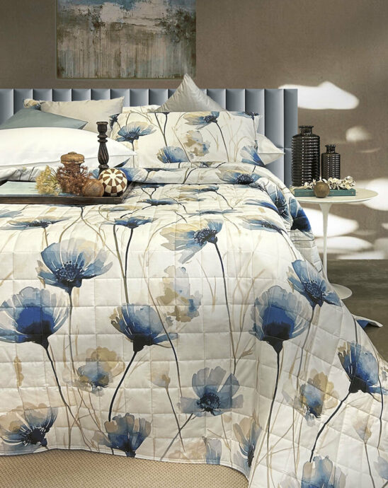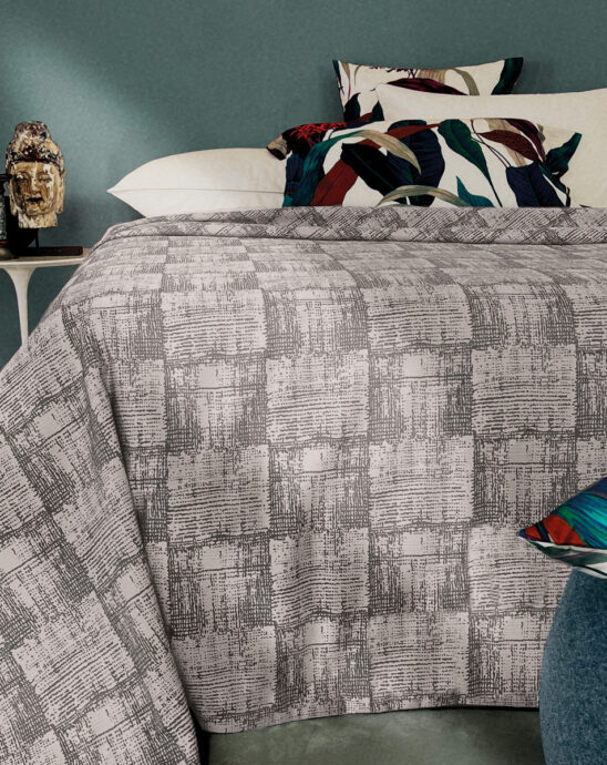 A lush jungle of leaves, speckled with vibrant petals. Among greens enriched with subtle blue tones, soft cream nuances emerge, enhanced by the pleasure of three‑flounce pillowcases. The Paprika and Carminio variants welcome a weave of bold, painterly lines with a captivating appeal.