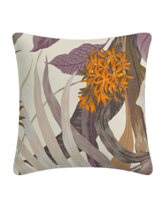 Large, powerful orchids unfold in rich, deep shades on a creamy background. Radiant light, the sensual lightness of the flounces and the elegance of the painterly design come together to create an ideal world—fresh, open and inspired by dreams.