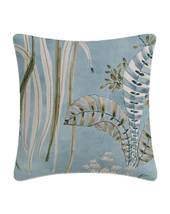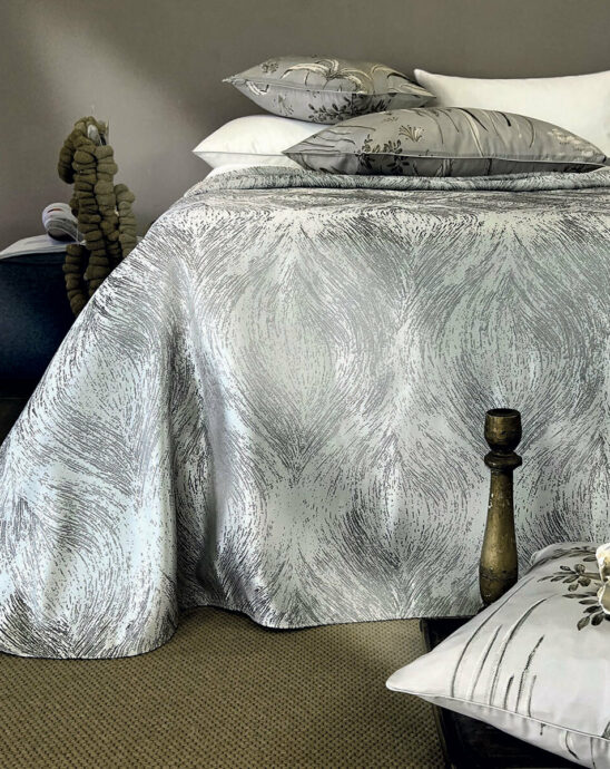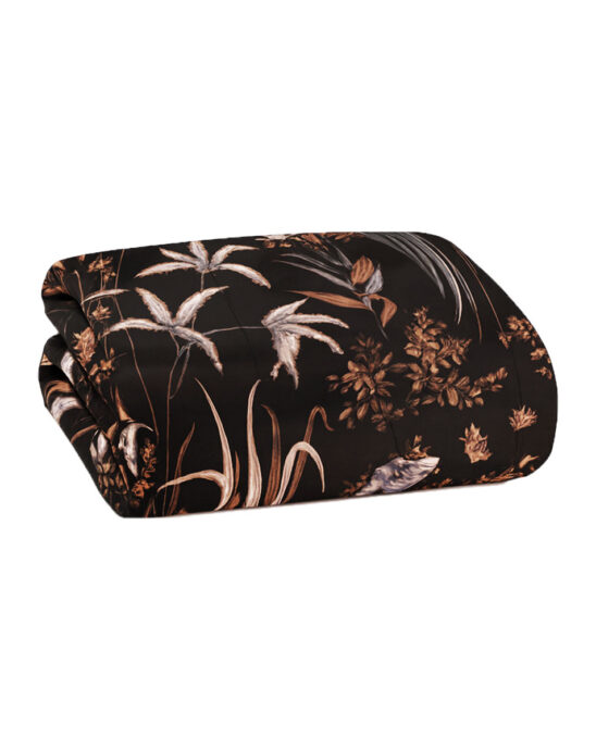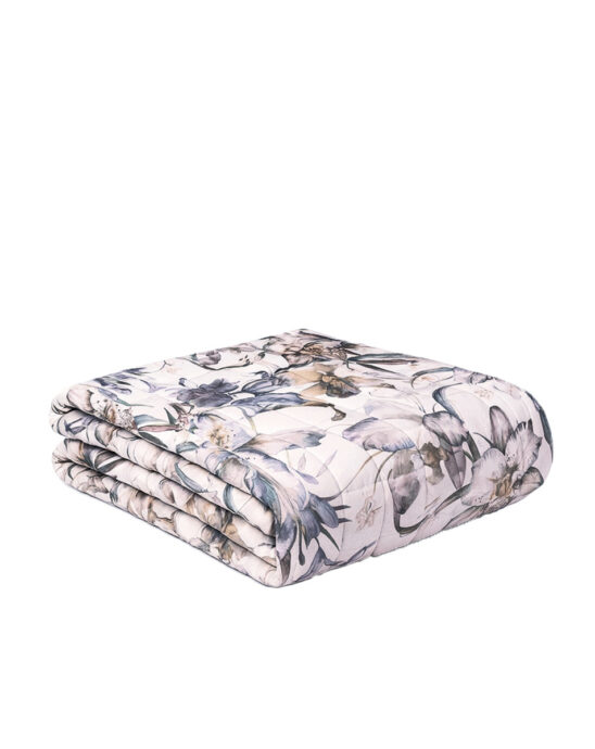 Lustrous cotton sateen adorned with botanical motifs that guide the eye into a wonderful floral atmosphere. The rich, full background tones—Mother‑of‑Pearl, Liquorice and Lagoon—play with contrasting intensities, creating a refined visual depth.