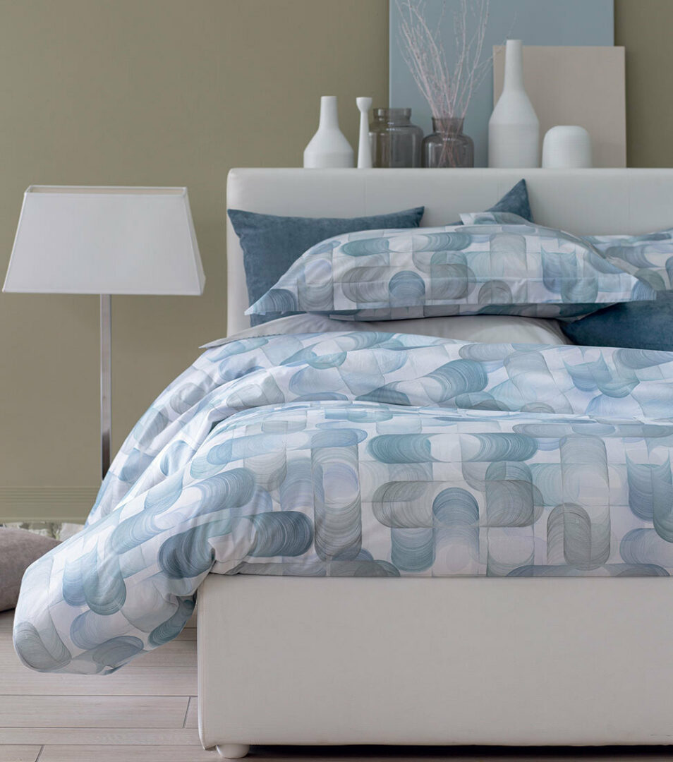 Duvet cover set 3 pcs for double bed in printed cotton percale, top side and pillowcases in printed fabric, bottom side in solid cotton percale.