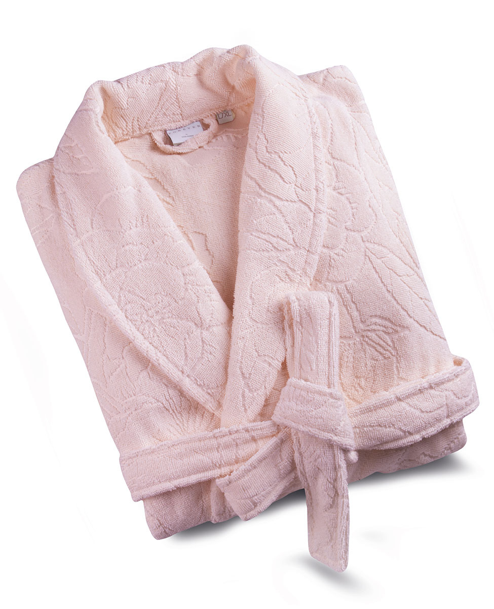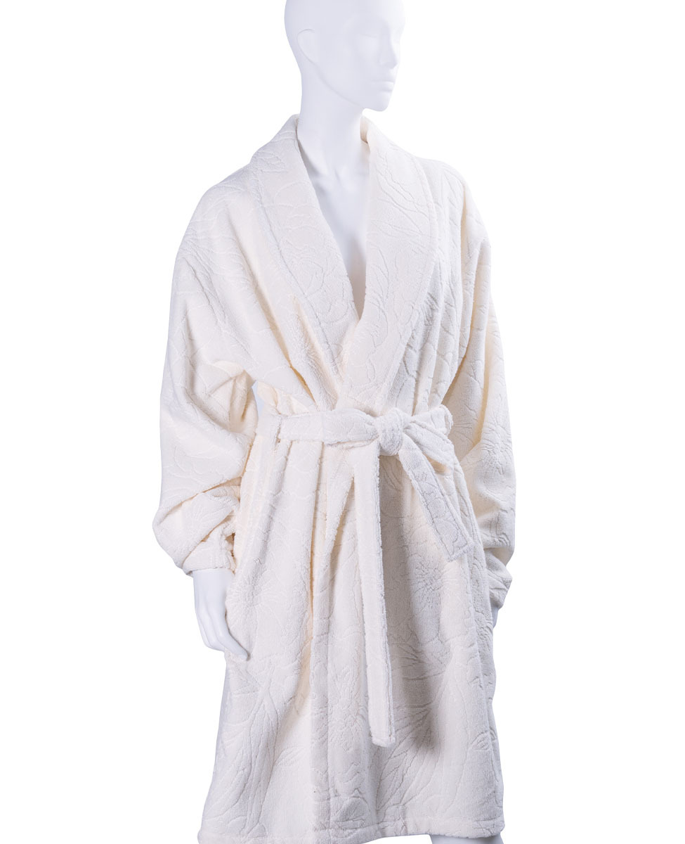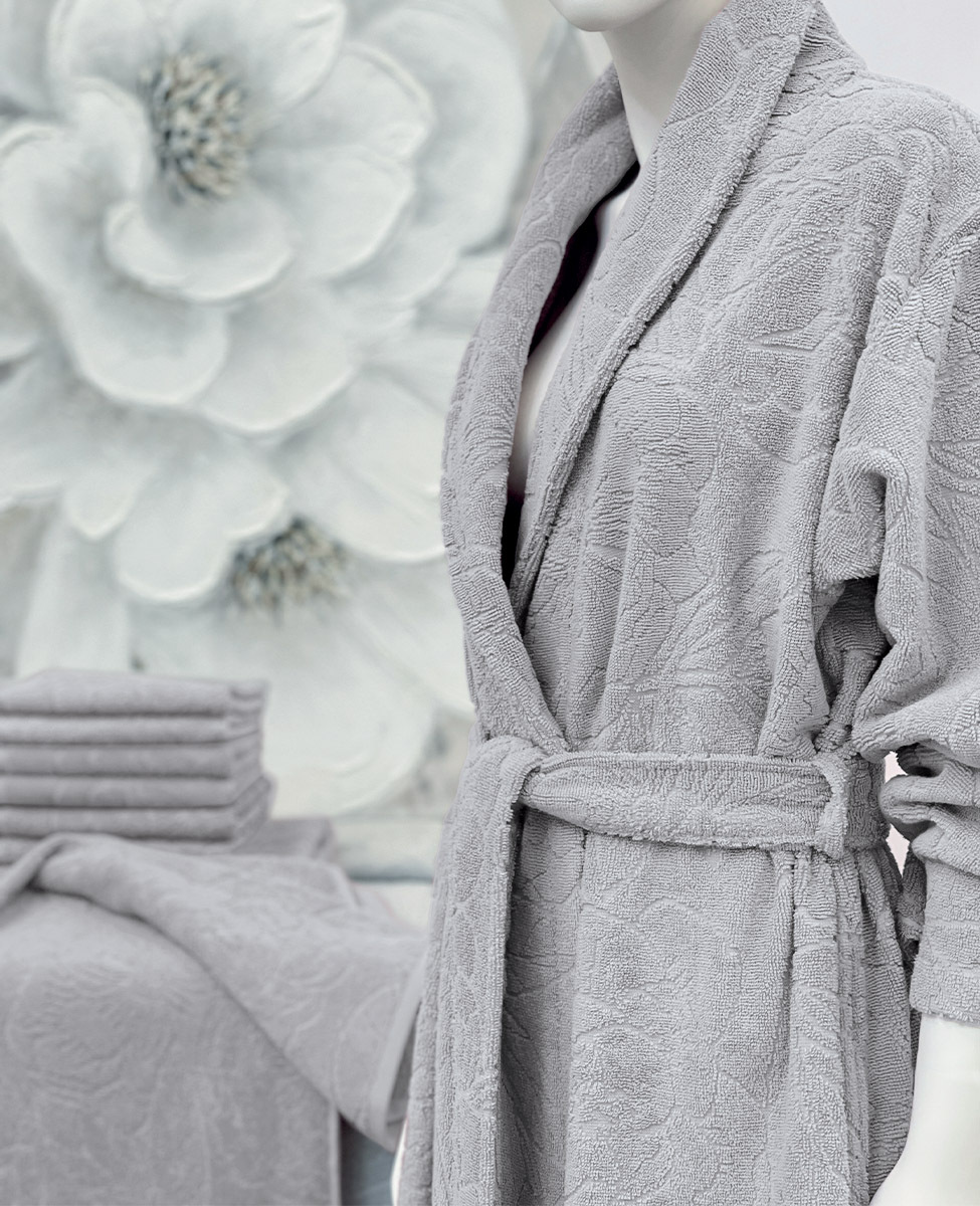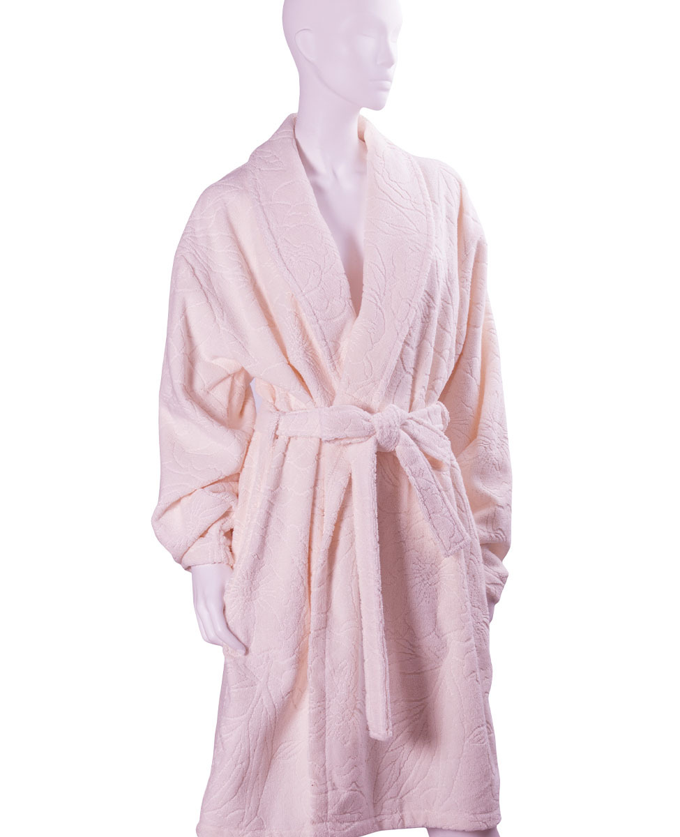 Accappatoio sciallato in tinta unita con motivo floreale piazzato in jacquard con tasche inserite nei fianchi, taglia S/M, lunghezza 110 cm.