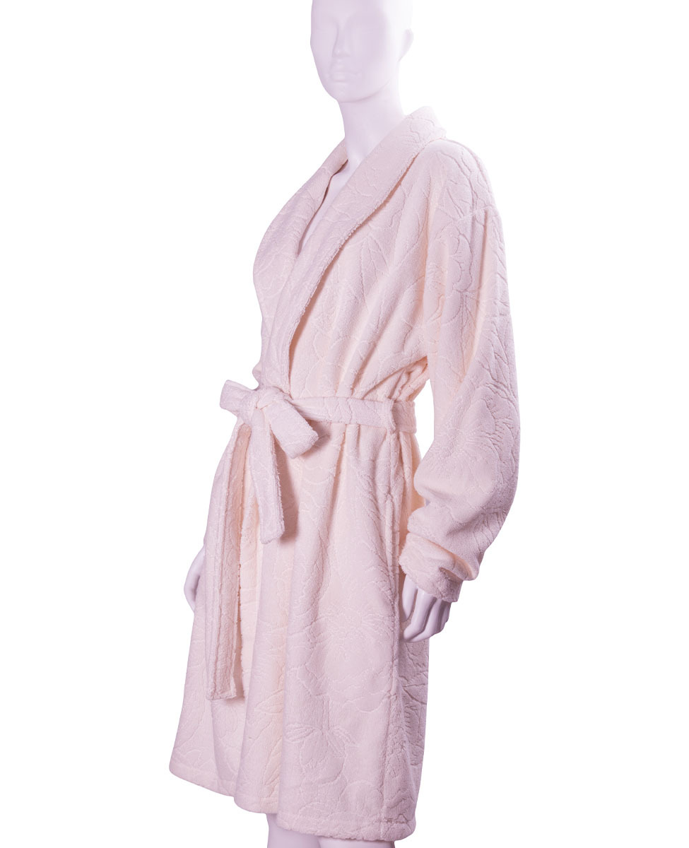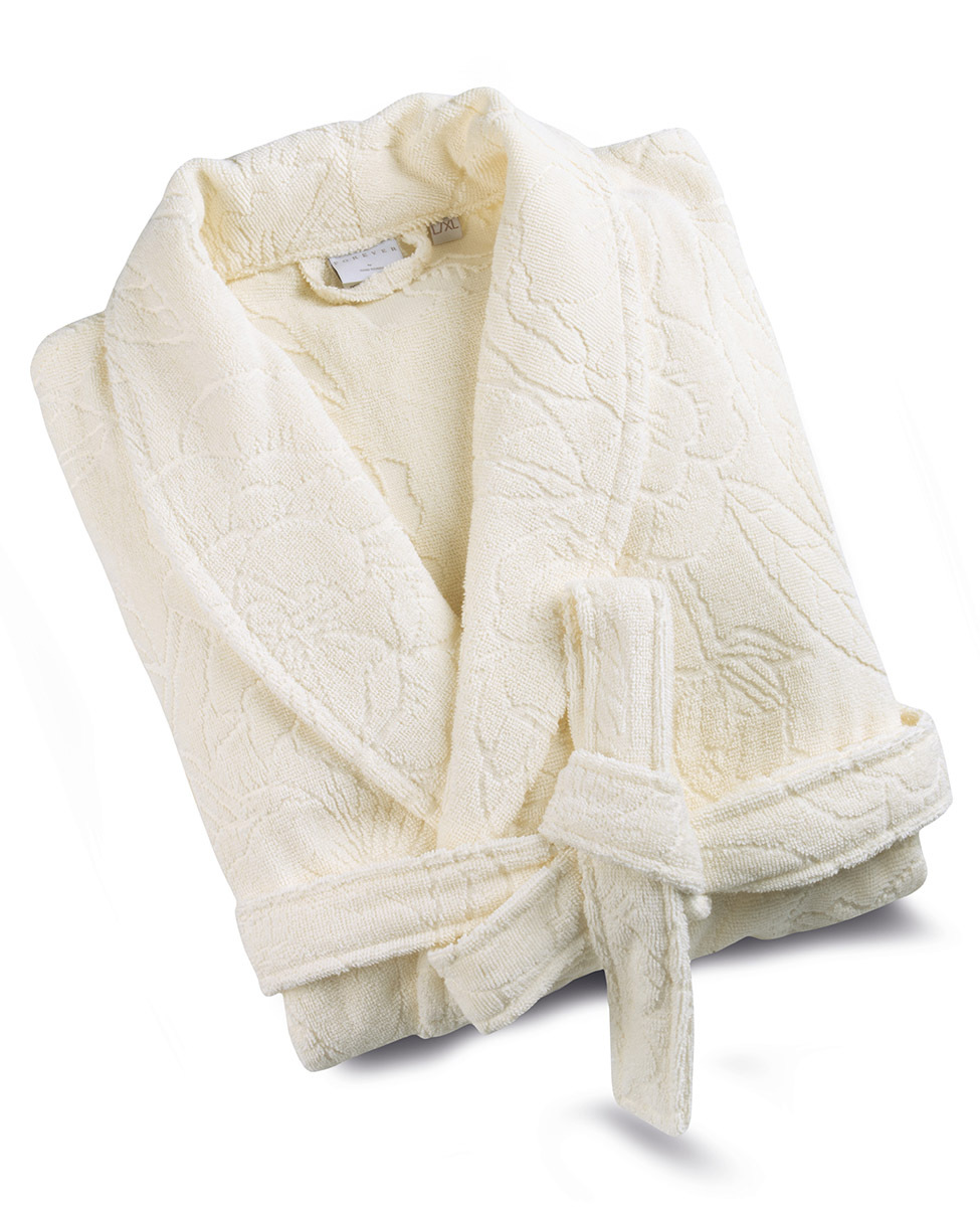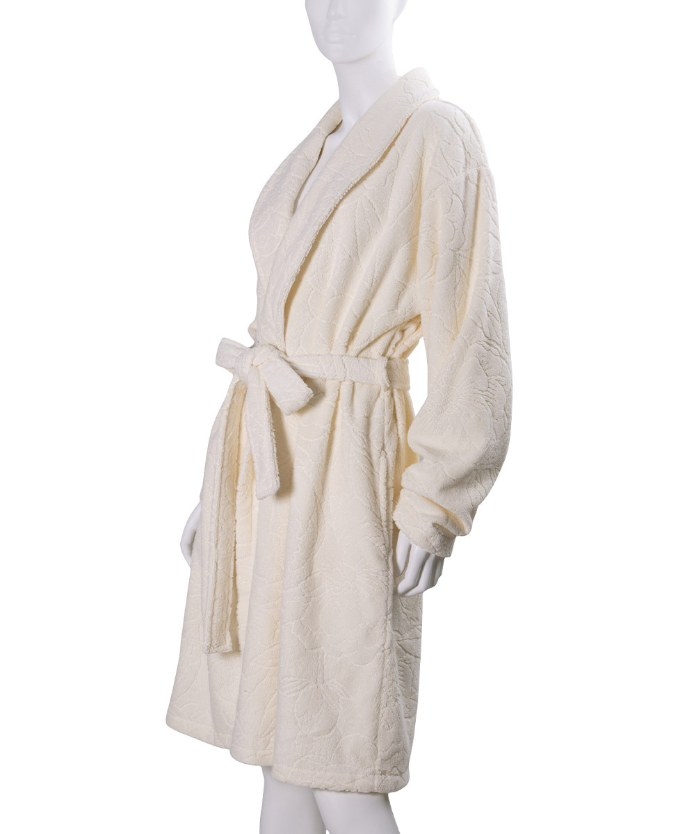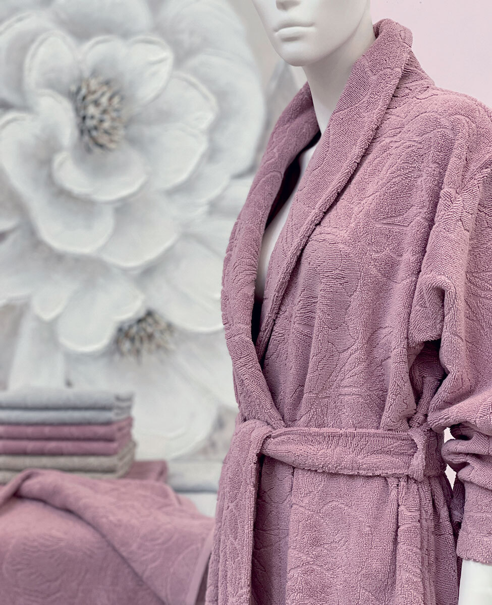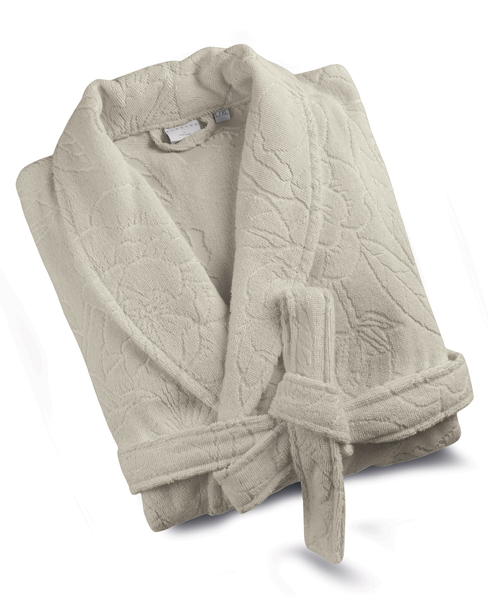 Accappatoio sciallato in tinta unita con motivo floreale piazzato in jacquard con tasche inserite nei fianchi, taglia S/M, lunghezza 110 cm.