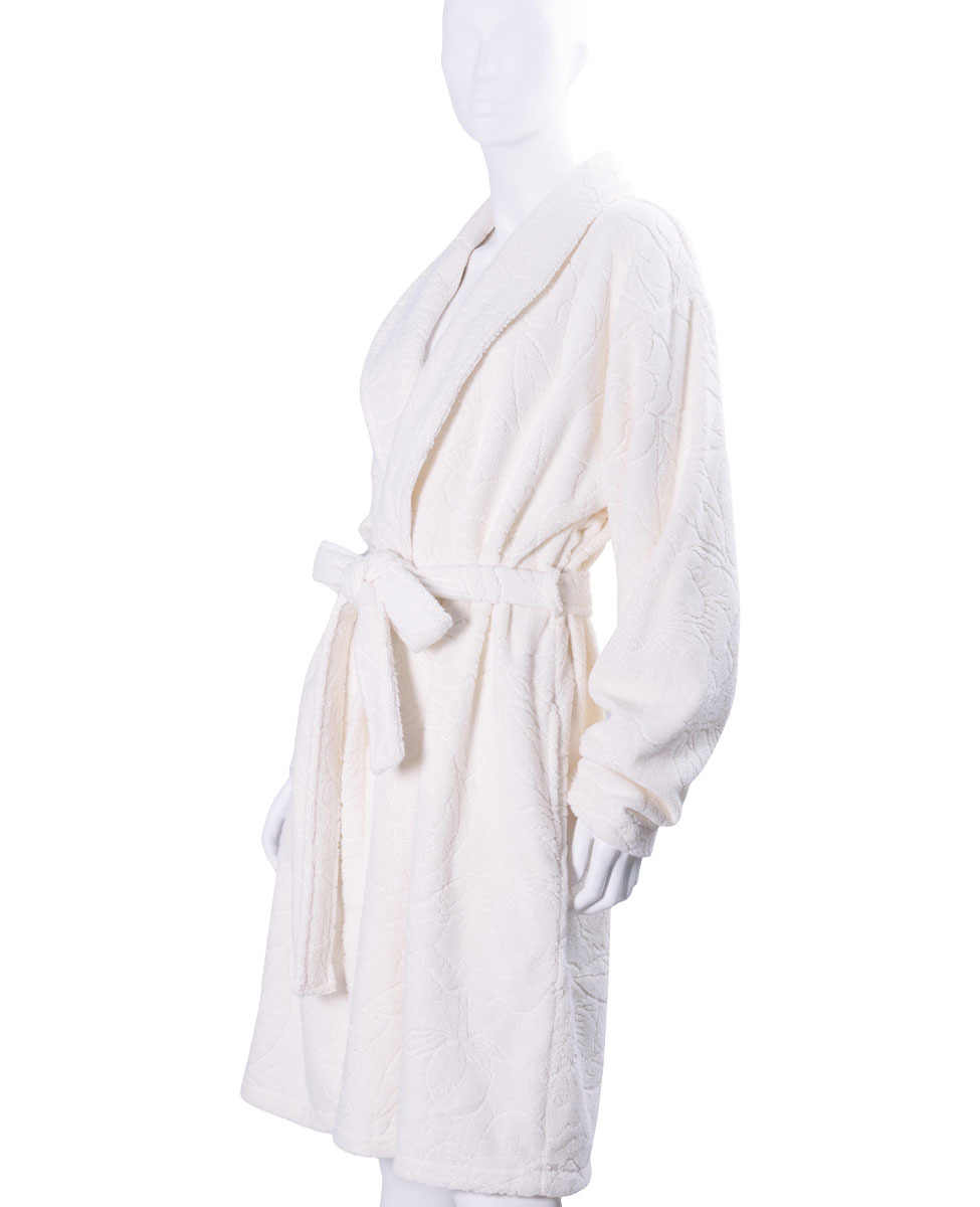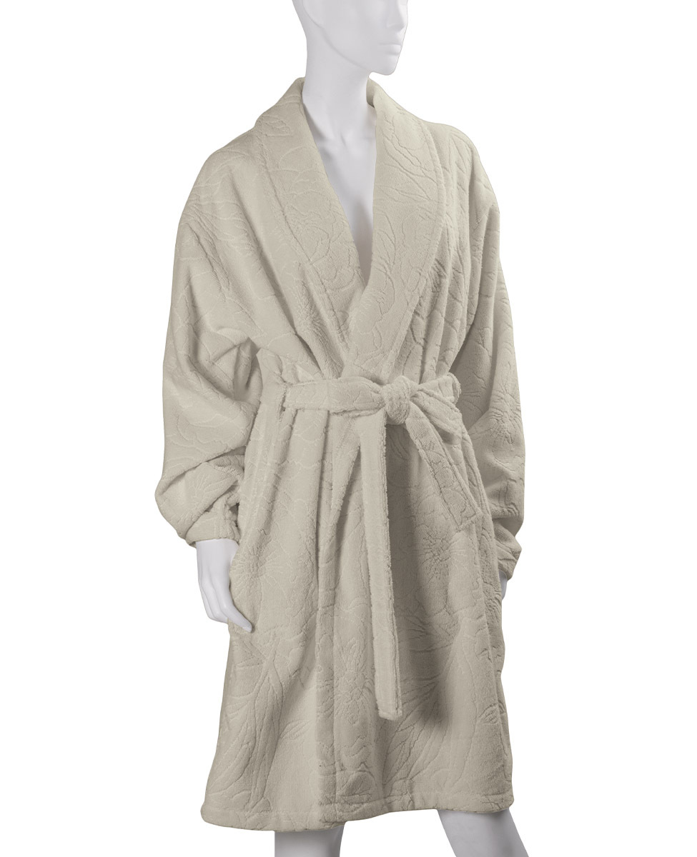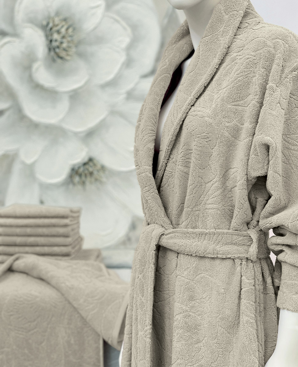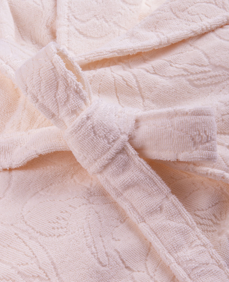 Accappatoio sciallato in tinta unita con motivo floreale piazzato in jacquard con tasche inserite nei fianchi, taglia S/M, lunghezza 110 cm.