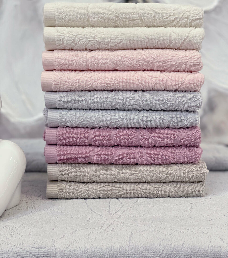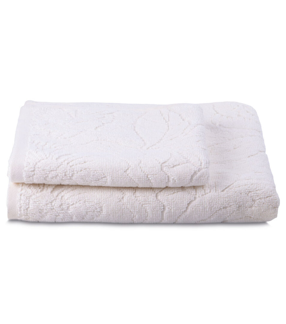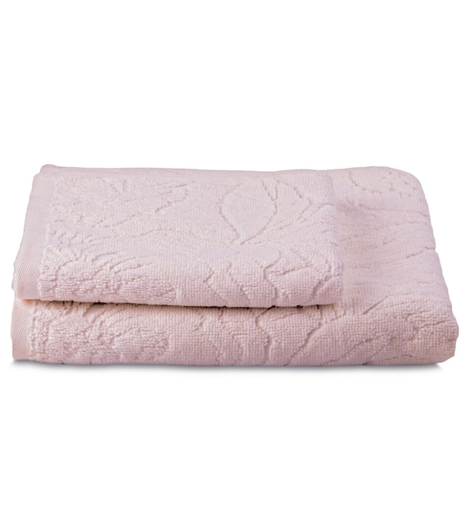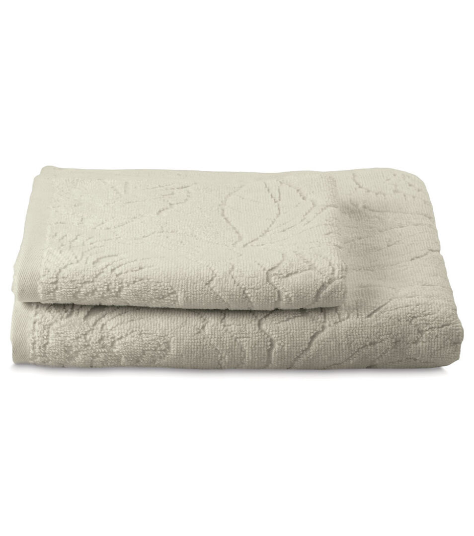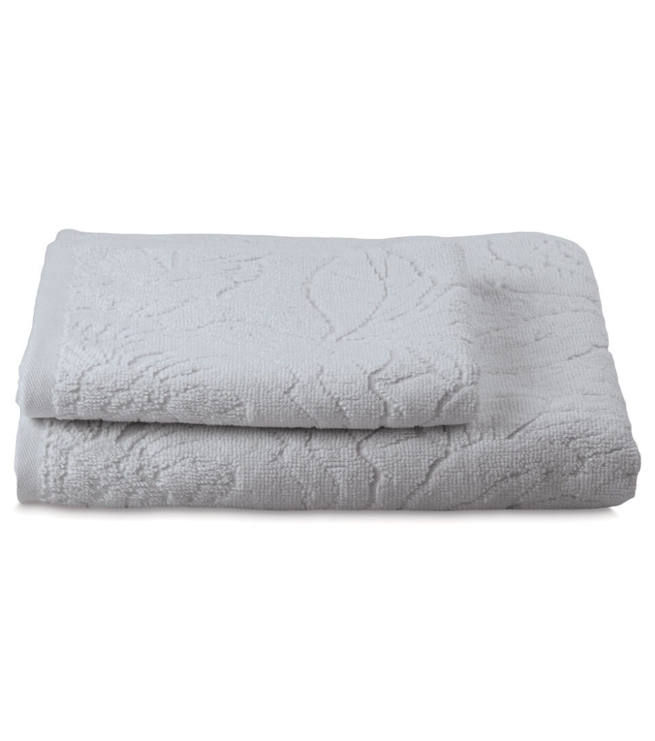 Coppia 1+1 di asciugamani in spugna di cotone tinta unita con motivo floreale piazzato in jacquard.