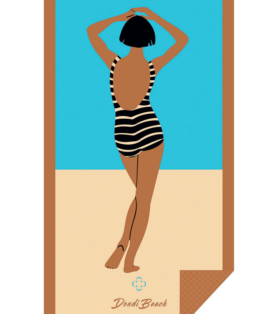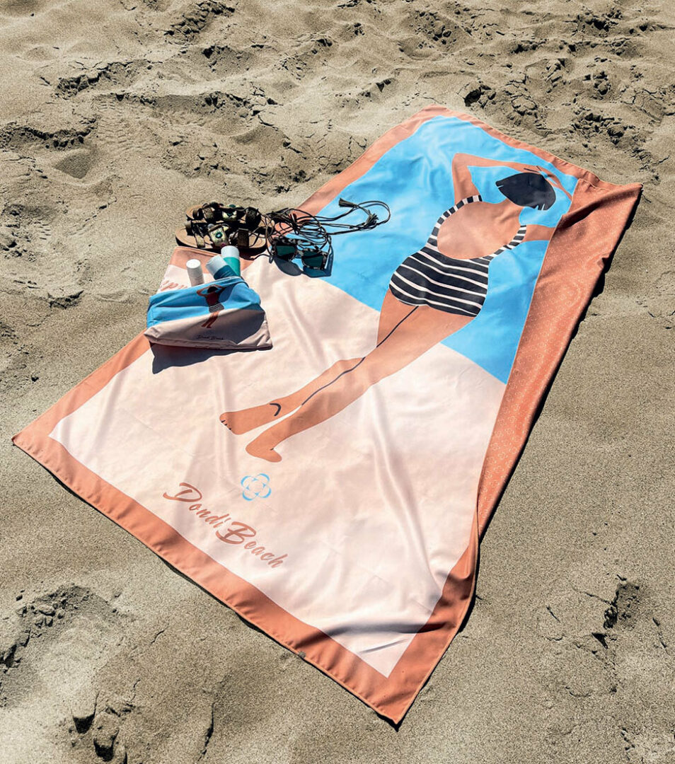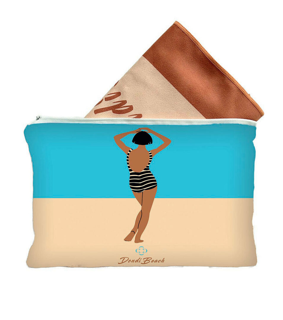 Telo mare in microfibra stampata, retro stampato con pattern logato all over, con pochette abbinata.