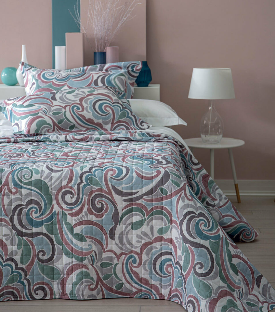 Fresco copriletto matrimoniale trapuntato in percalle di cotone stampato.