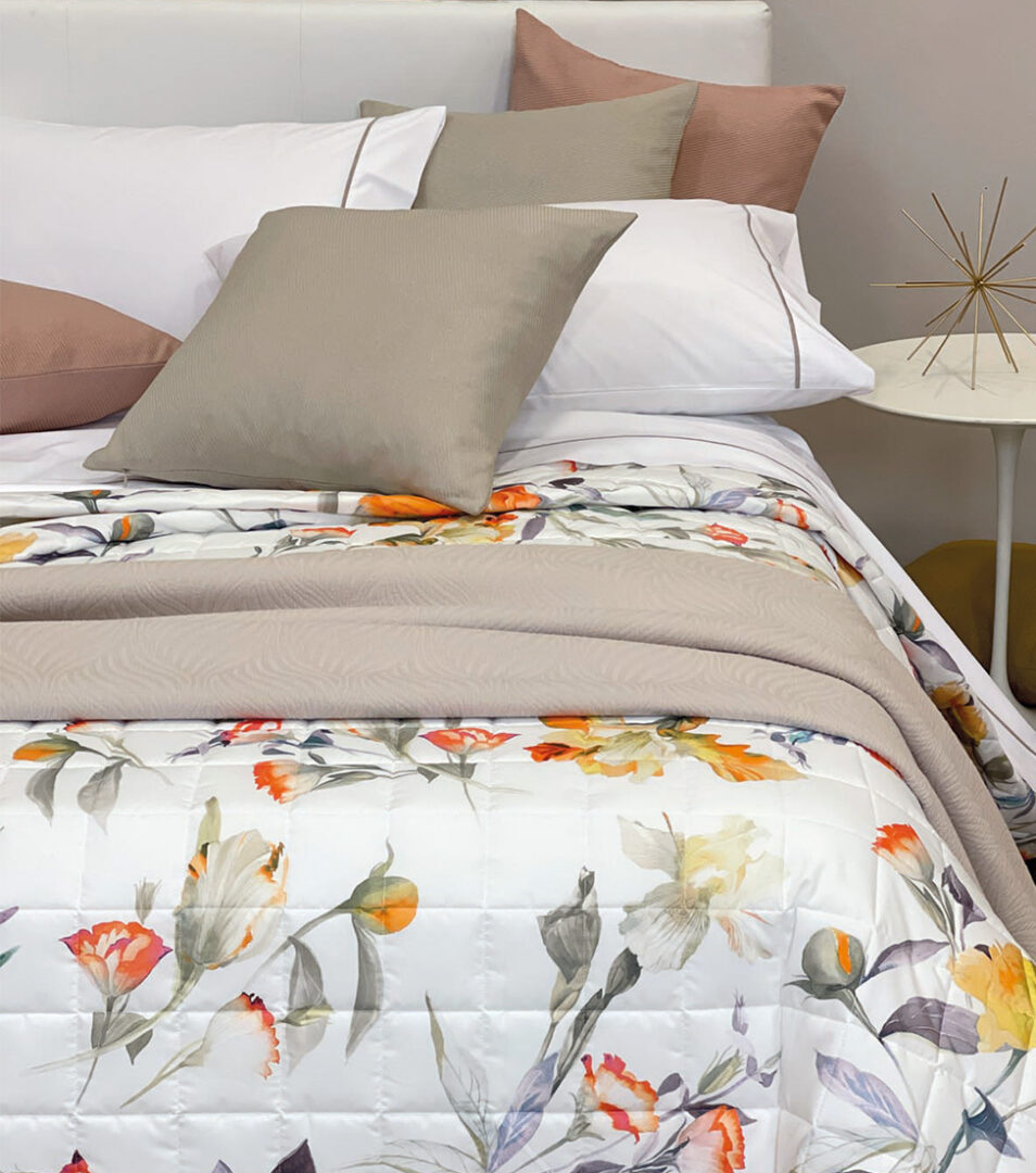 Fresco copriletto matrimoniale trapuntato in percalle di cotone con stampa all over.