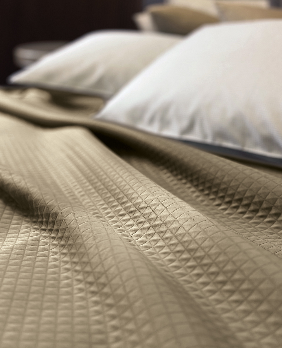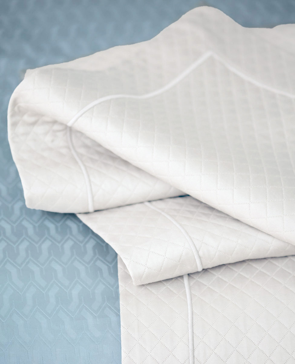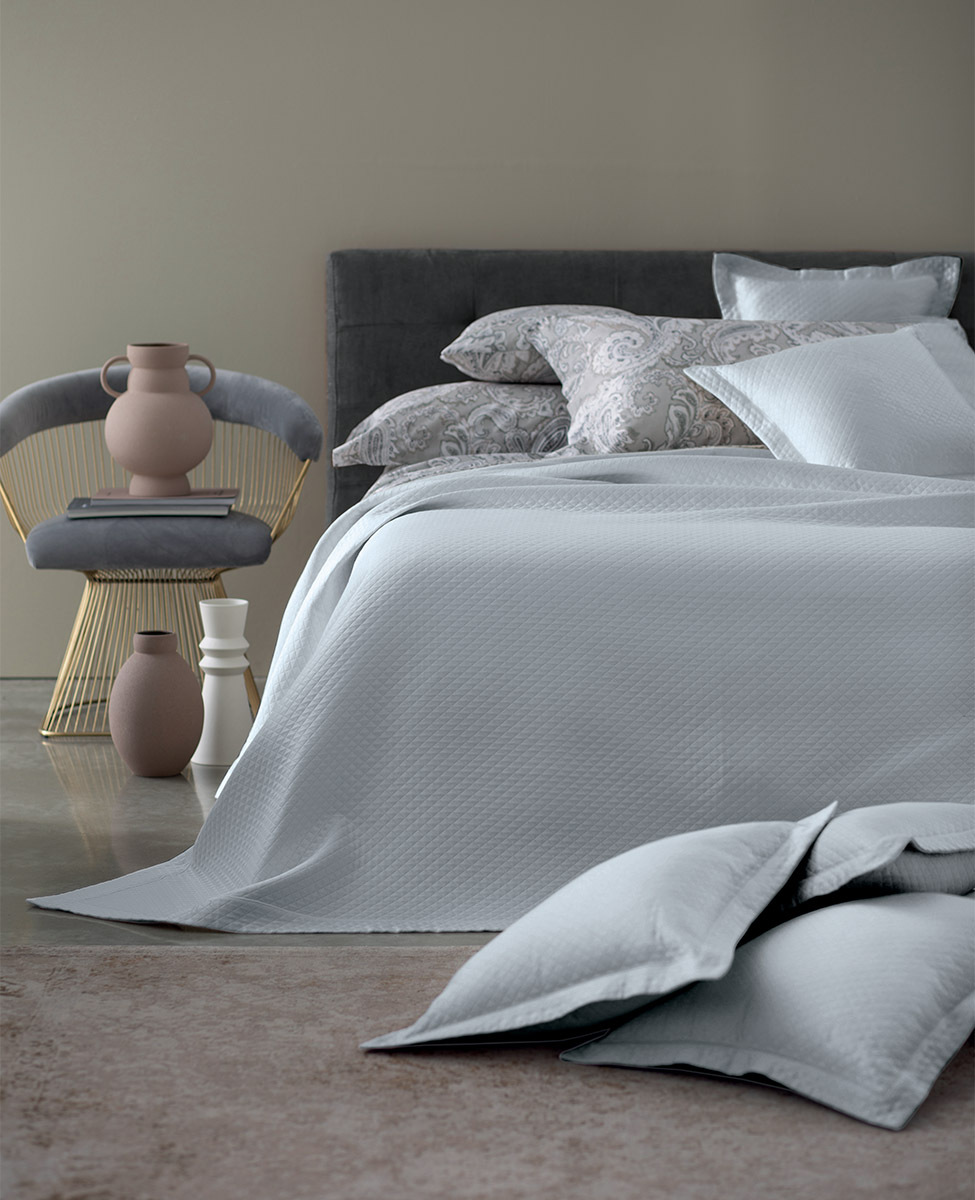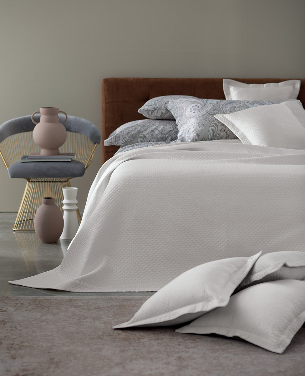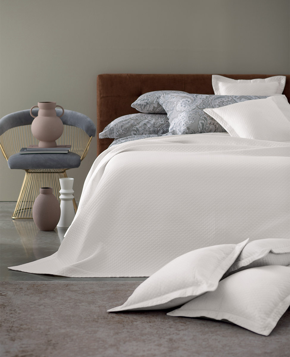 Copriletto matrimoniale in piqué tinta unita rifinito con angoli a cappuccio.