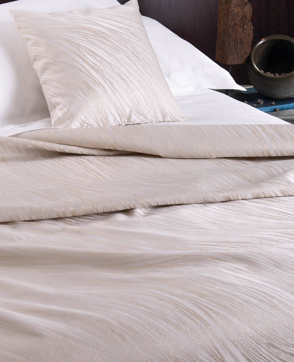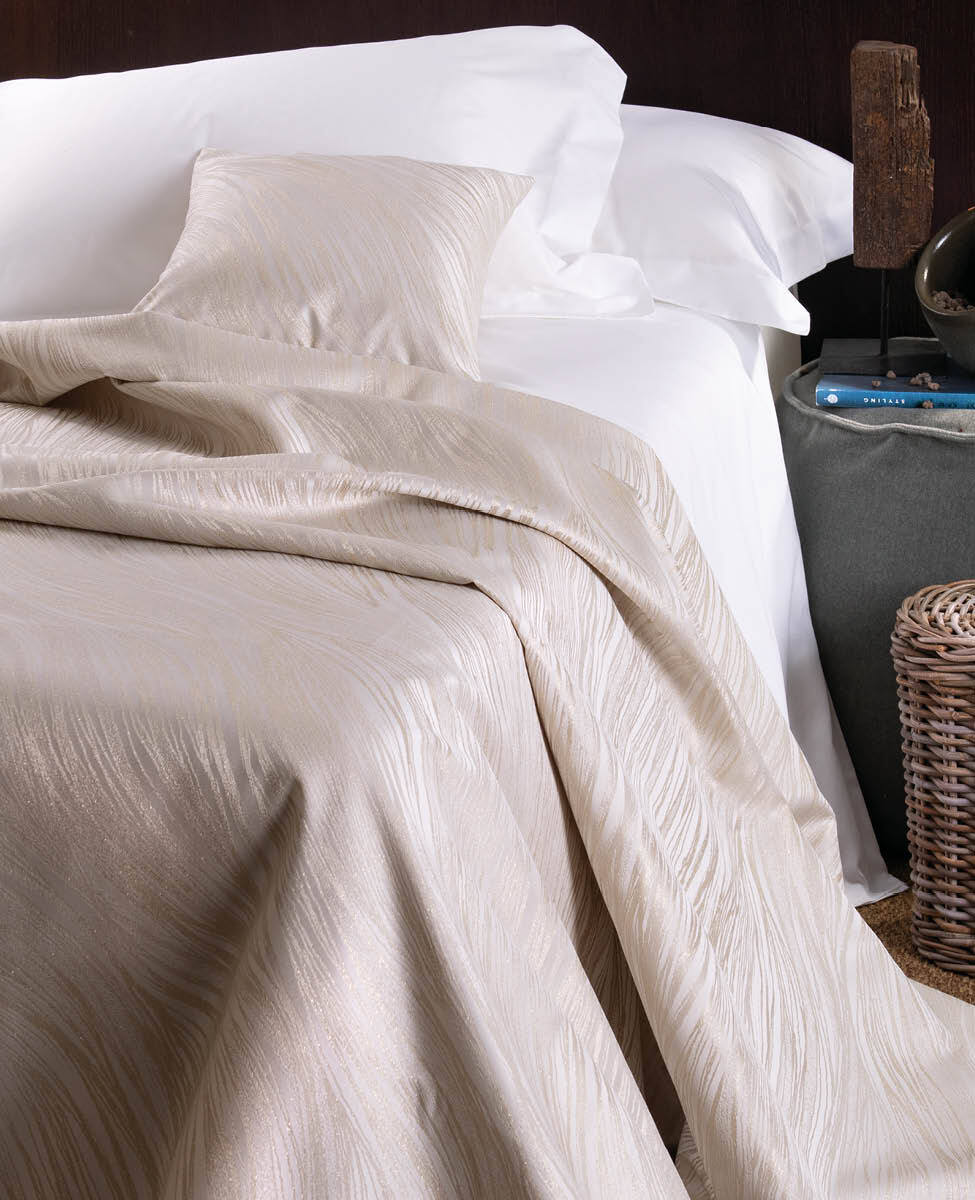 Copriletto liscio non trapuntato in jacquard rifinito con orlo di 6 cm ed angoli smussati.