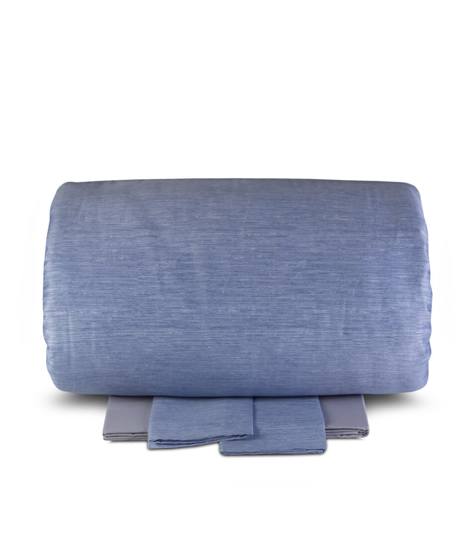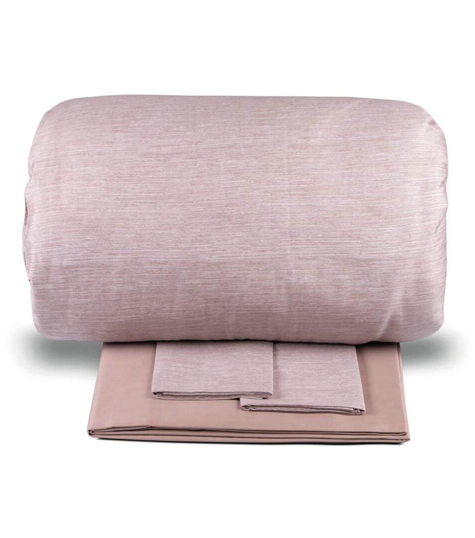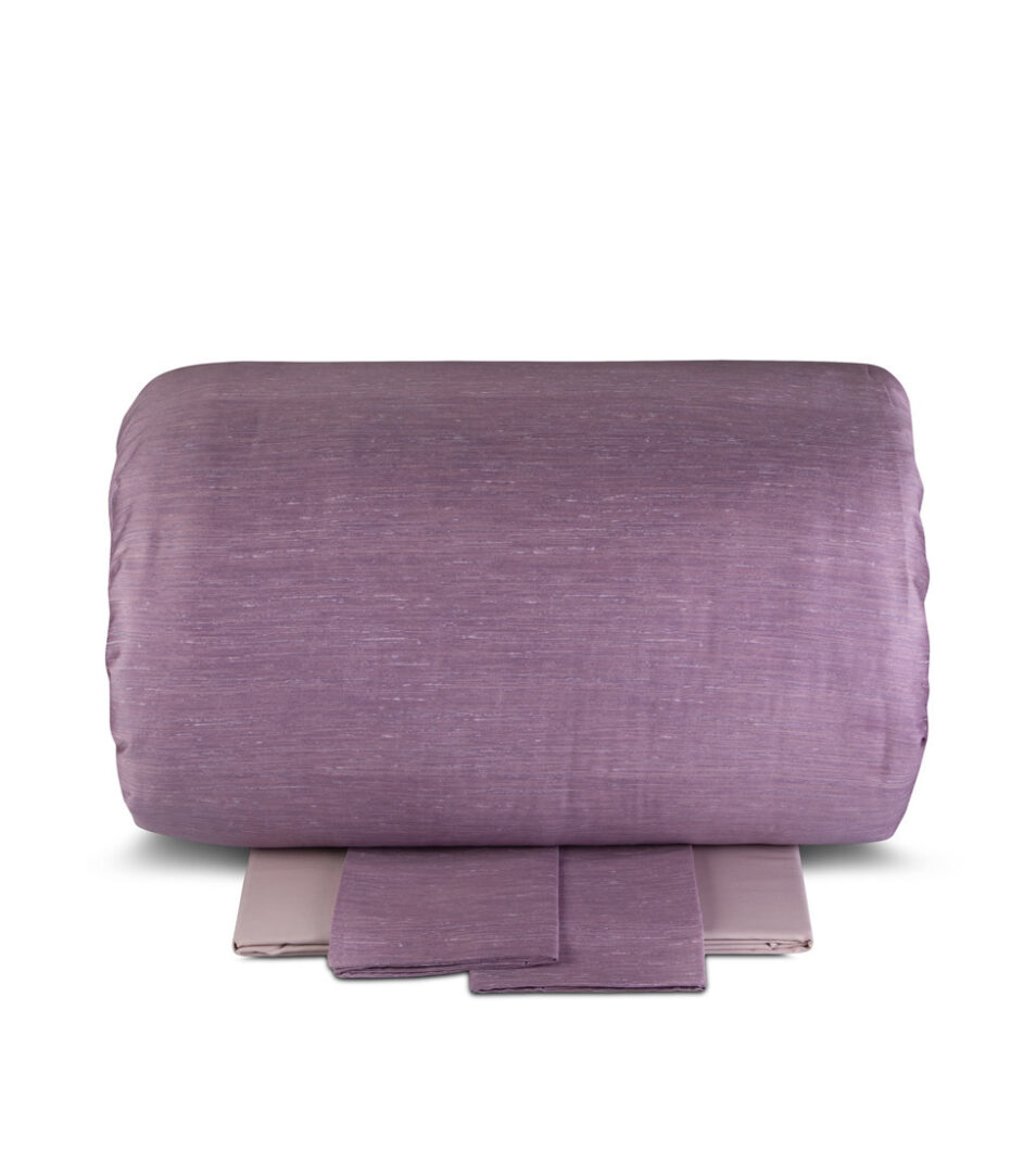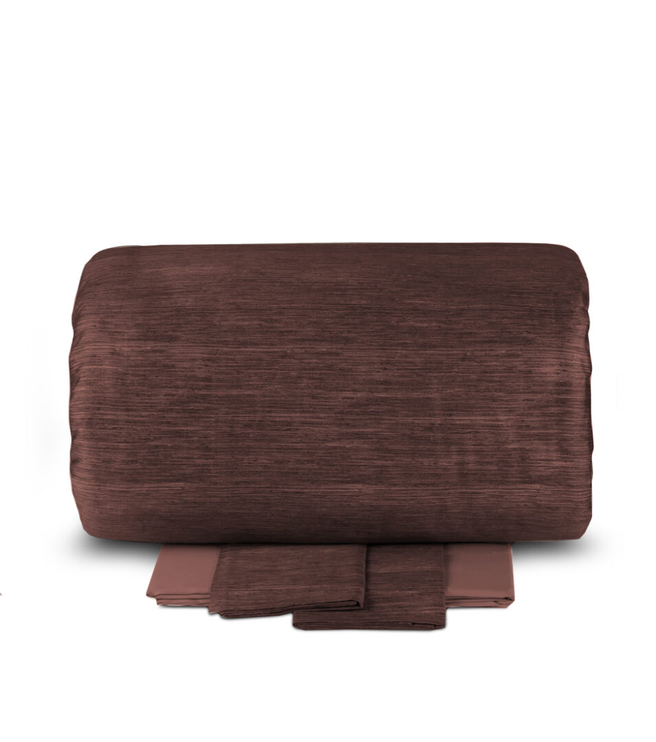 Completo copripiumino matrimoniale in raso stampato con trama ad effetto seta, sottosacca e lenzuolo sotto in raso tinta unita.