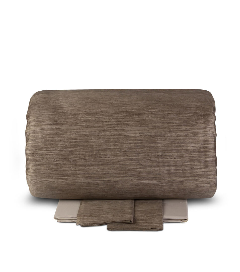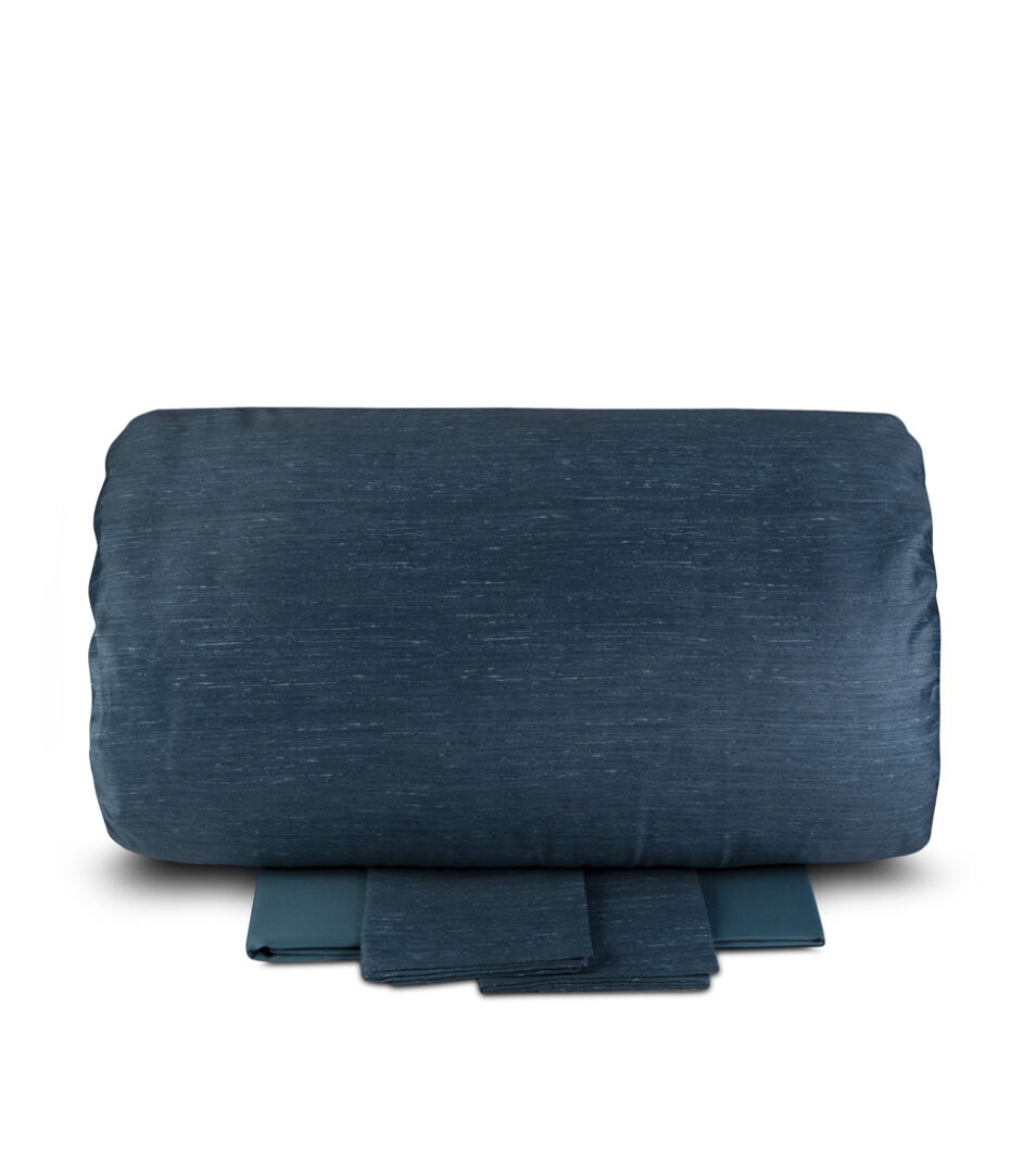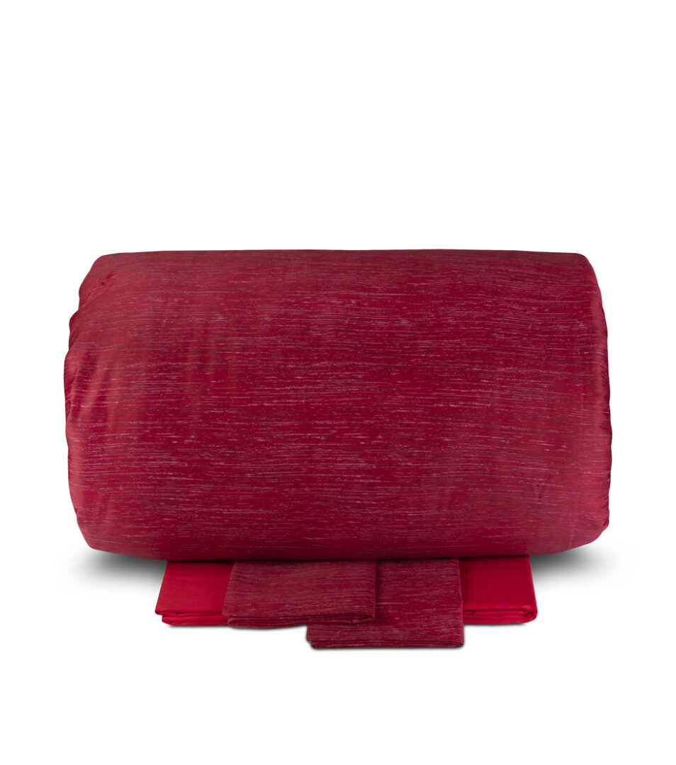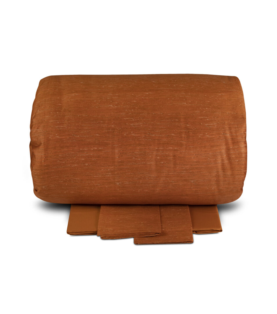 Completo copripiumino matrimoniale in raso stampato con trama ad effetto seta, sottosacca e lenzuolo sotto in raso tinta unita.