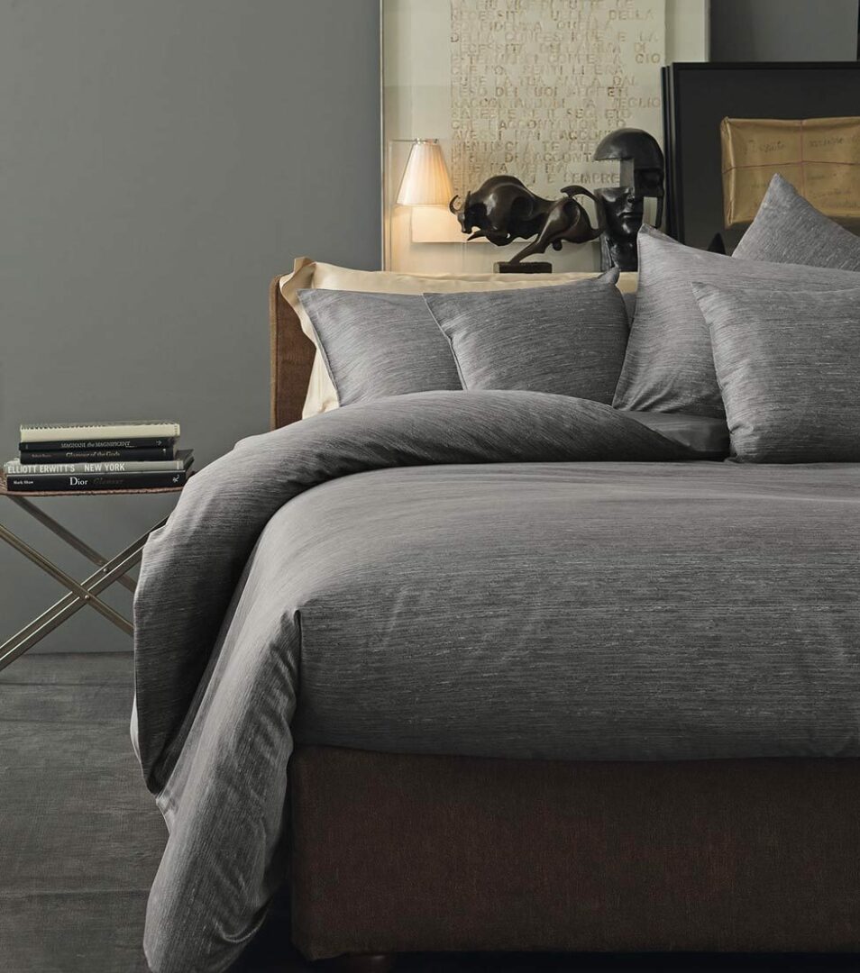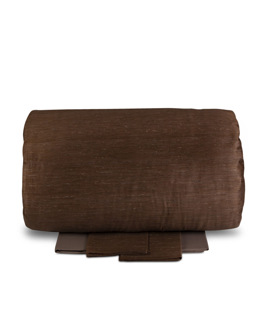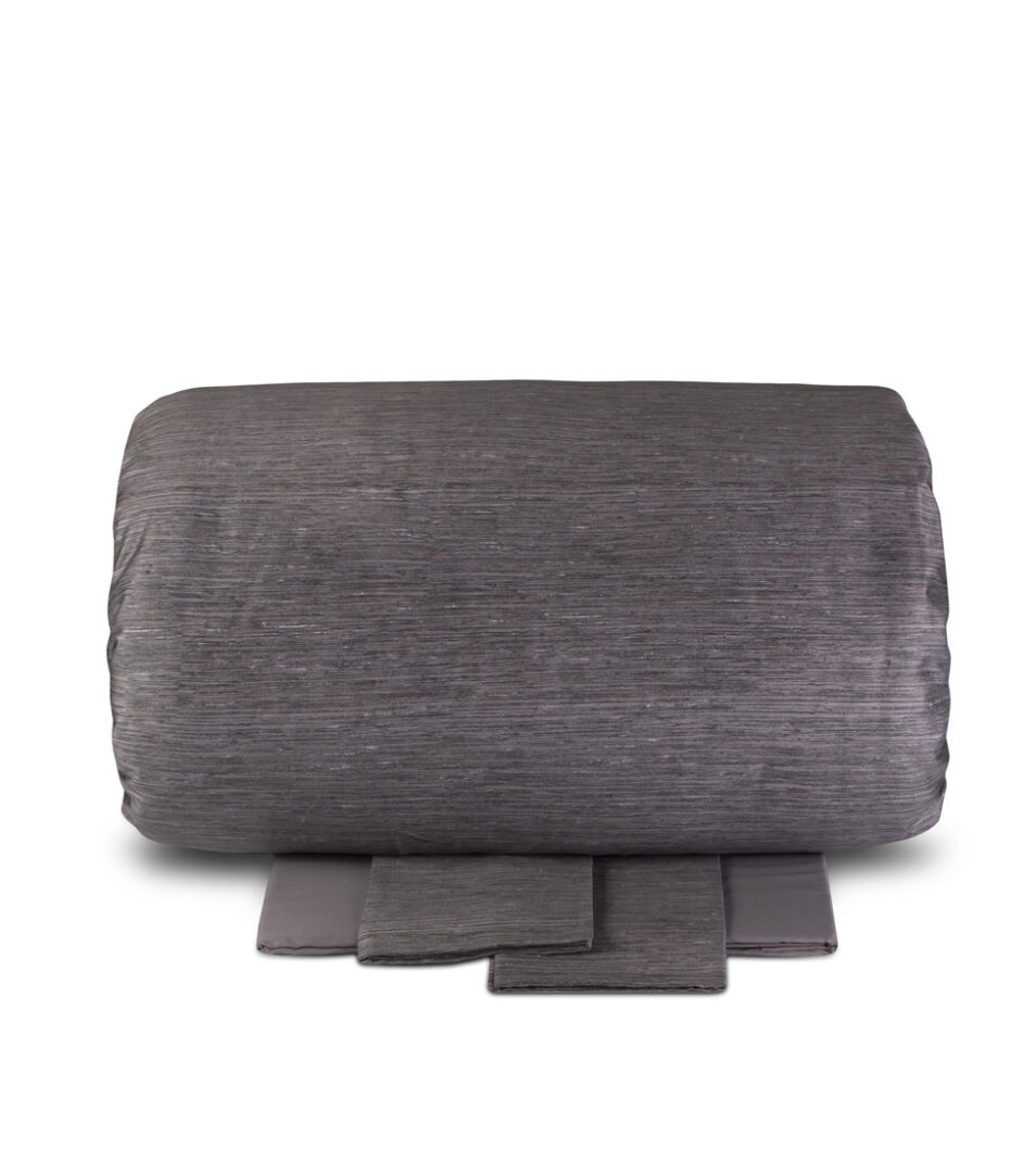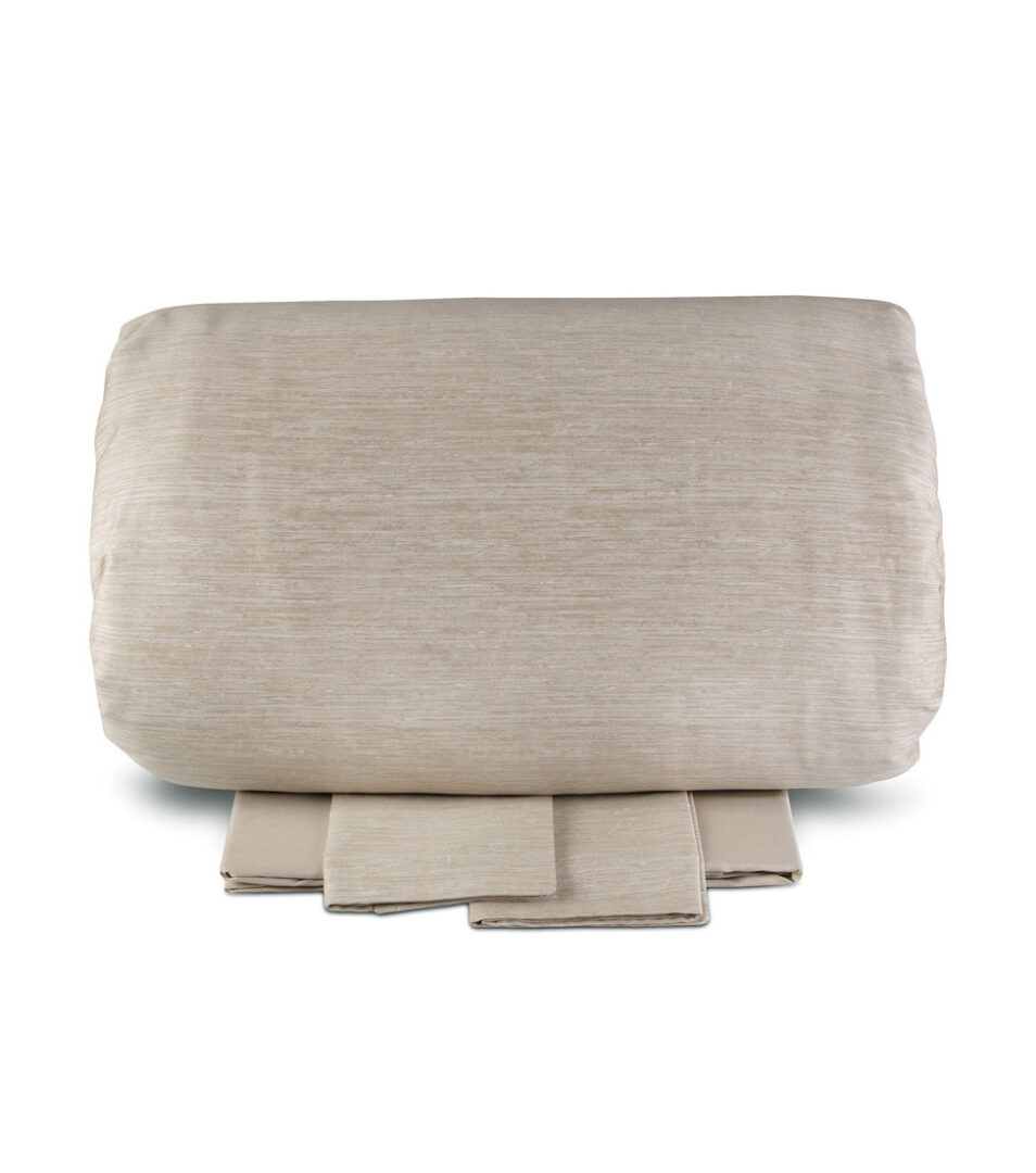 Completo copripiumino matrimoniale in raso stampato con trama ad effetto seta, sottosacca e lenzuolo sotto in raso tinta unita.