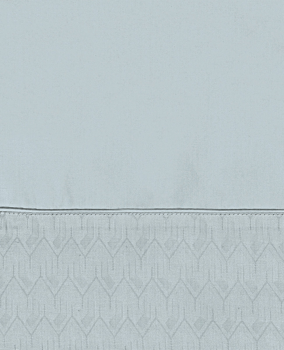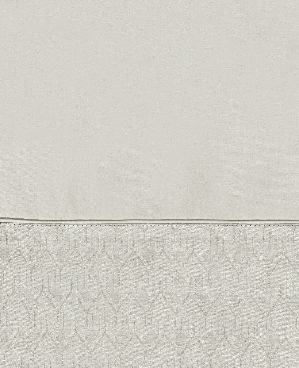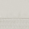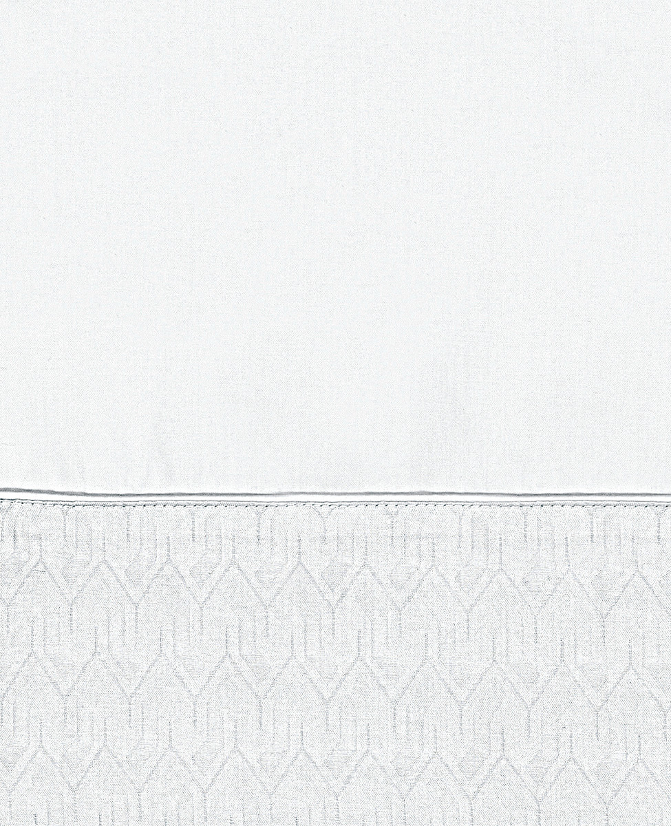 Completo copripiumino matrimoniale in jacquard di cotone rifinito con coda di topo tono su tono, sacca copripiumino con balza tinta unita, federe a sacchetto rifinite con coda di topo e retro tinta unita.