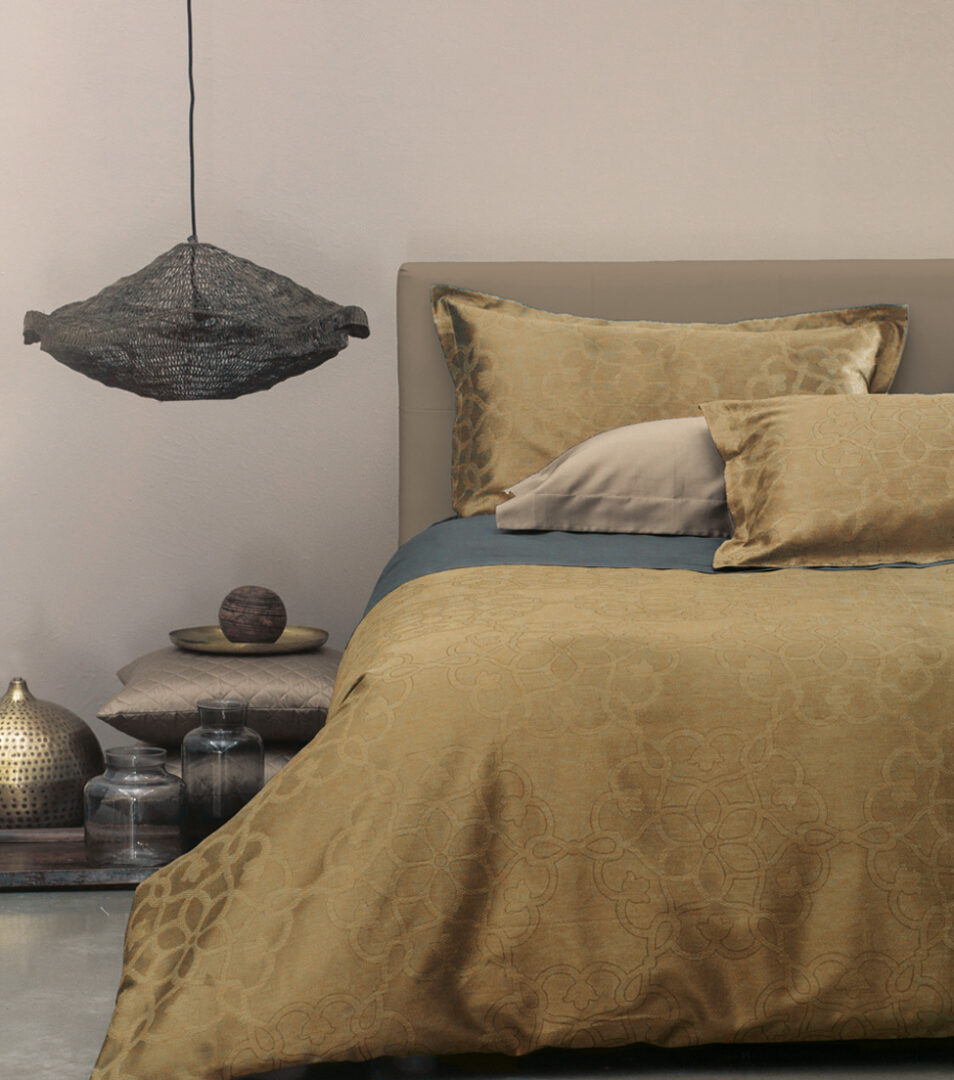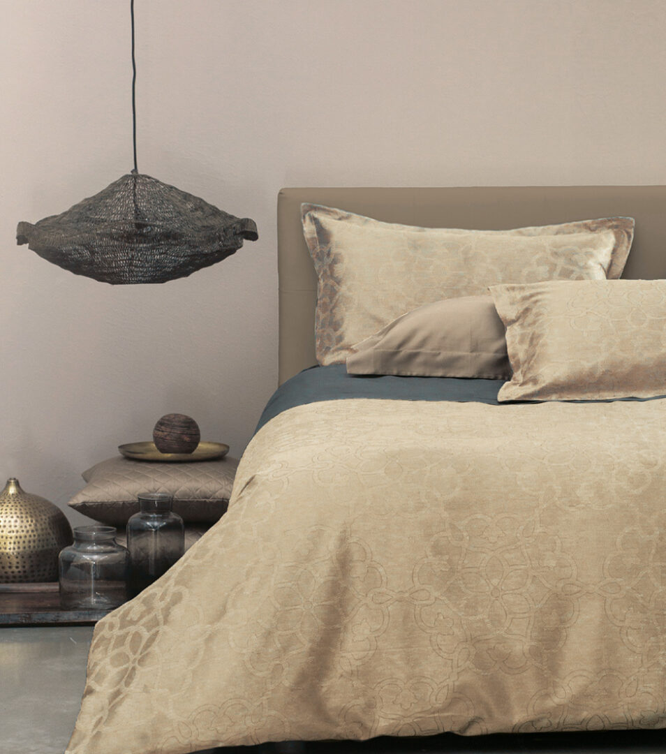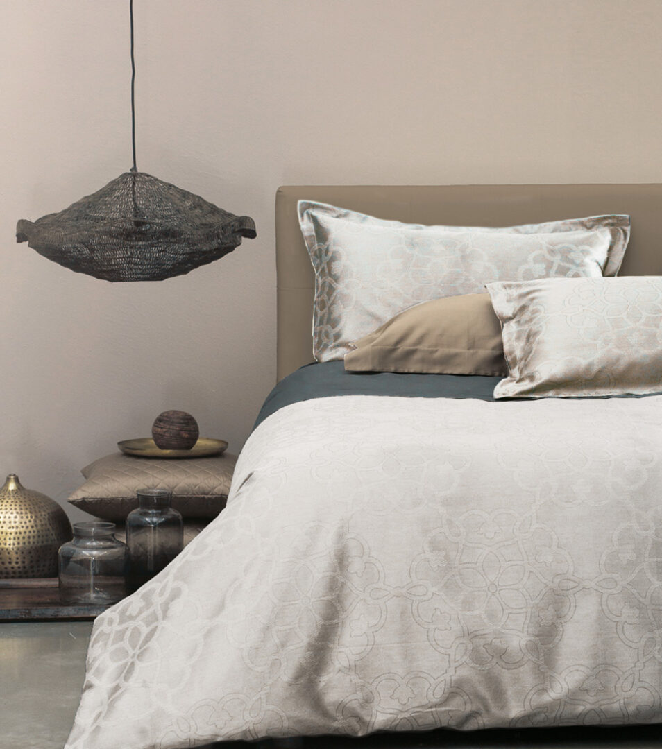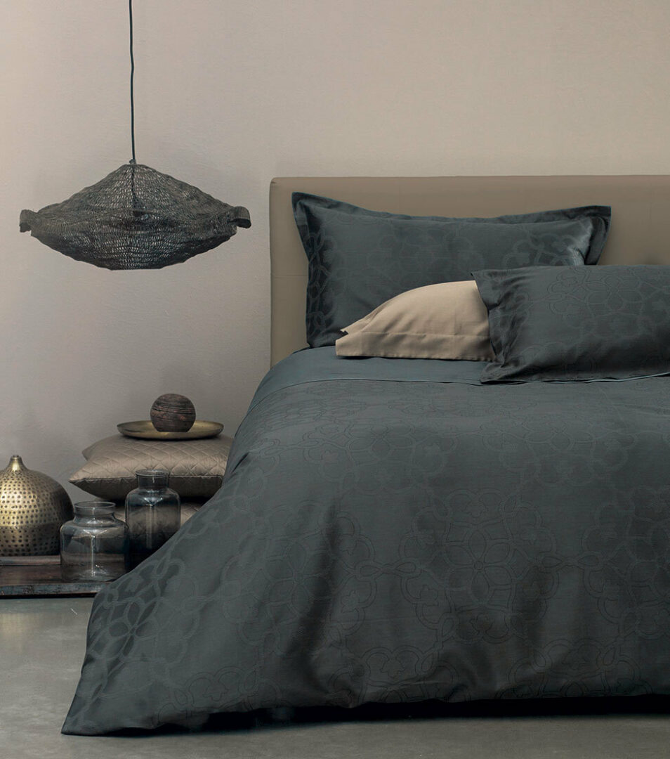 Completo copripiumino matrimoniale in jacquard di cotone con balza tinta unita, federe a 4 volani con fronte jacquard e retro tinta unita.