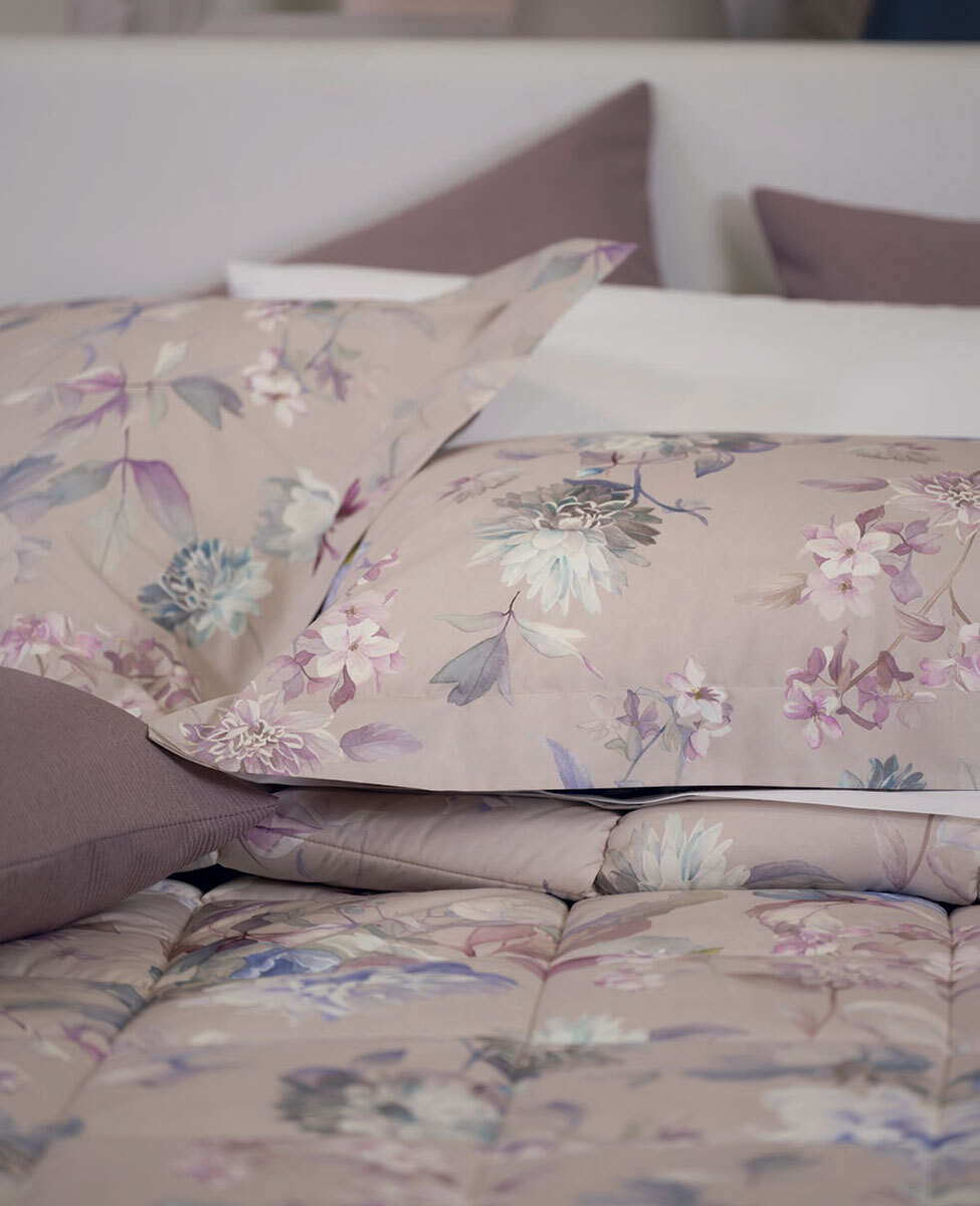 Parure copripiumino matrimoniale 3 pz in percalle con stampa all over, sottosacca in percalle tinta unita.