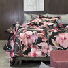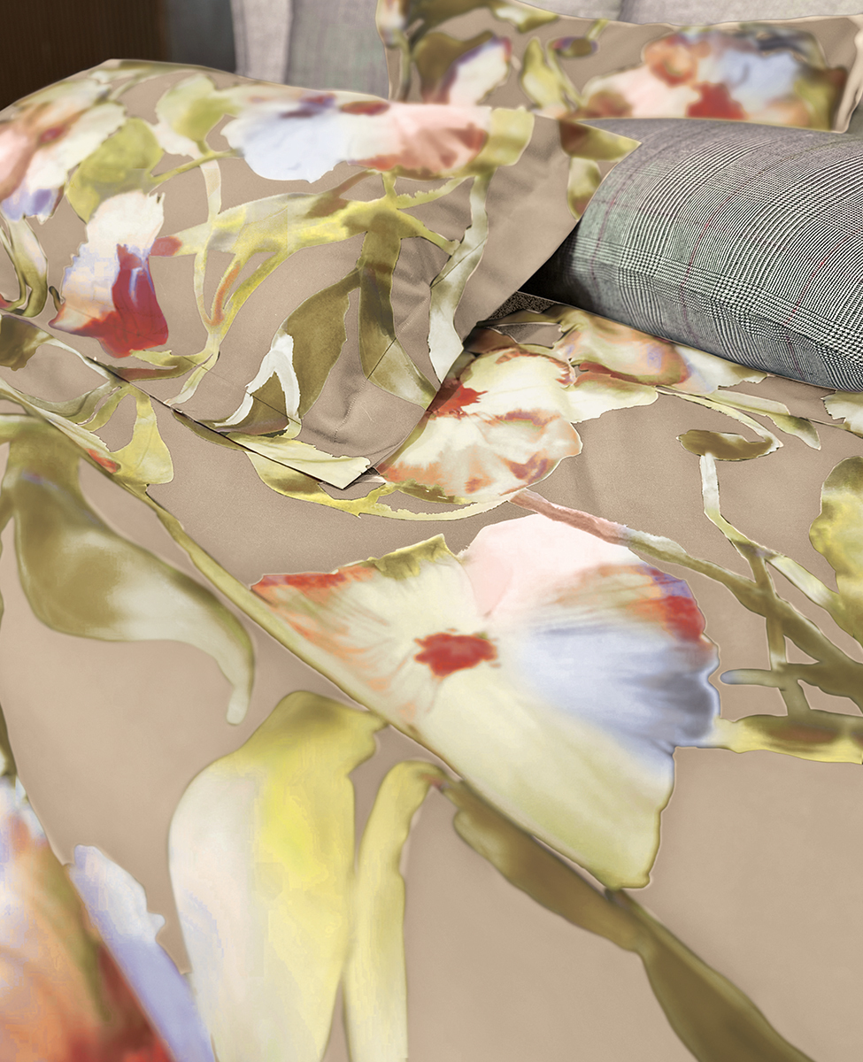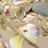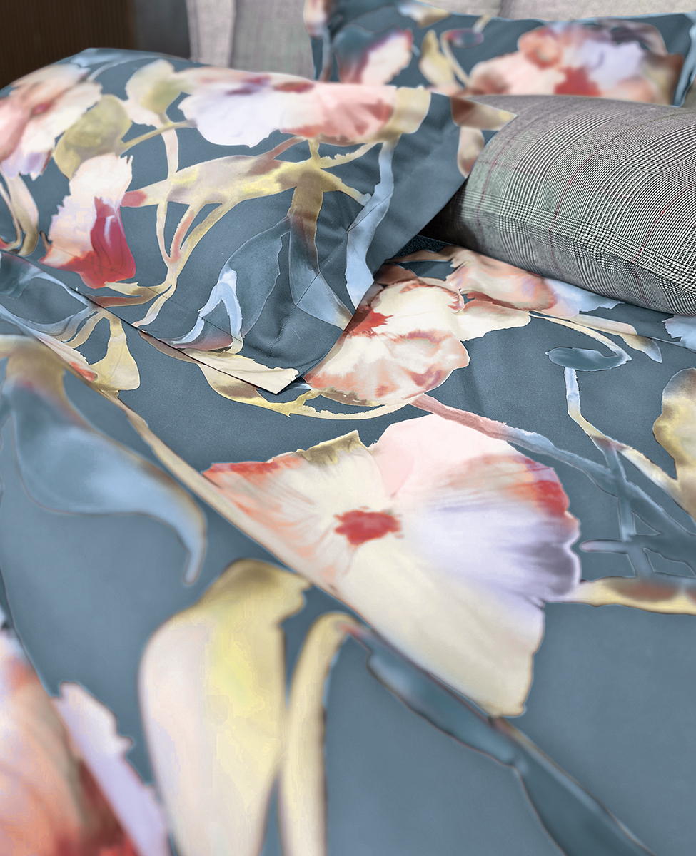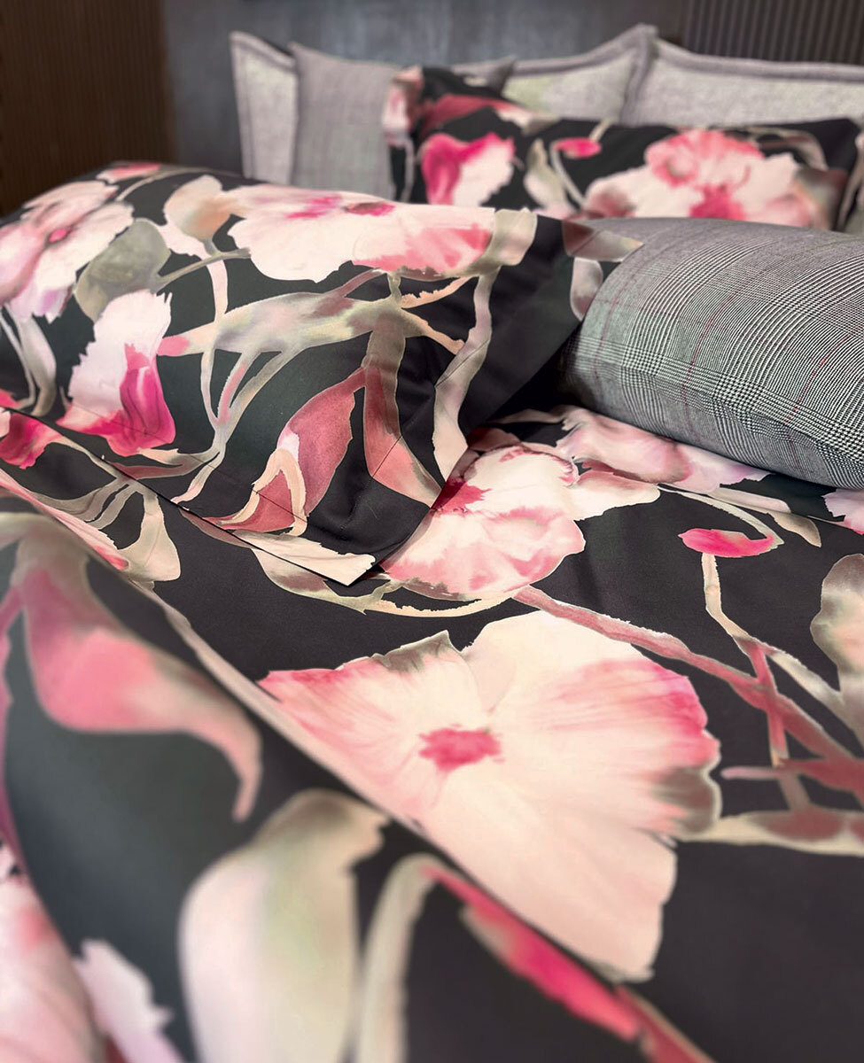 Completo copripiumino matrimoniale in raso di cotone con stampa all over, sottosacca e lenzuolo sotto in raso tinta unita.