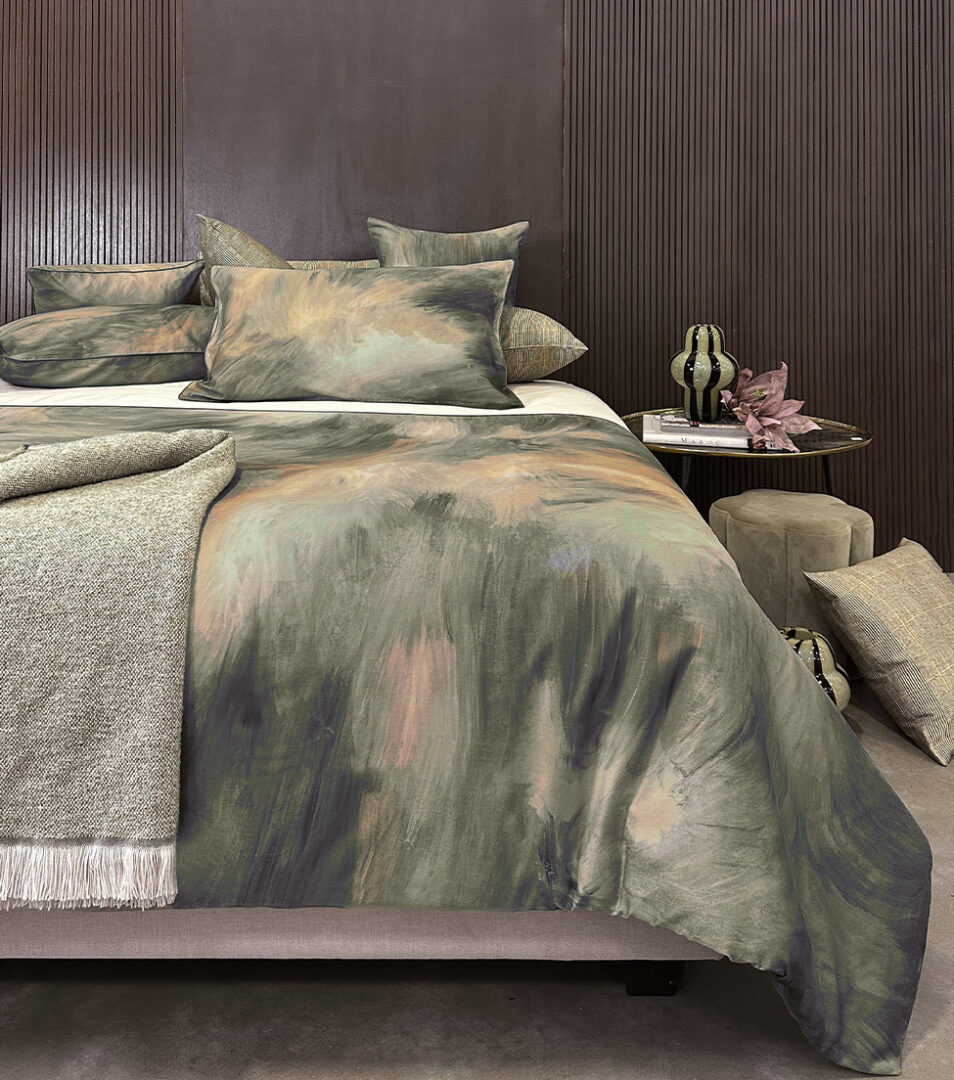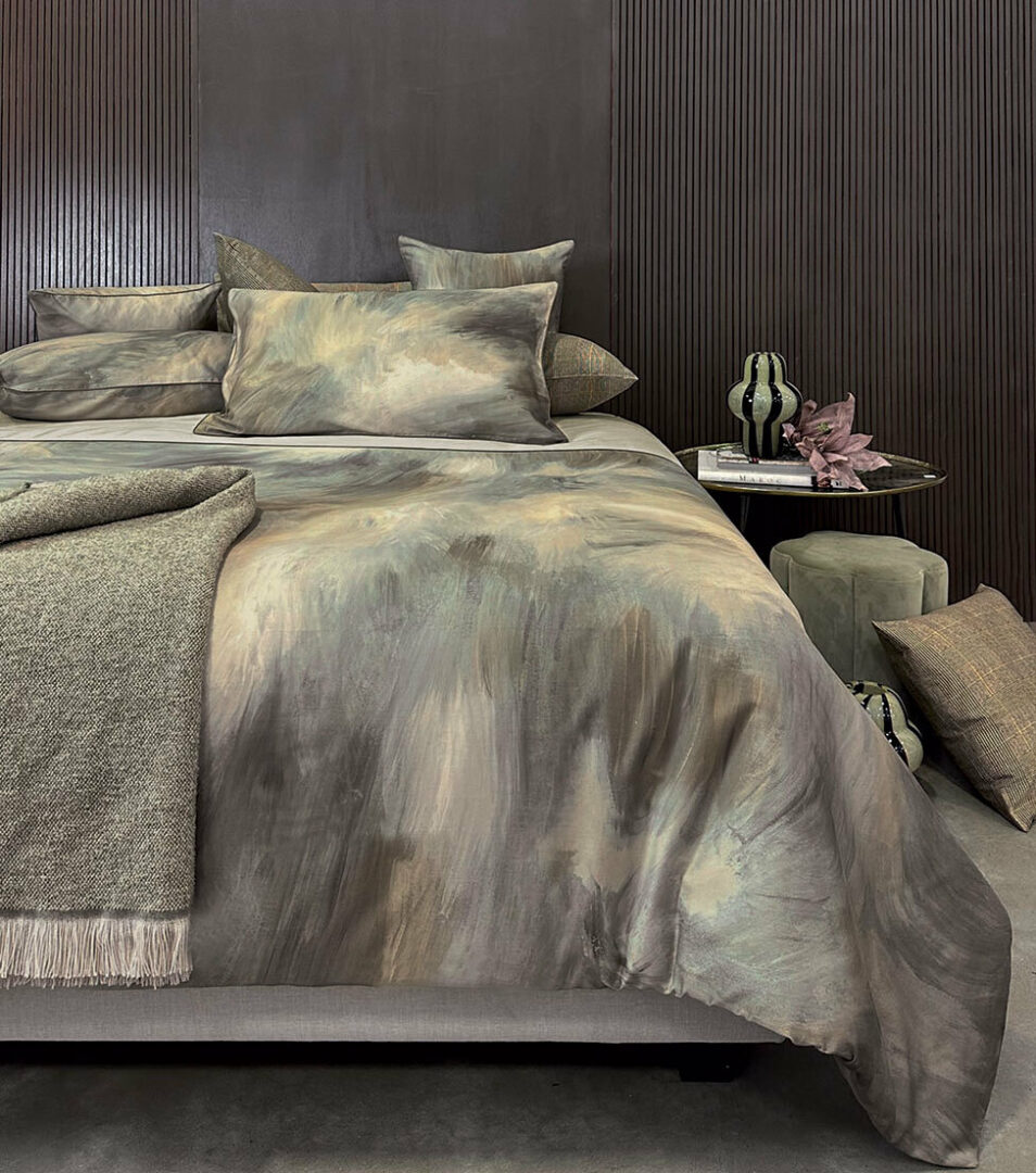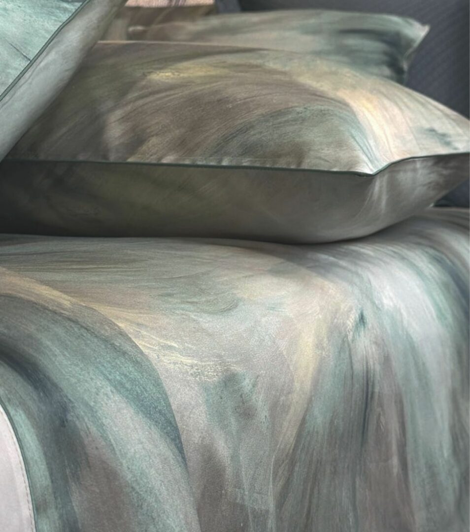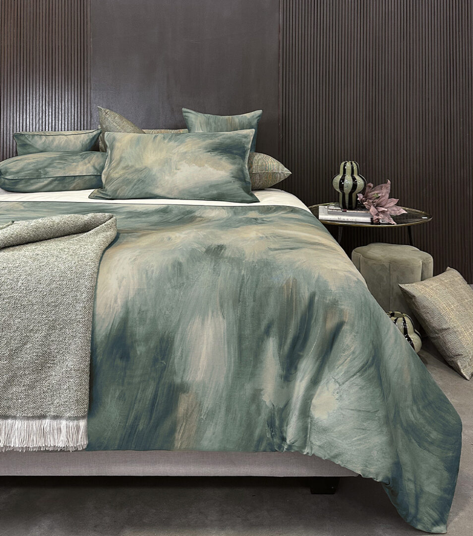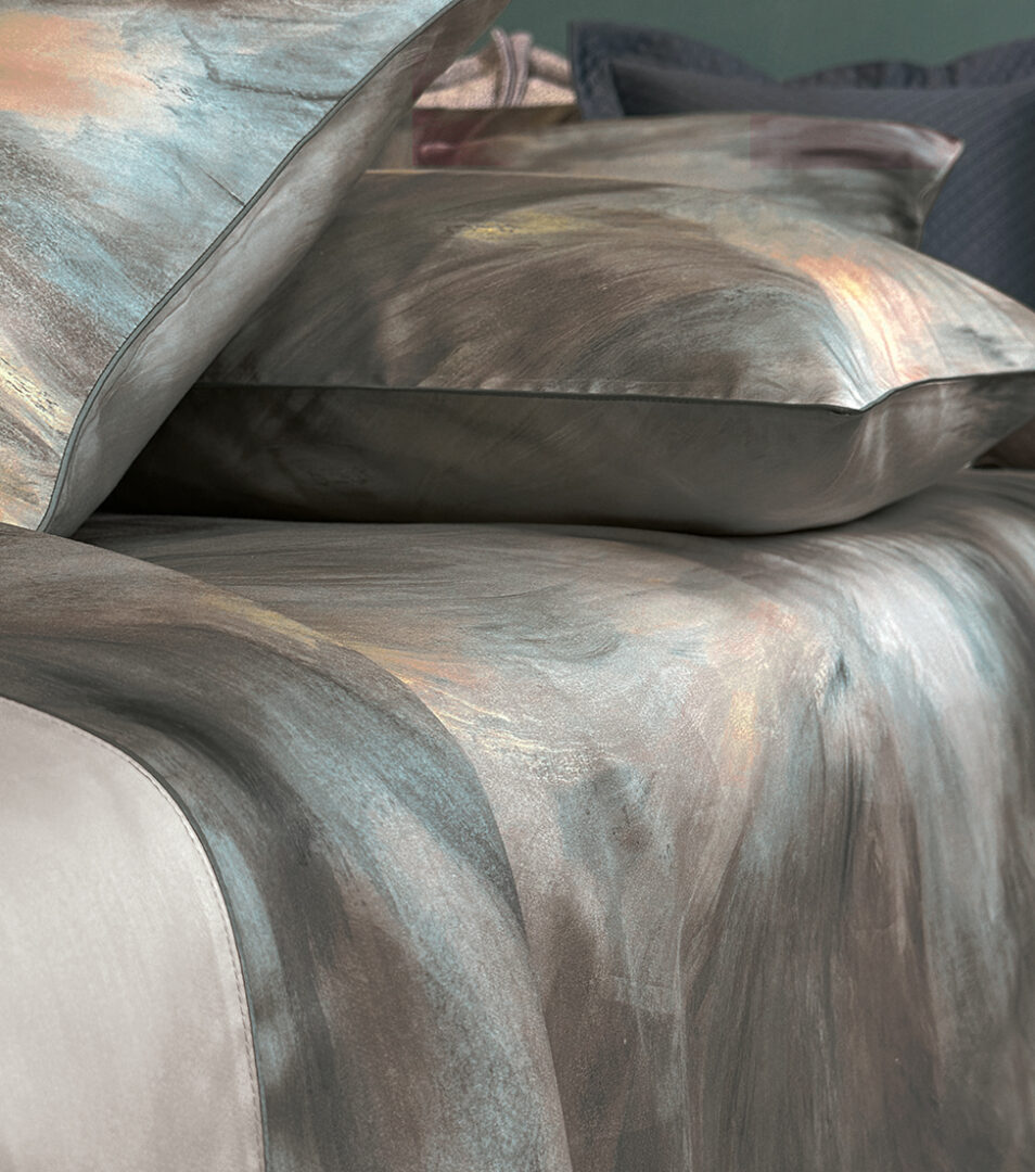 Completo copripiumino matrimoniale in raso di cotone con stampa all over, parte superiore con risvolta in tinta unita rifinita da piping, parte inferiore con stampa all over, federe a sacchetto stampate rifinite con coda di topo, sottosacca e lenzuolo sotto in raso tinta unita.