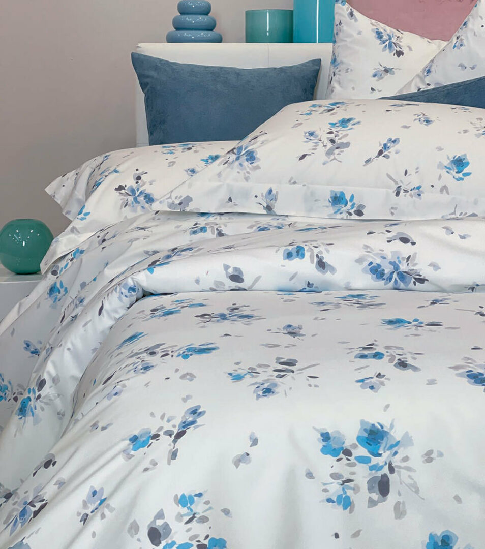 Parure copripiumino matrimoniale 3 pz in percalle con stampa all over, sottosacca in percalle tinta unita.
