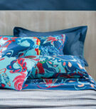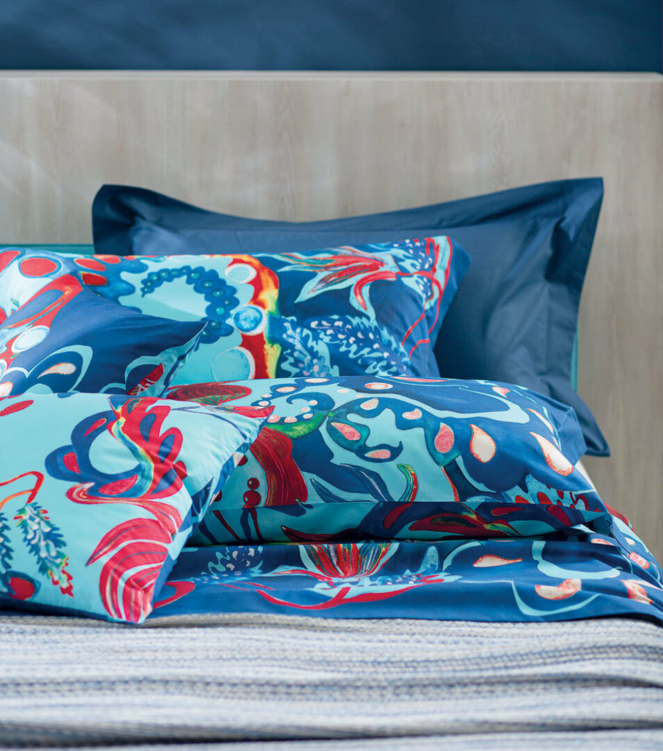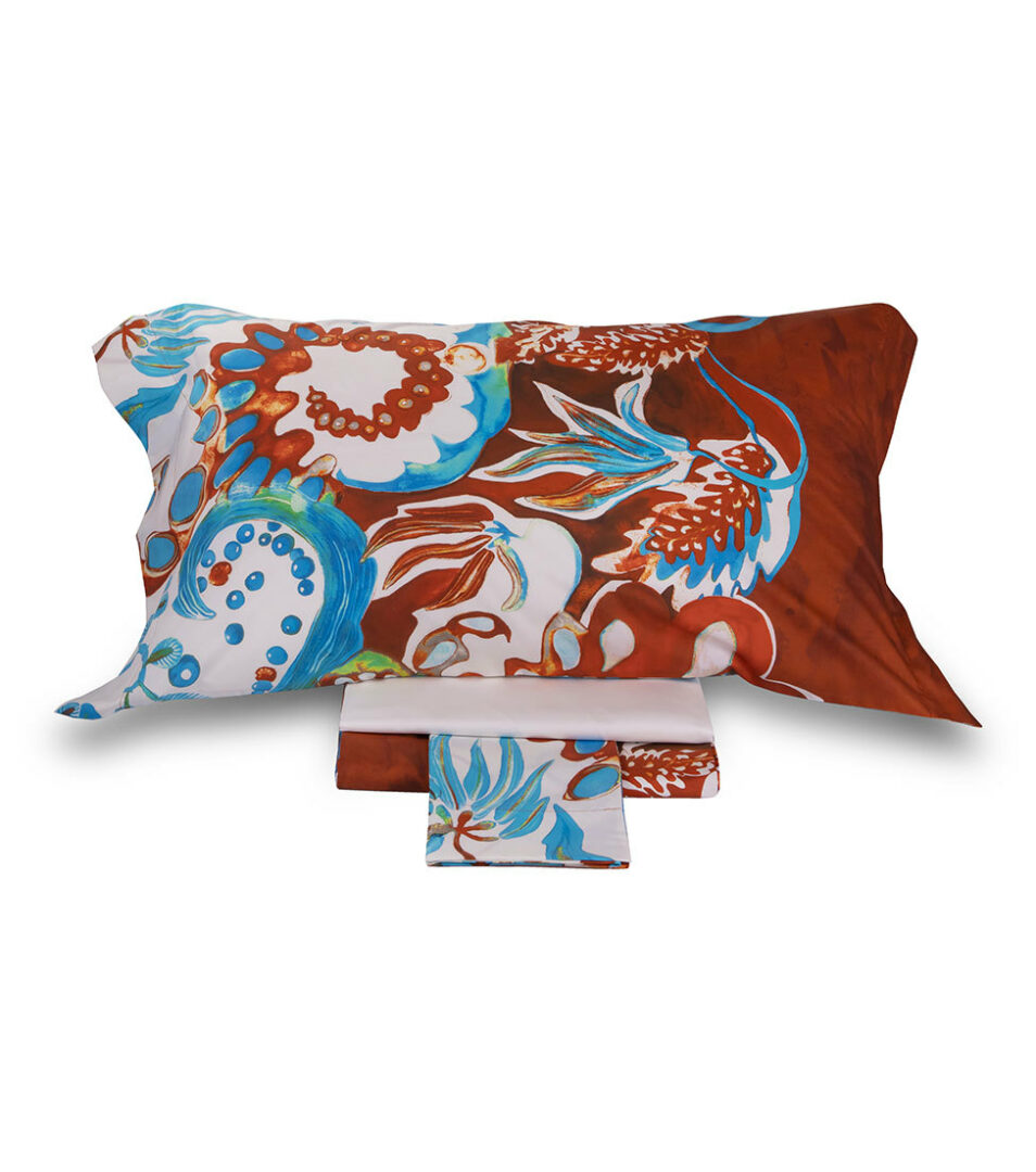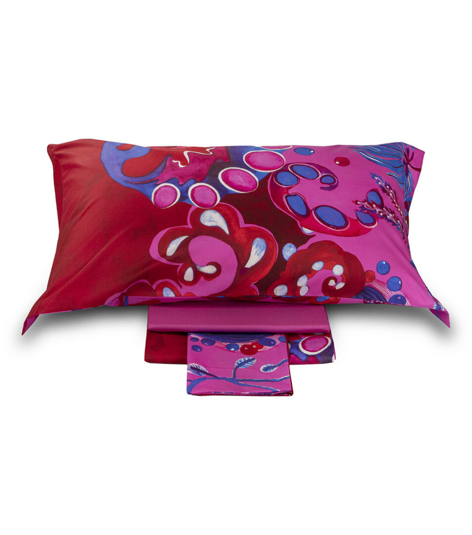 Completo lenzuola matrimoniale con colorata stampa balzata, lenzuolo sotto in percalle tinta unita. L’essenza della primavera. Colori vivaci e sgargianti accostati con maestria e creatività.