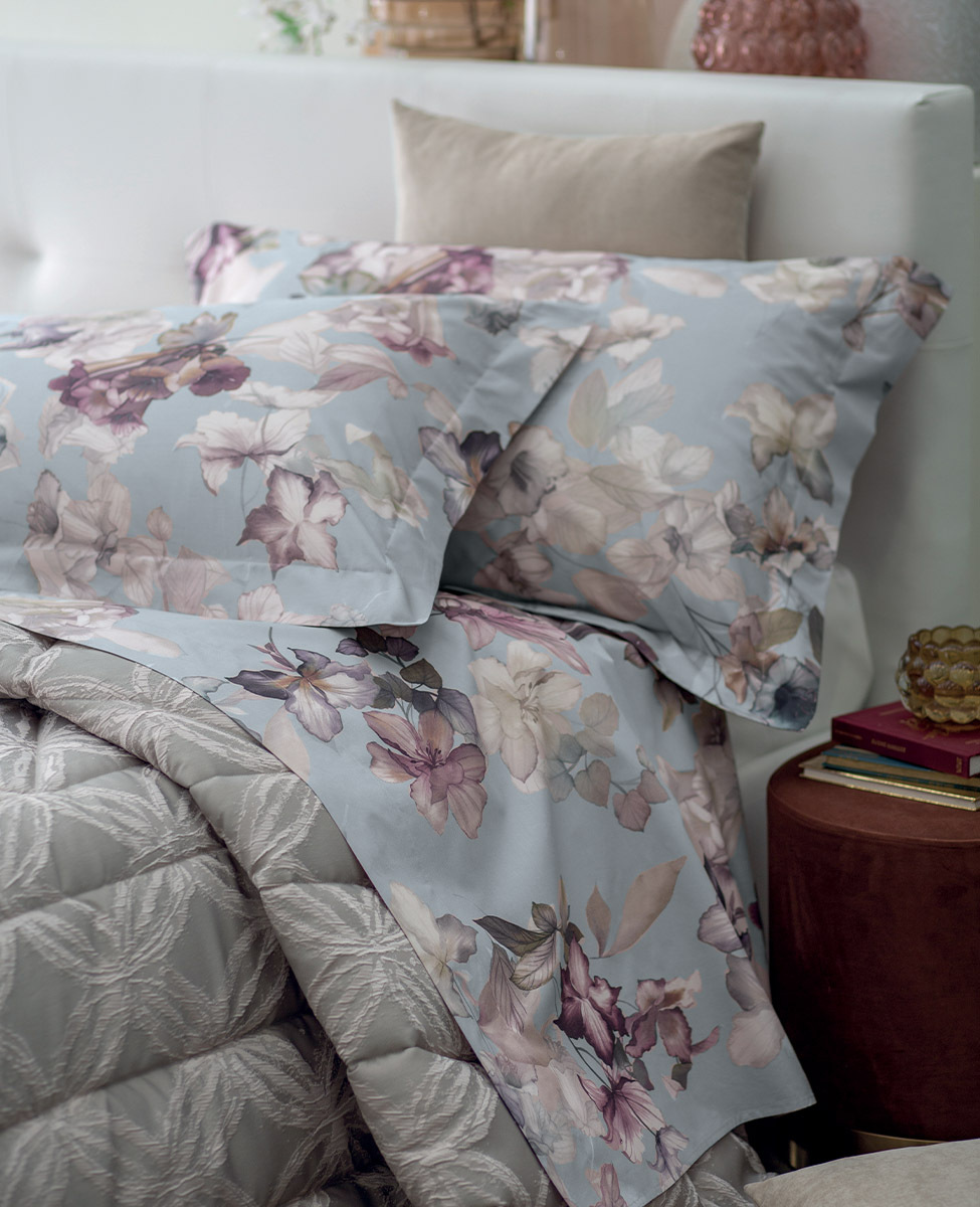 Completo lenzuola per letto singolo in percalle di cotone stampato con lenzuolo sotto in percalle tinta unita.
