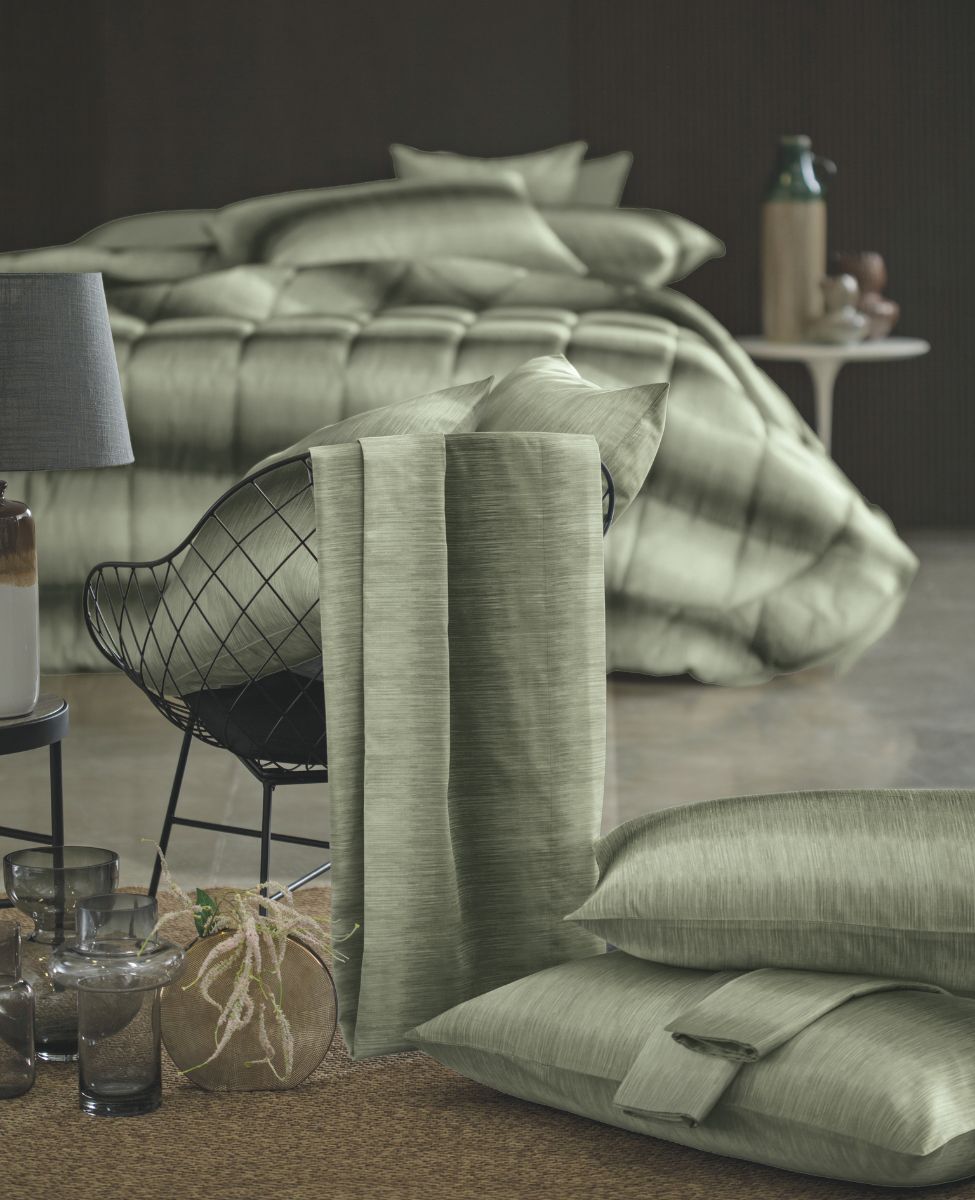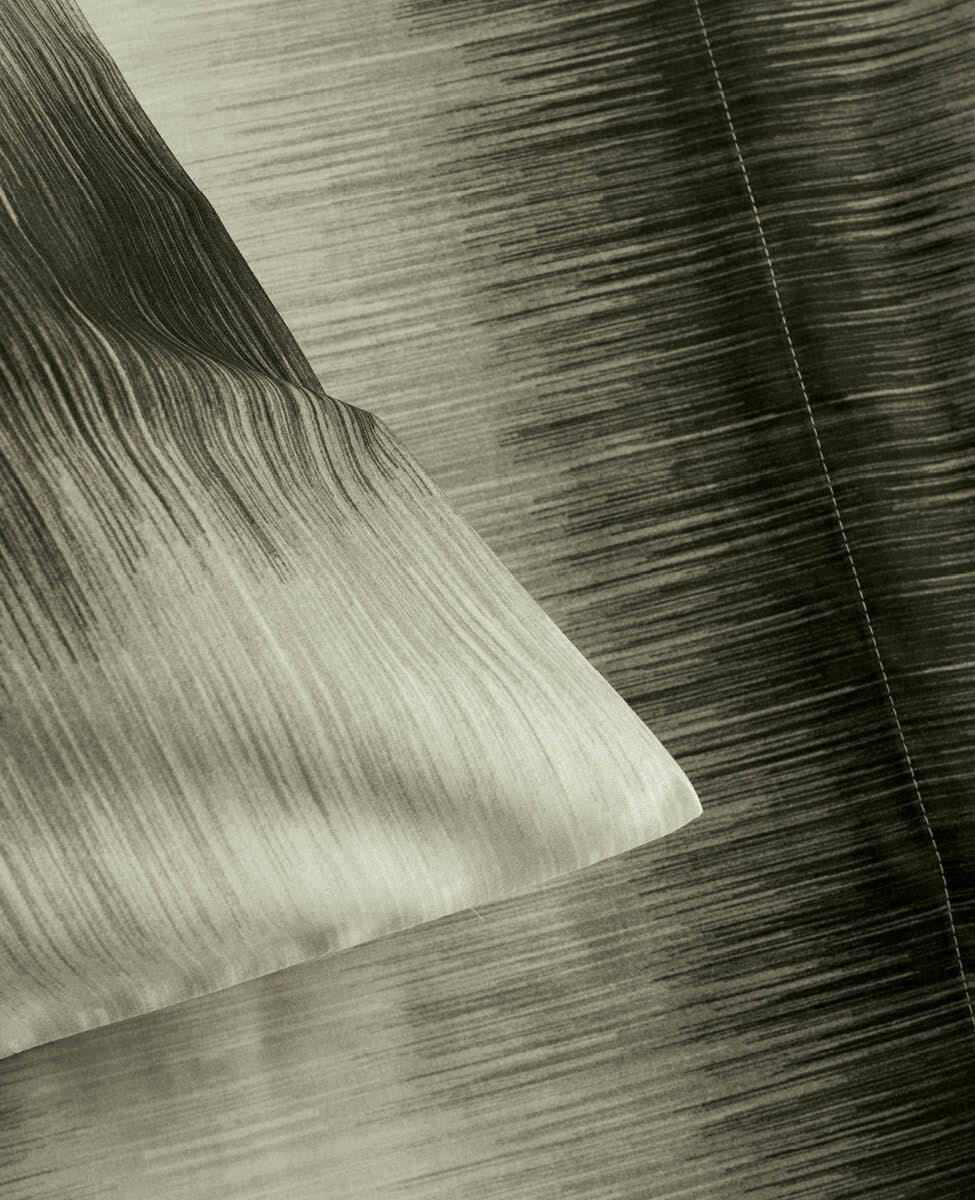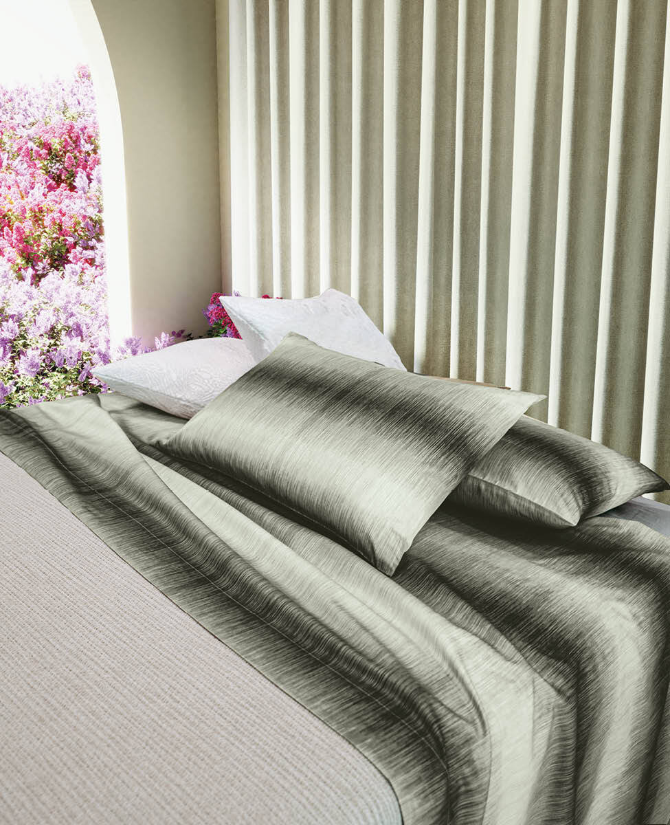 Completo lenzuola matrimoniale in raso di cotone stampato con microfantasia, lenzuolo sotto in raso tinta unita.