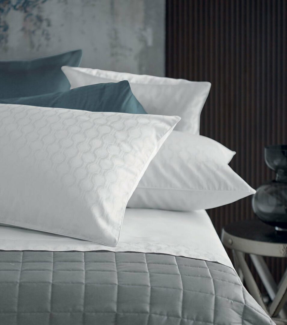 Completo lenzuola matrimoniale in jacquard di cotone rifinito con coda di topo tono su tono, lenzuolo sopra tinta unita con fascia applicata jacquard, federe a sacchetto rifinite con coda di topo e retro tinta unita.