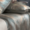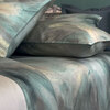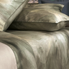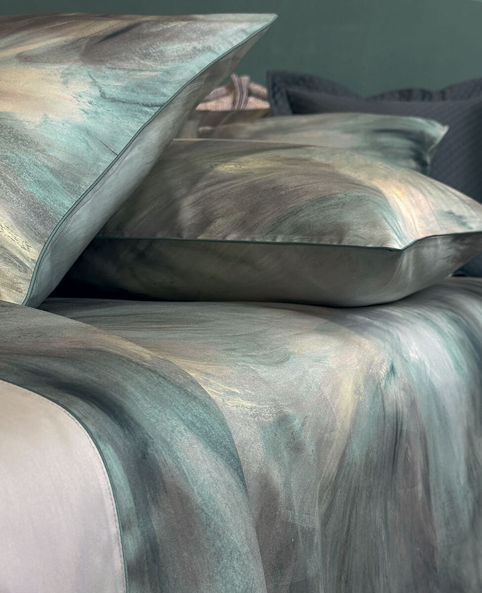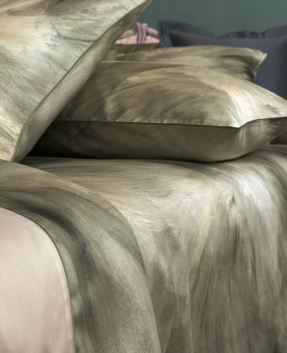 Completo lenzuola matrimoniale in raso di cotone con bordo di 8 cm in tinta unita rifinito con coda di topo, federe a sacchetto stampate rifinite con coda di topo, lenzuolo sotto in raso tinta unita.