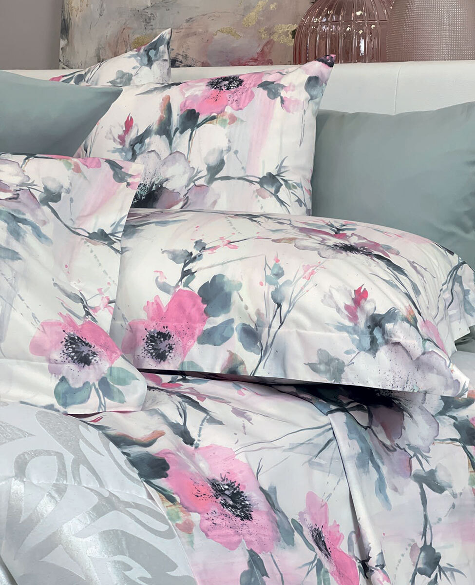 Completo lenzuola matrimoniale in percalle con stampa all over, lenzuolo sotto in percalle tinta unita.