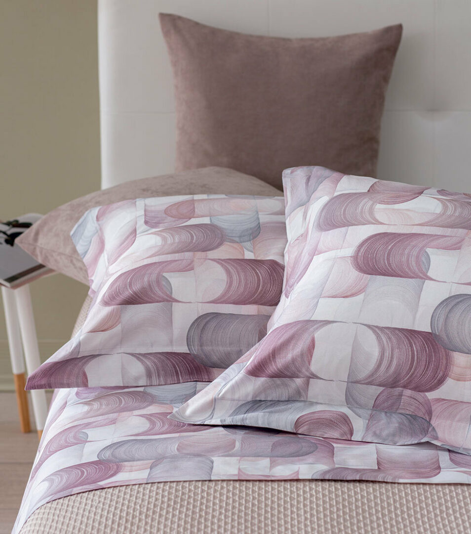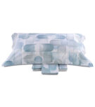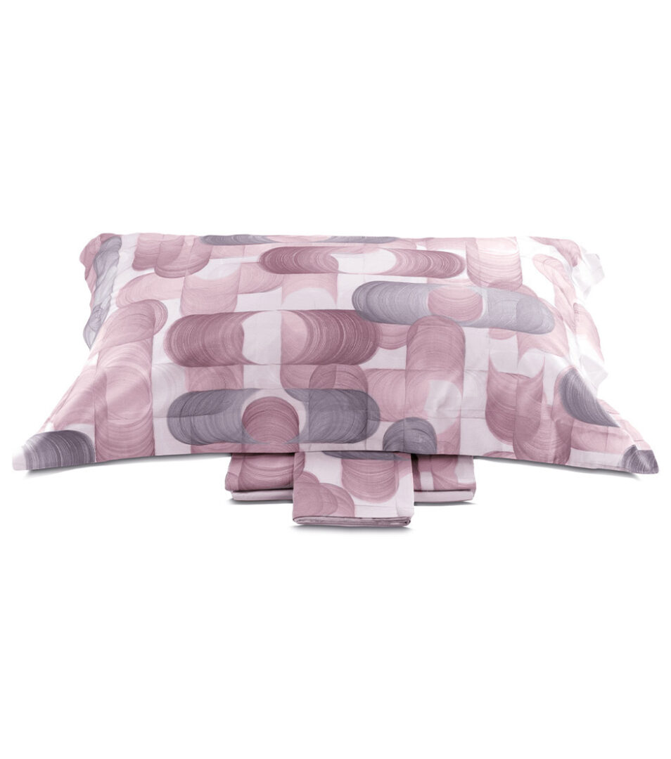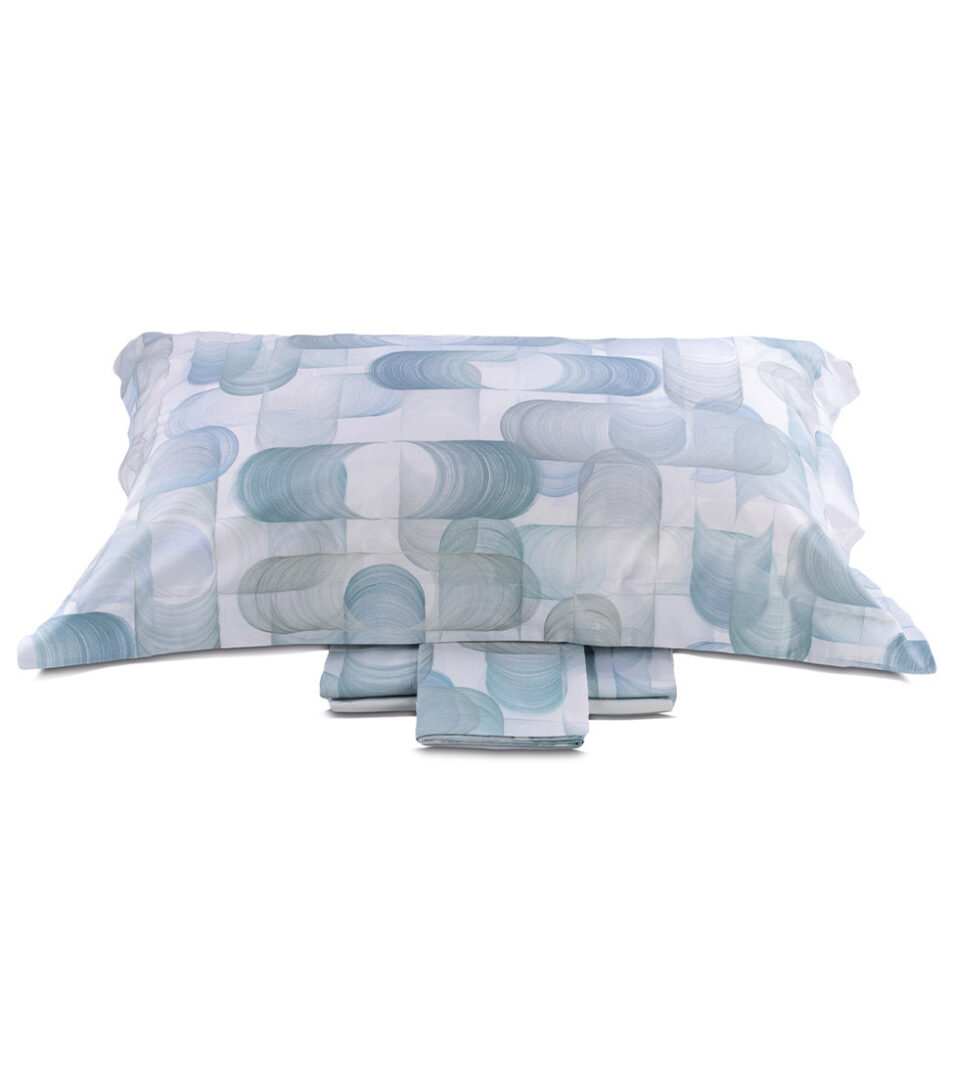 Completo modello lenzuola-copriletto estivo matrimoniale 4 pezzi con stampa all over su lenzuolo sopra e federe, lenzuolo sotto in percalle tinta unita.