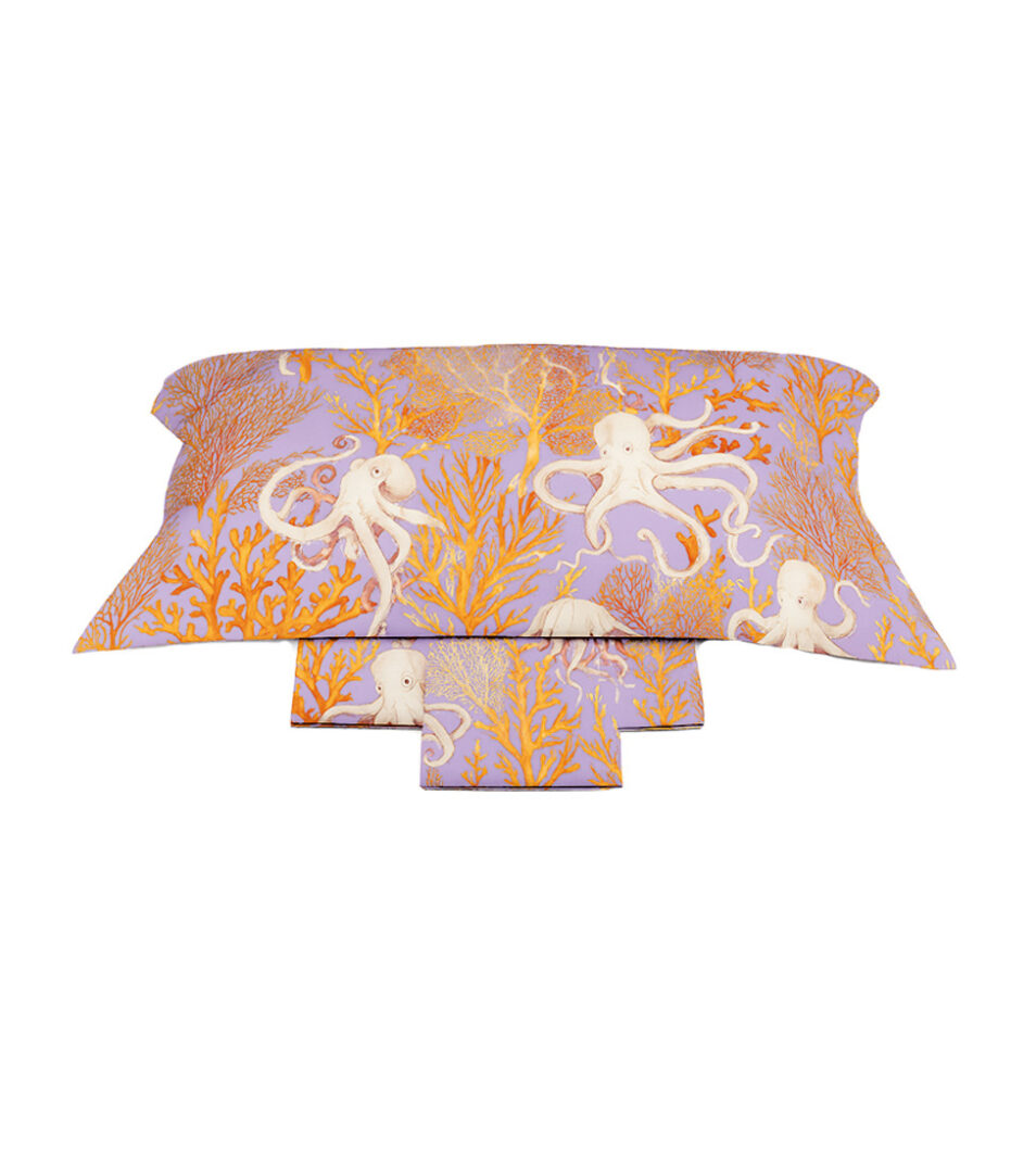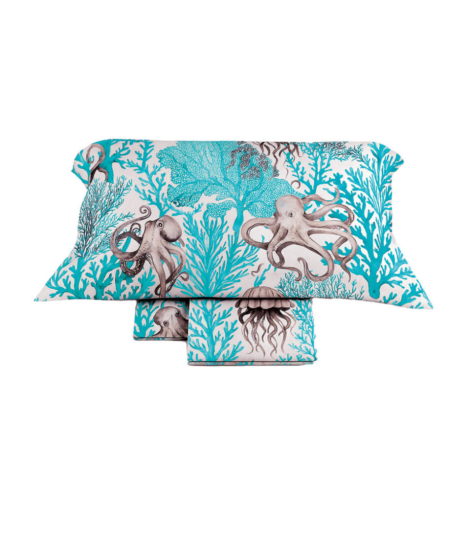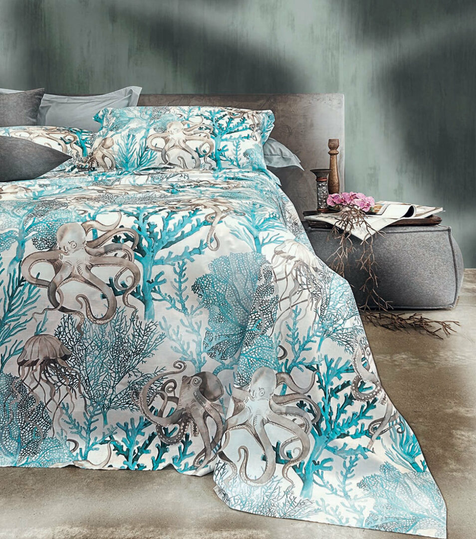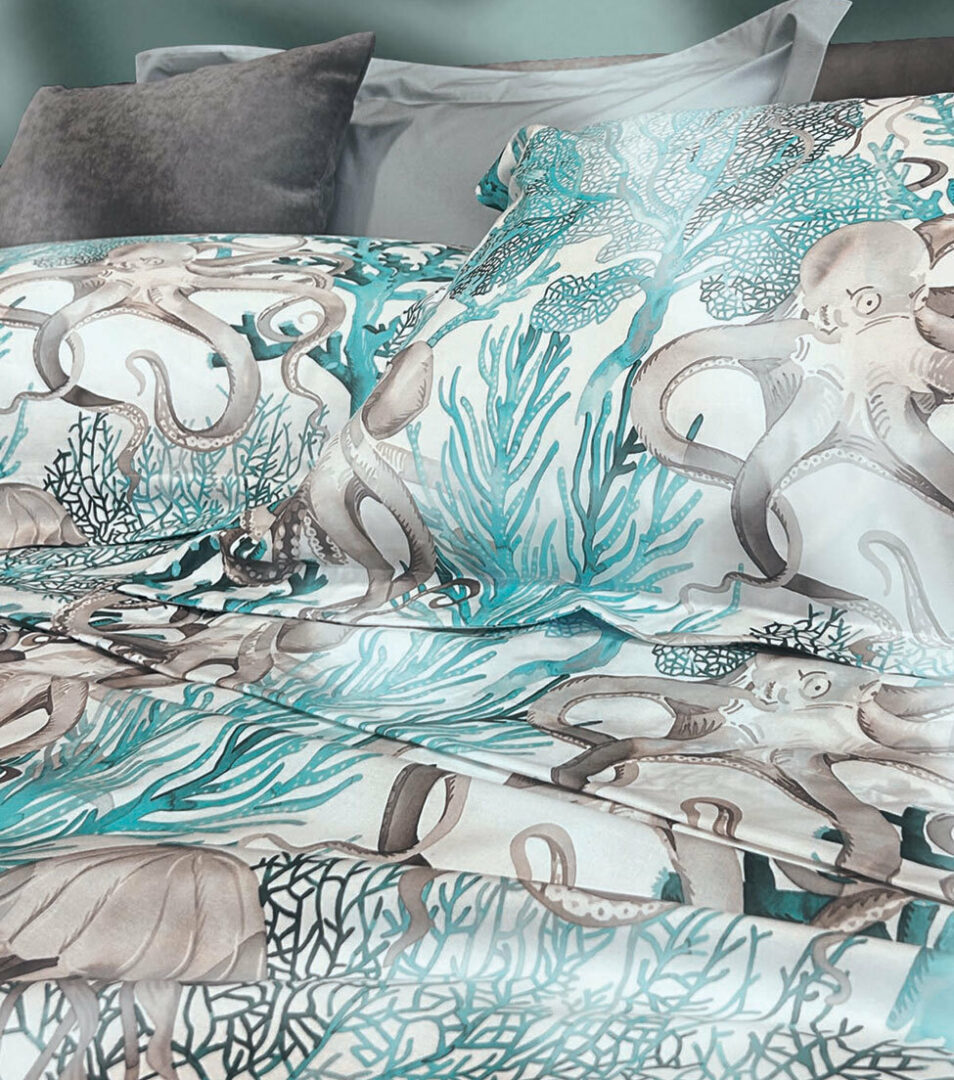 Completo modello lenzuola-copriletto estivo matrimoniale con stampa all over su lenzuolo sopra e federe, lenzuolo sotto in percalle tinta unita.