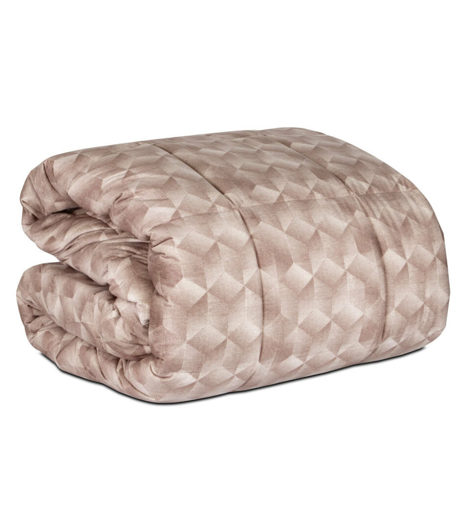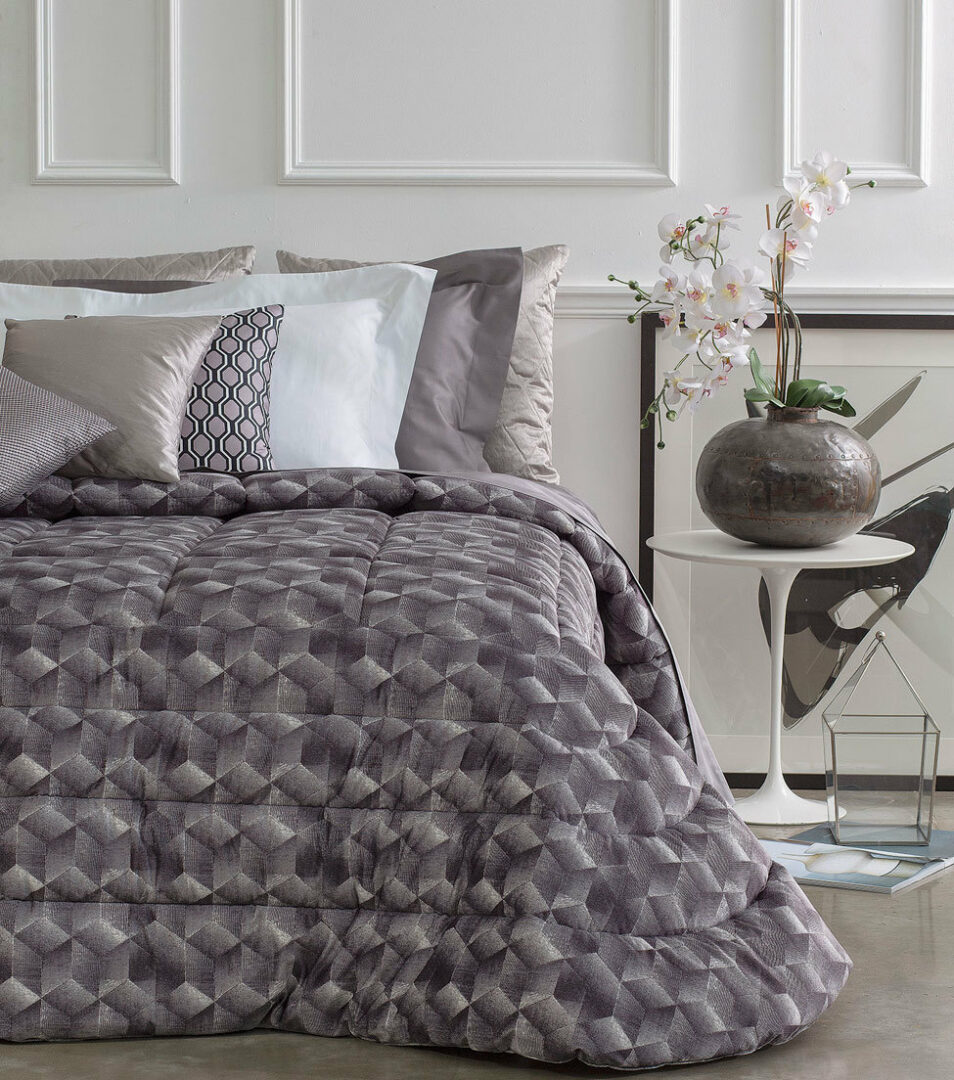 Calda e avvolgente trapunta matrimoniale in velluto stampato con tema geometrico.