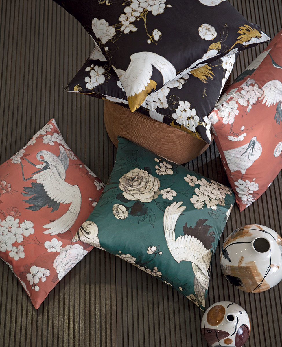 Trapunta matrimoniale in raso stampato con delicato motivo orientale su fondo colorato. Atmosfere Zen e fantasie Kimono per la tua camera da letto.